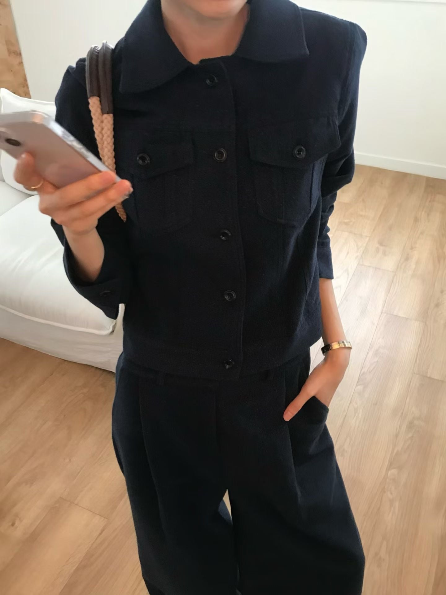 The top is cut as a short jacket, cleverly raising the waistline, visually slimming. Paired with a shirt collar and workwear pocket design, it exudes a retro casual vibe. The bottom features high-waisted wide pants with sharp pleats and a loose straight cut, providing excellent comfort and drape.