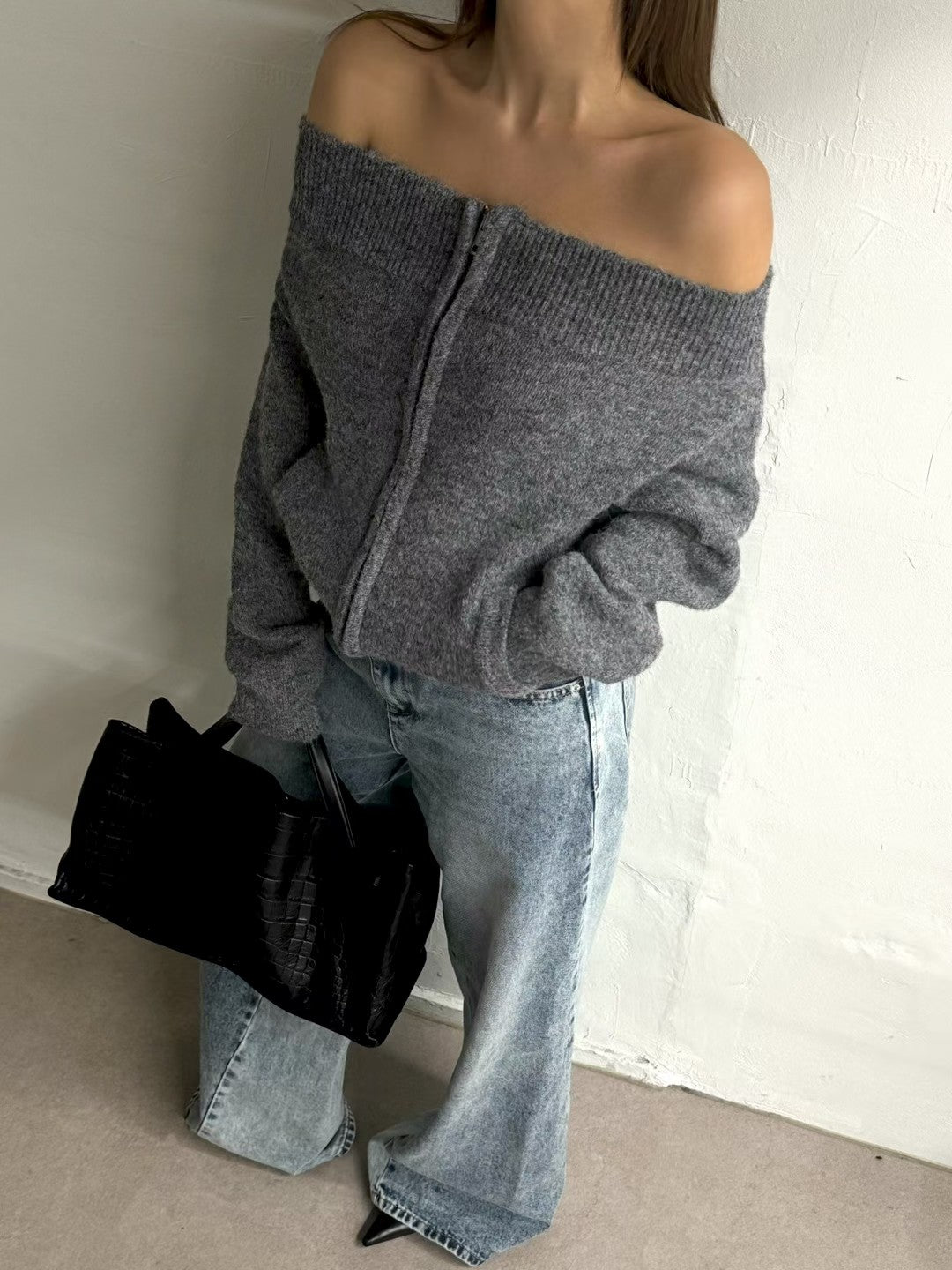 TP22086 - Korean French style wool blend off-shoulder loose long-sleeved sweater