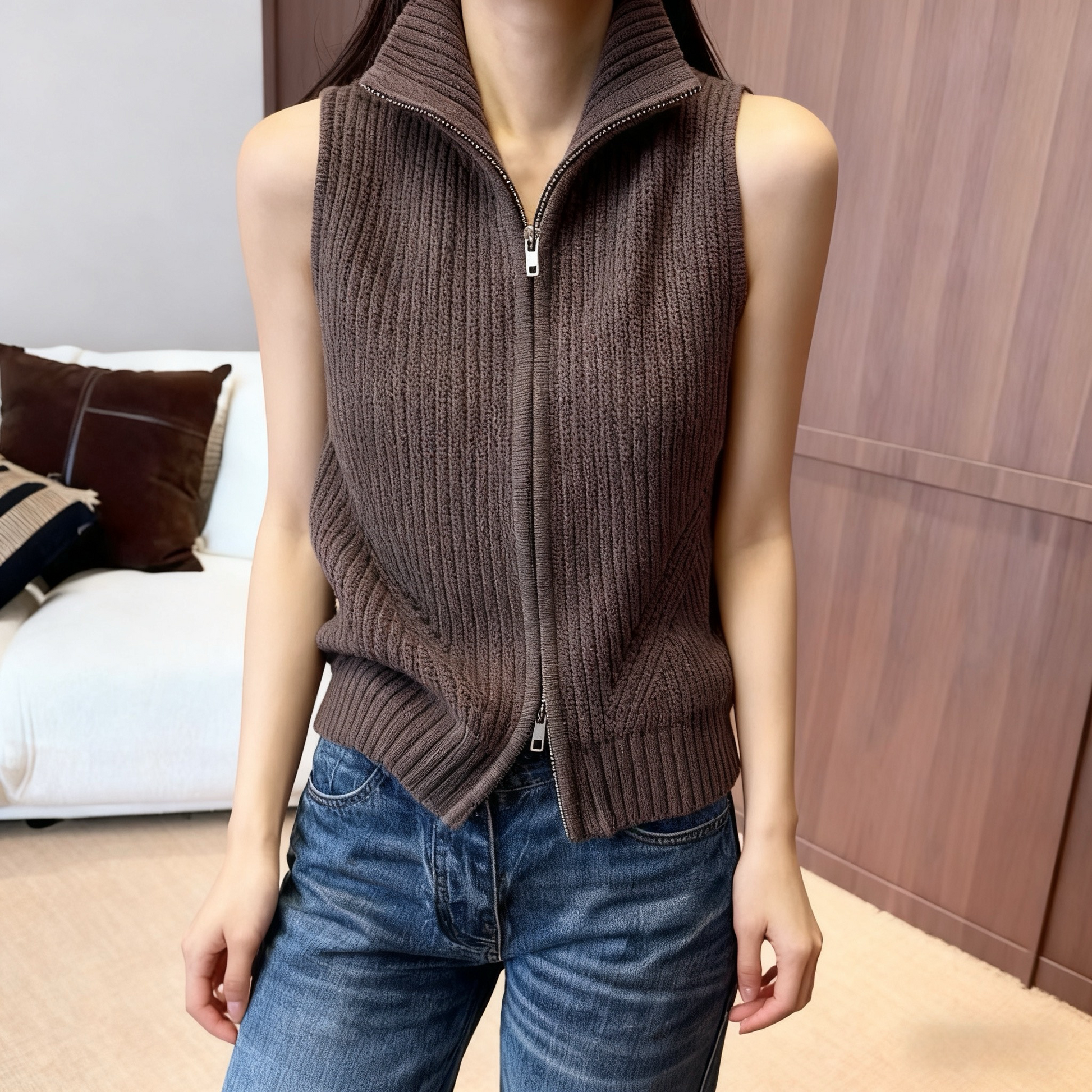 This commuting wool zip-up stand collar knitted vest is tailored for you who pursue minimalism and an intellectual temperament. It perfectly blends the warm texture of knitting with a sharp vest cut, effortlessly creating a professional yet stylish layered look.