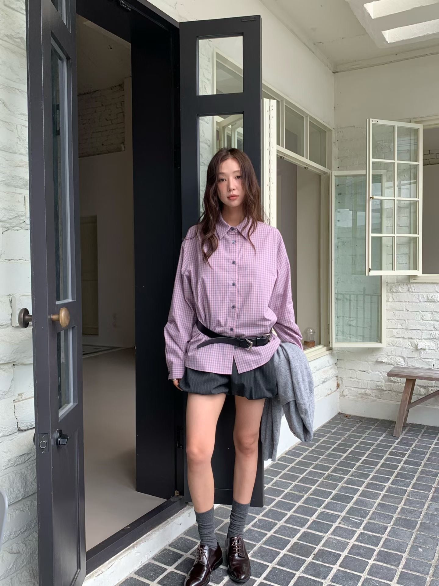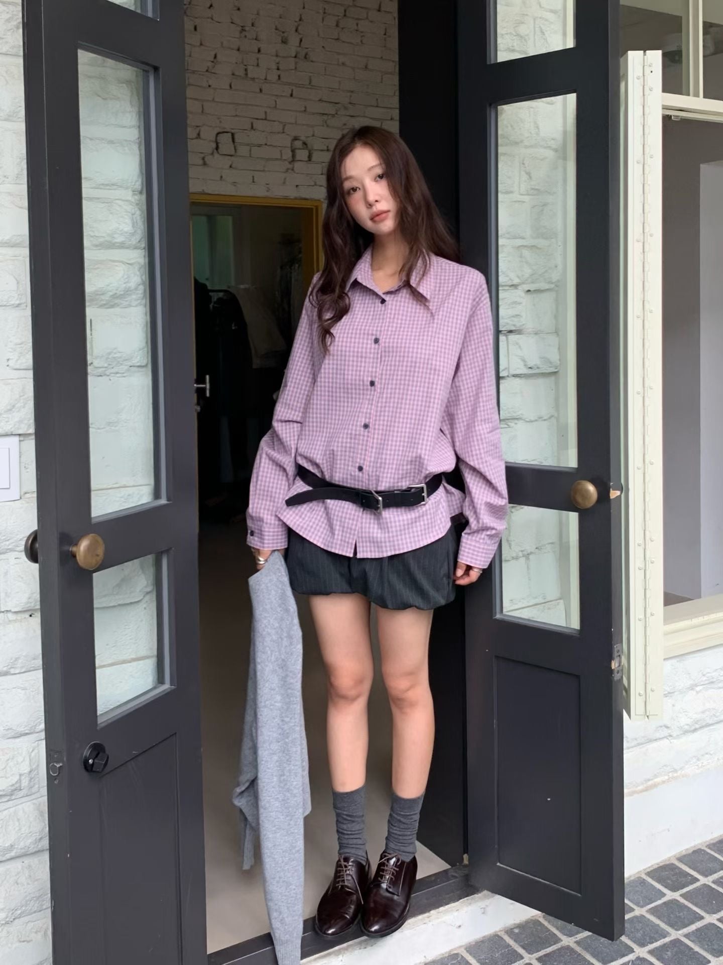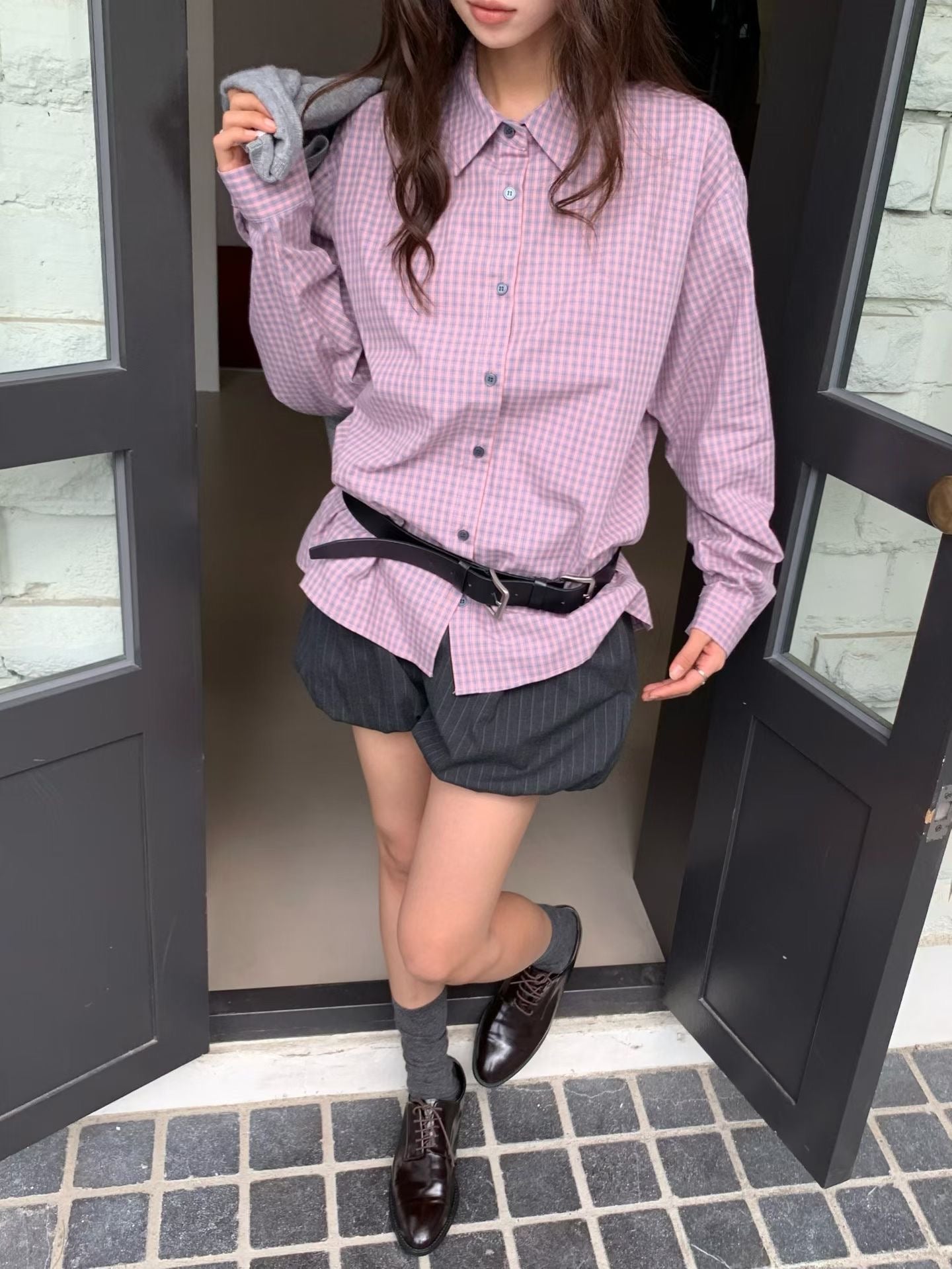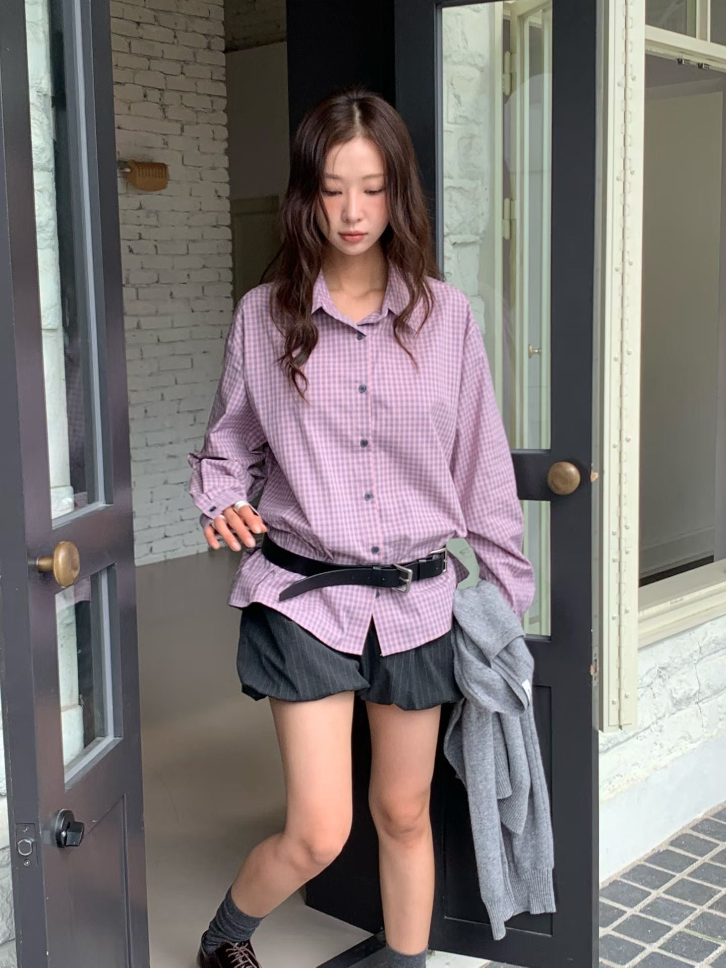 韓系校園風,寬鬆格紋休閒襯衫