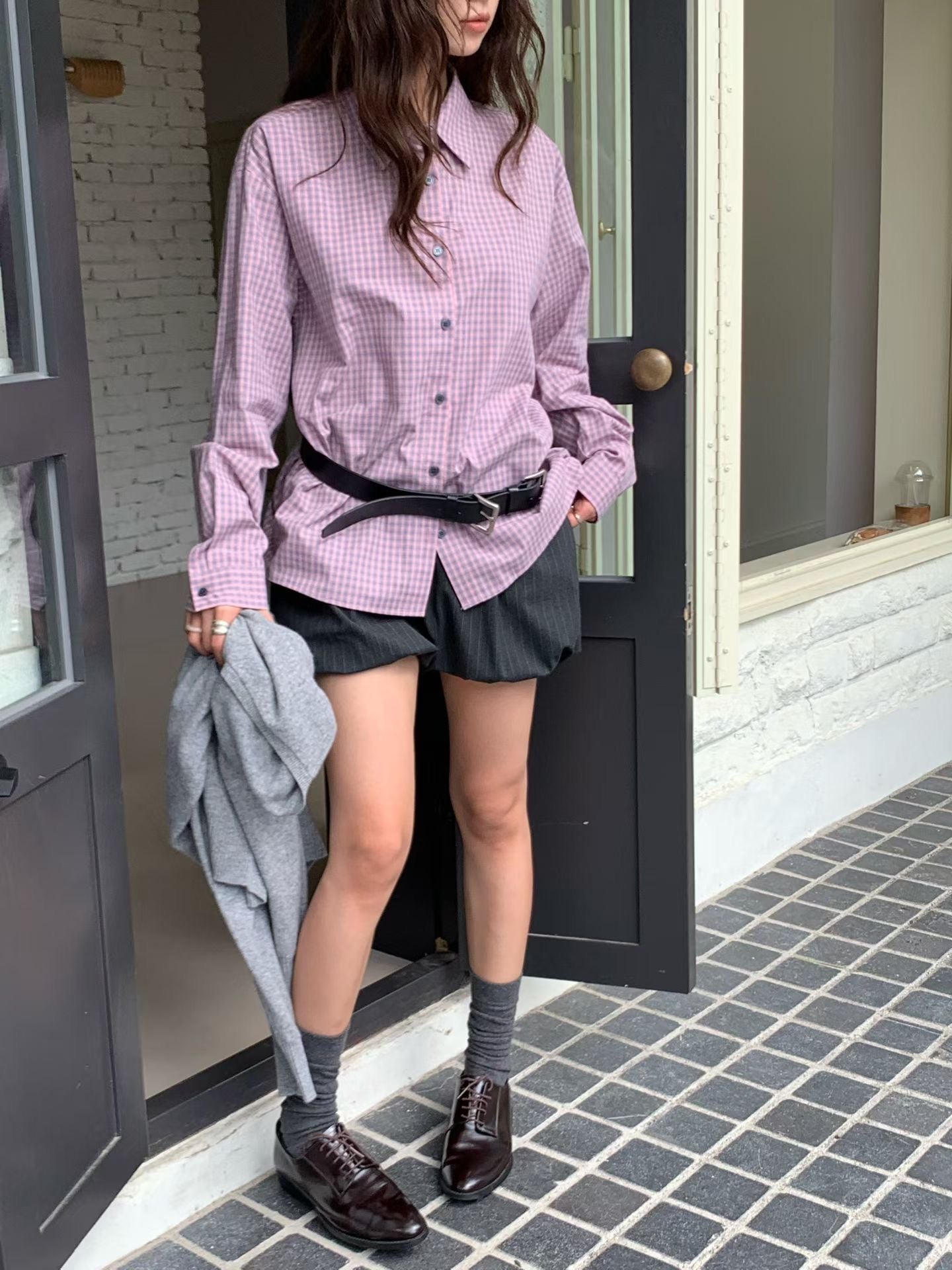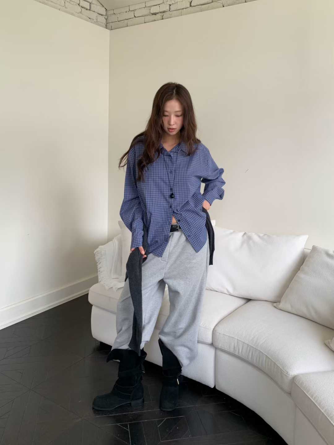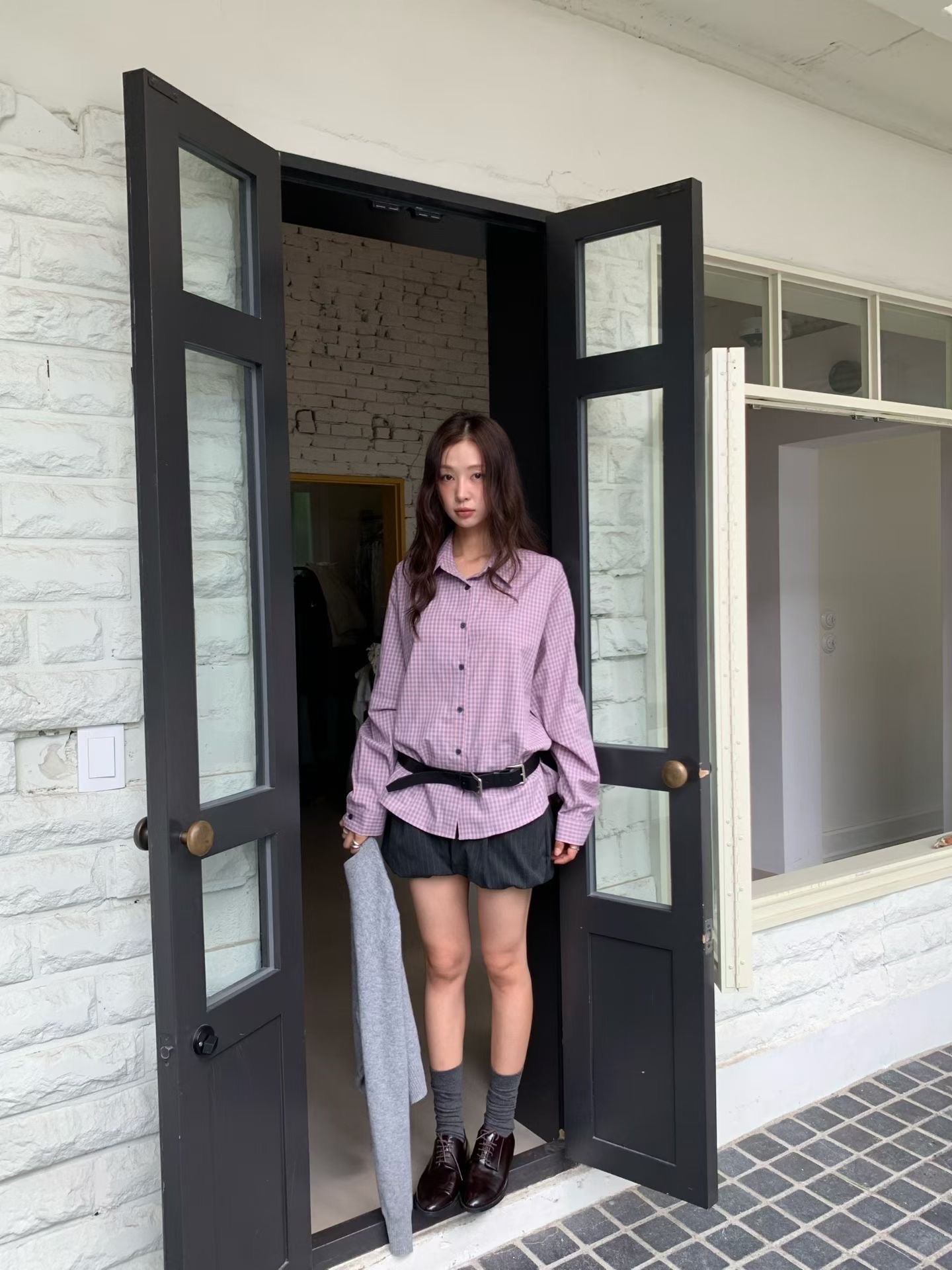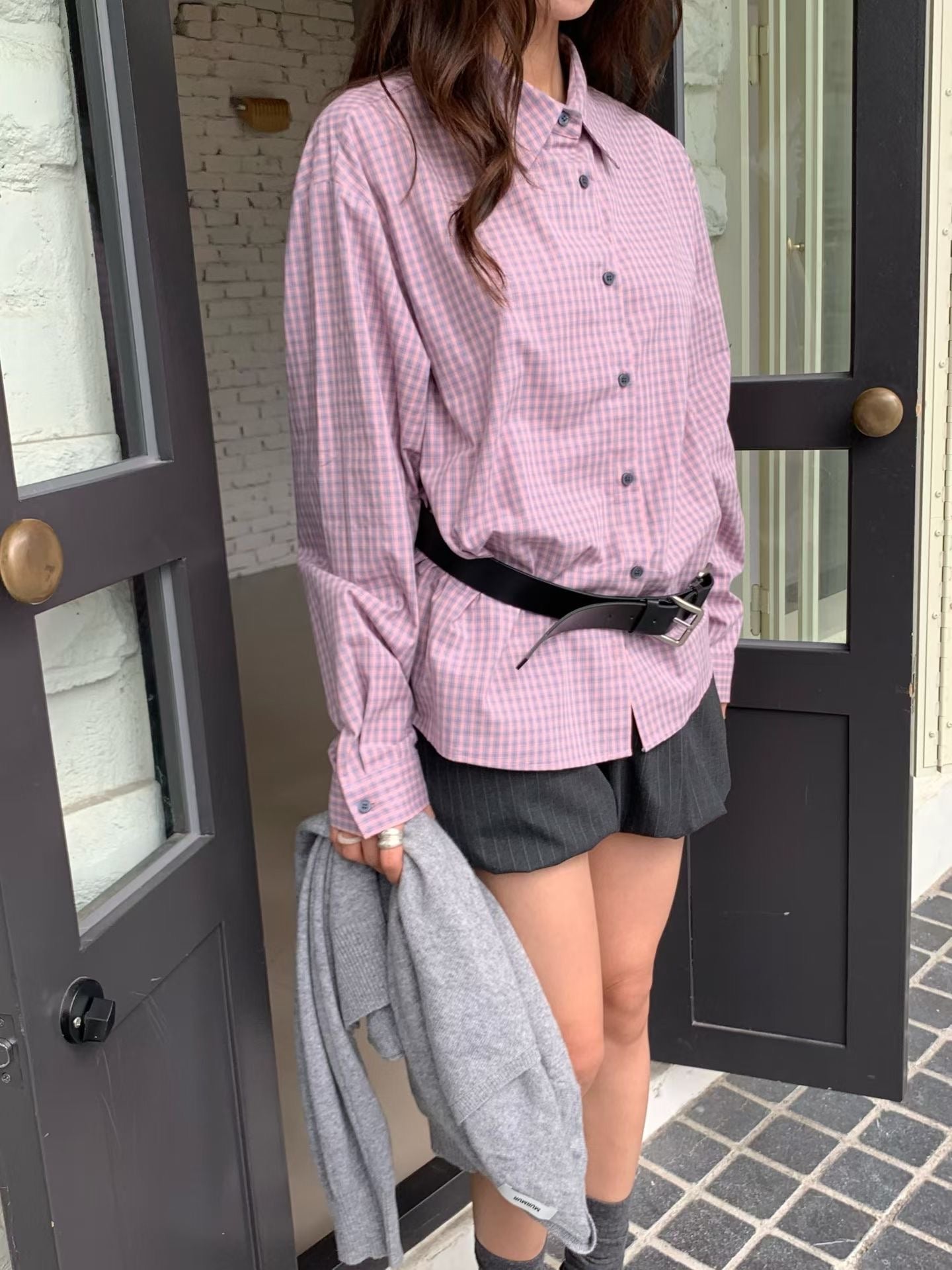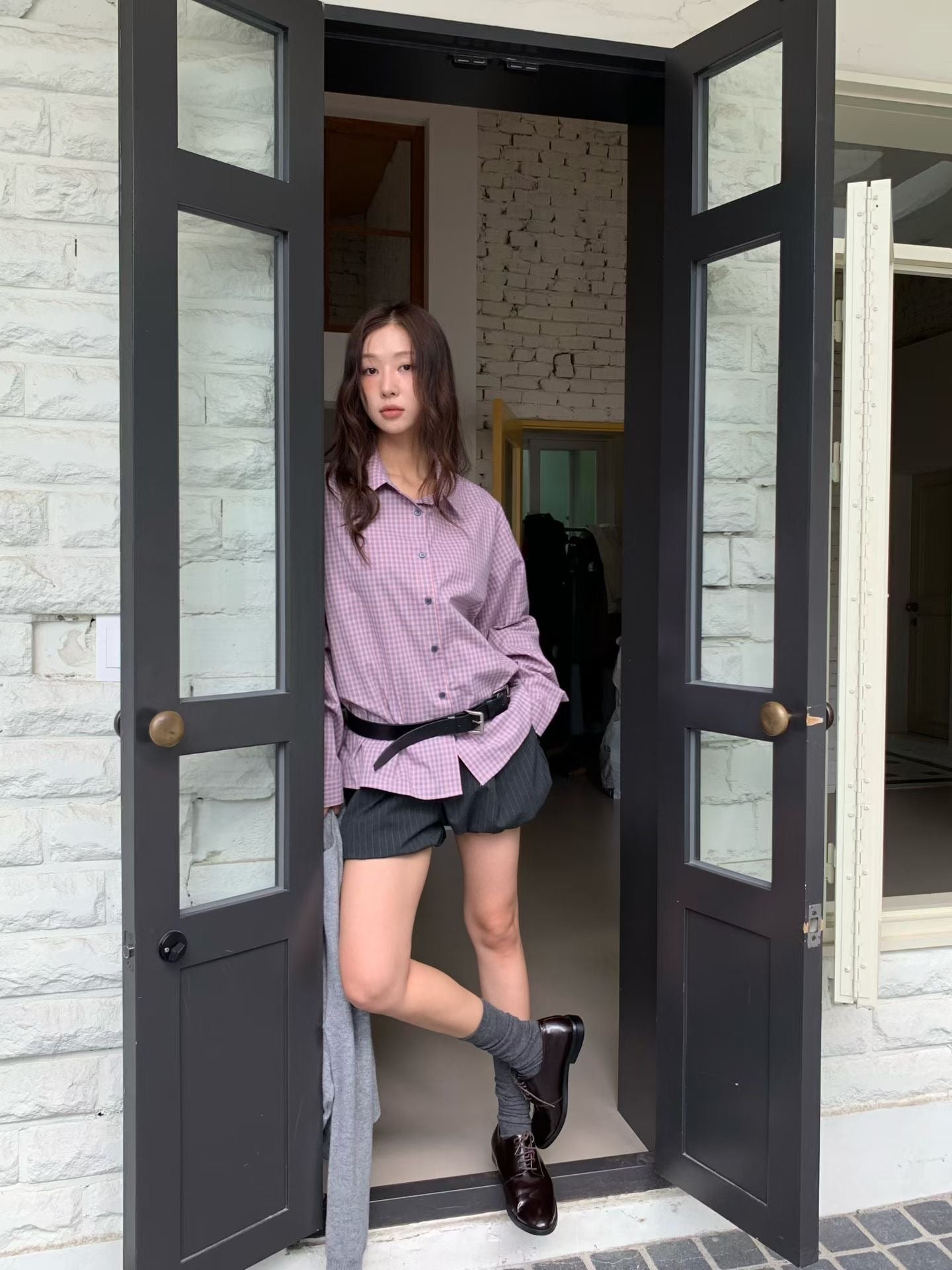韓系校園風,寬鬆格紋休閒襯衫