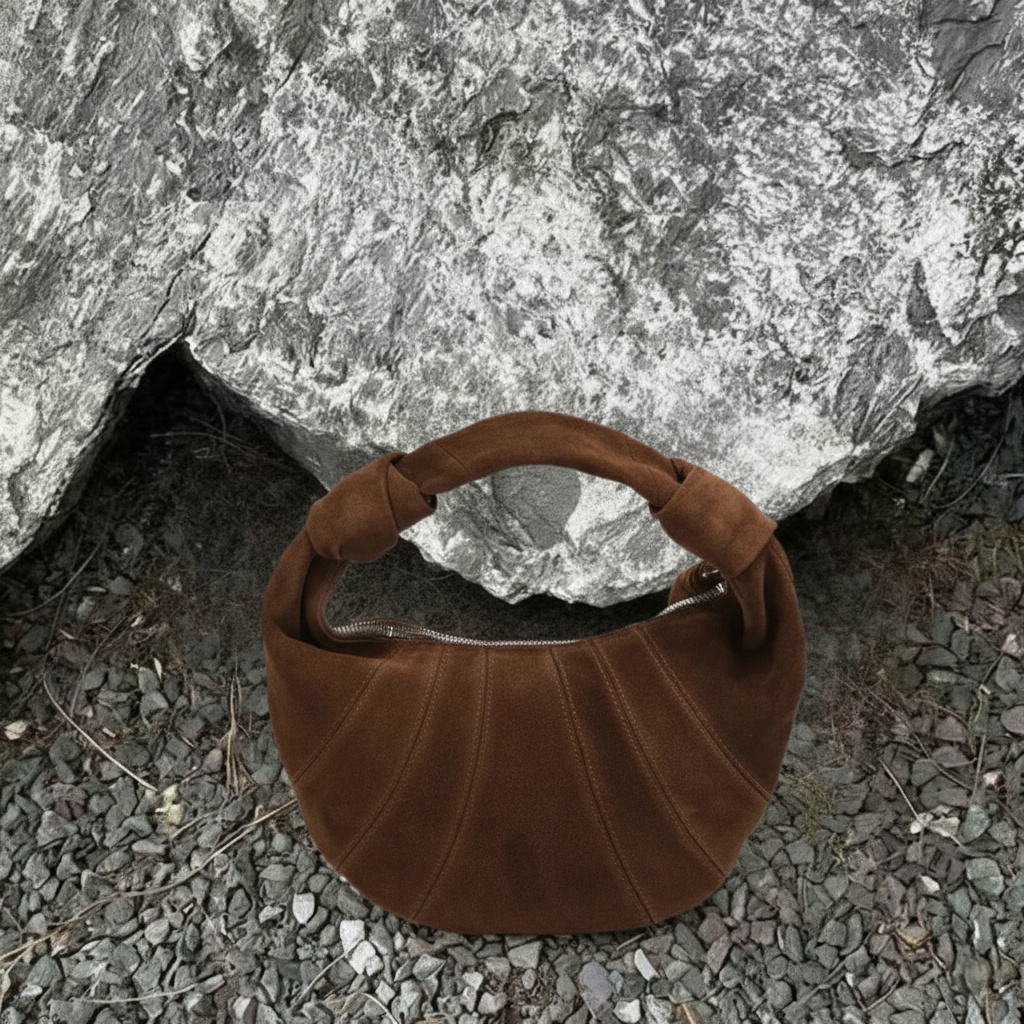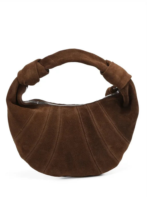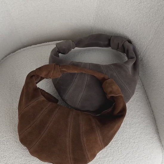 選用高質磨砂牛皮,觸感溫潤細膩,隨著使用將會展現獨一無二的皮革紋理與光澤,充滿故事感。包身獨特的弧形設計,搭配同材質的扭結提把,不僅提升了整體造型的柔和度,更在細節中流露不凡的品味。