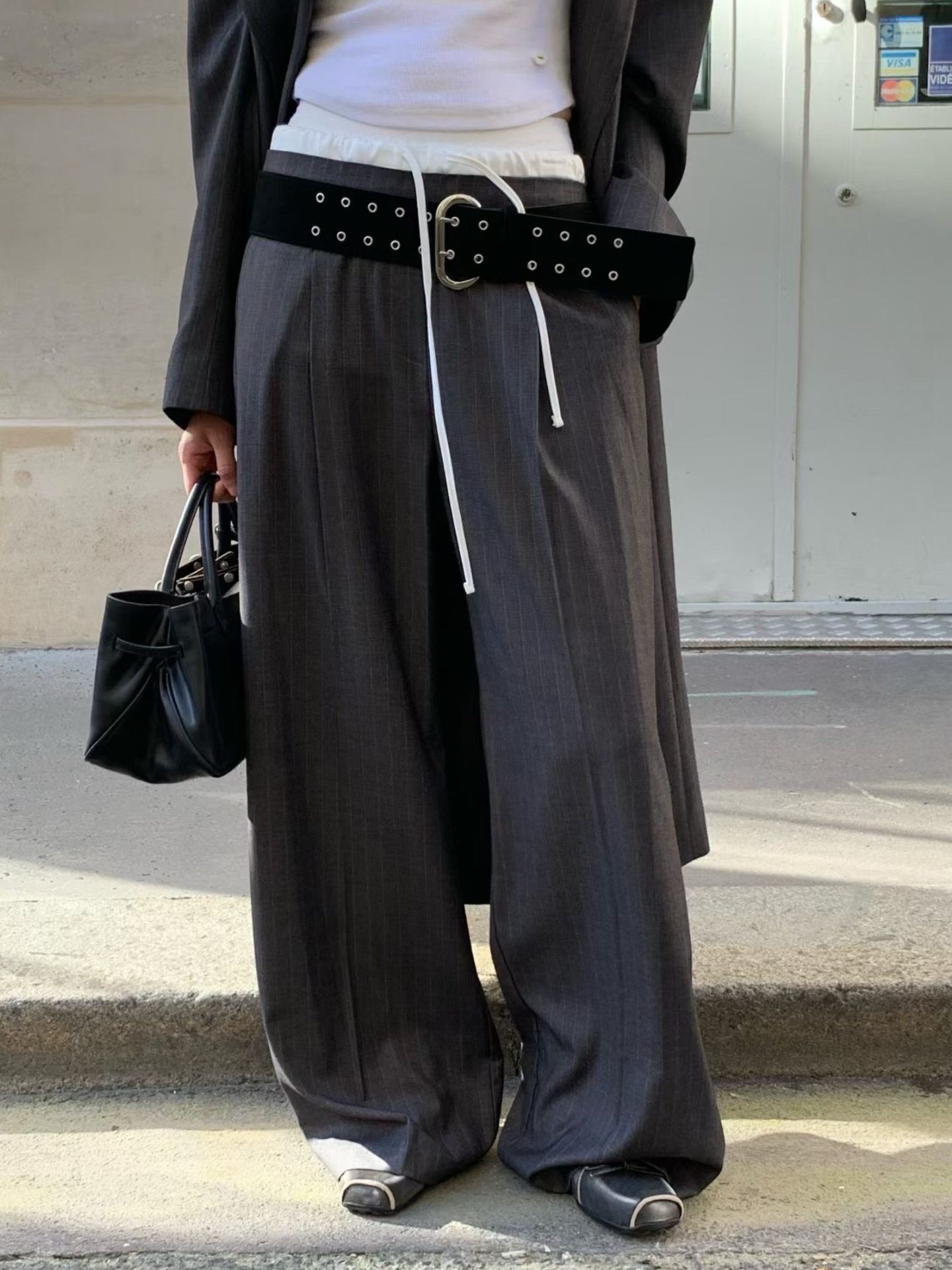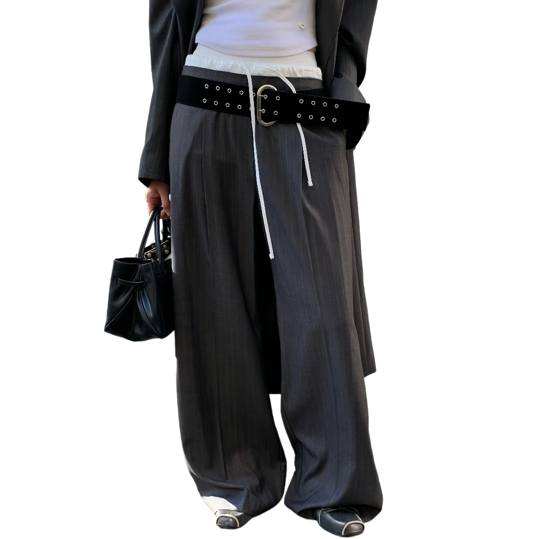 選用柔軟舒適的高級面料,並點綴上經典的細條紋,視覺上能有效拉長腿部線條,達到顯瘦效果。其獨特的拼接腰部設計,搭配可調節的白色繫帶,打破傳統西裝褲的單調,為整體注入一絲隨性與巧思,讓你看起來更加與眾不同。