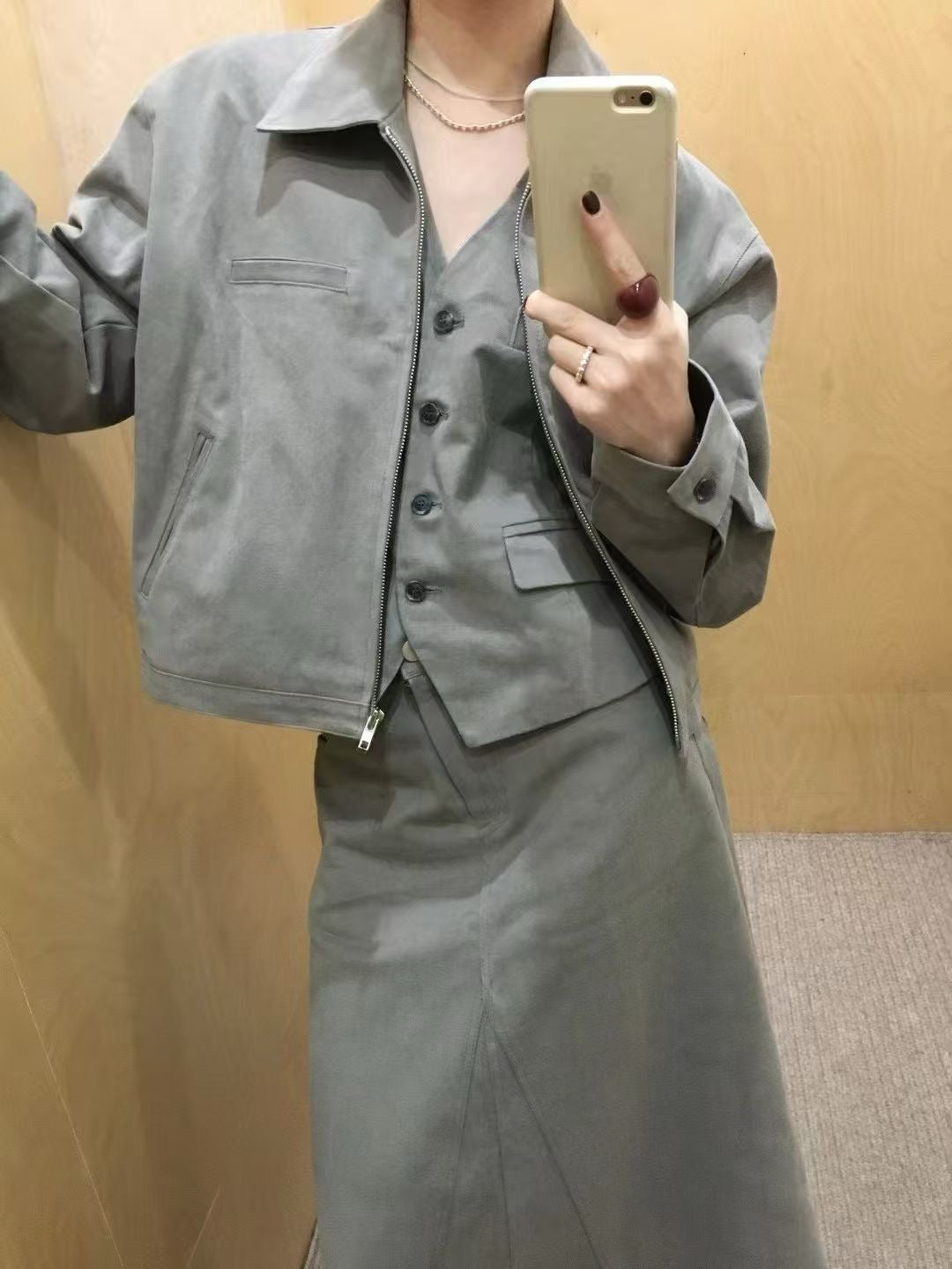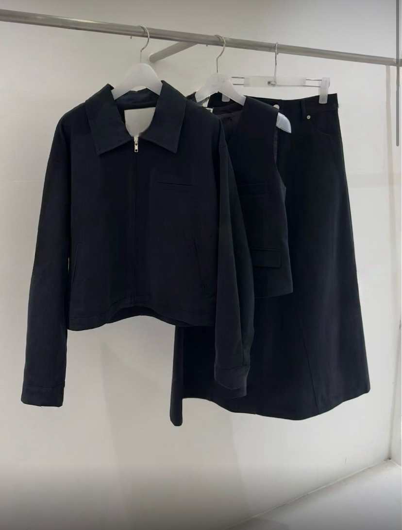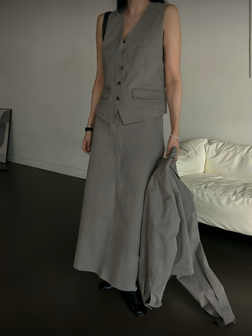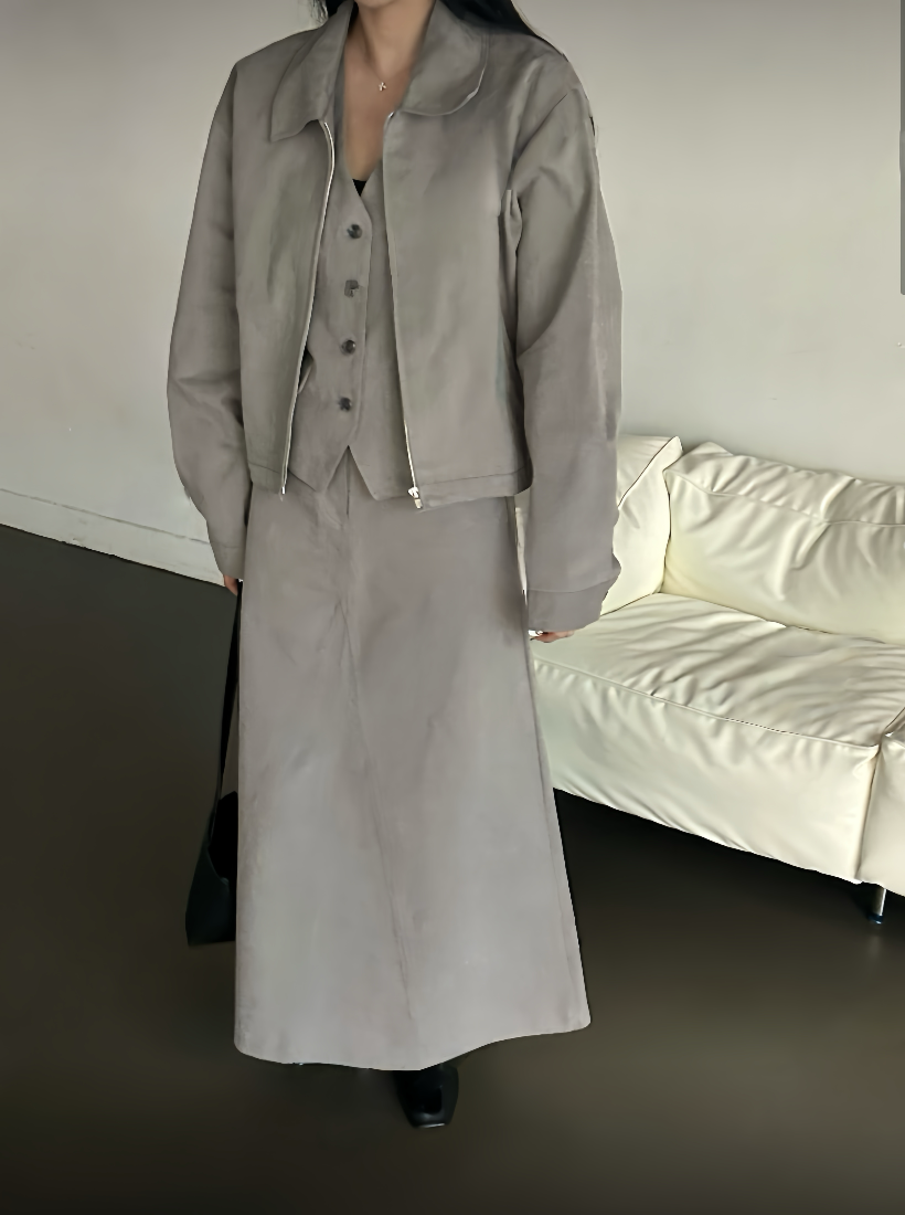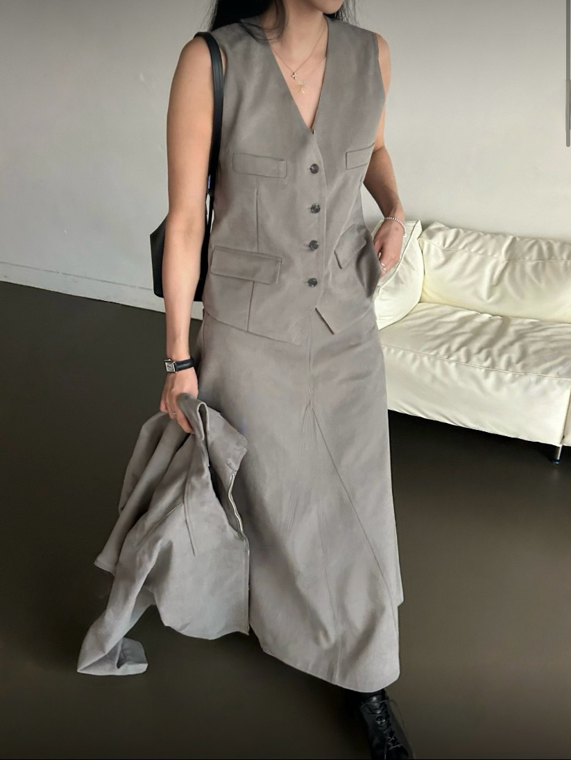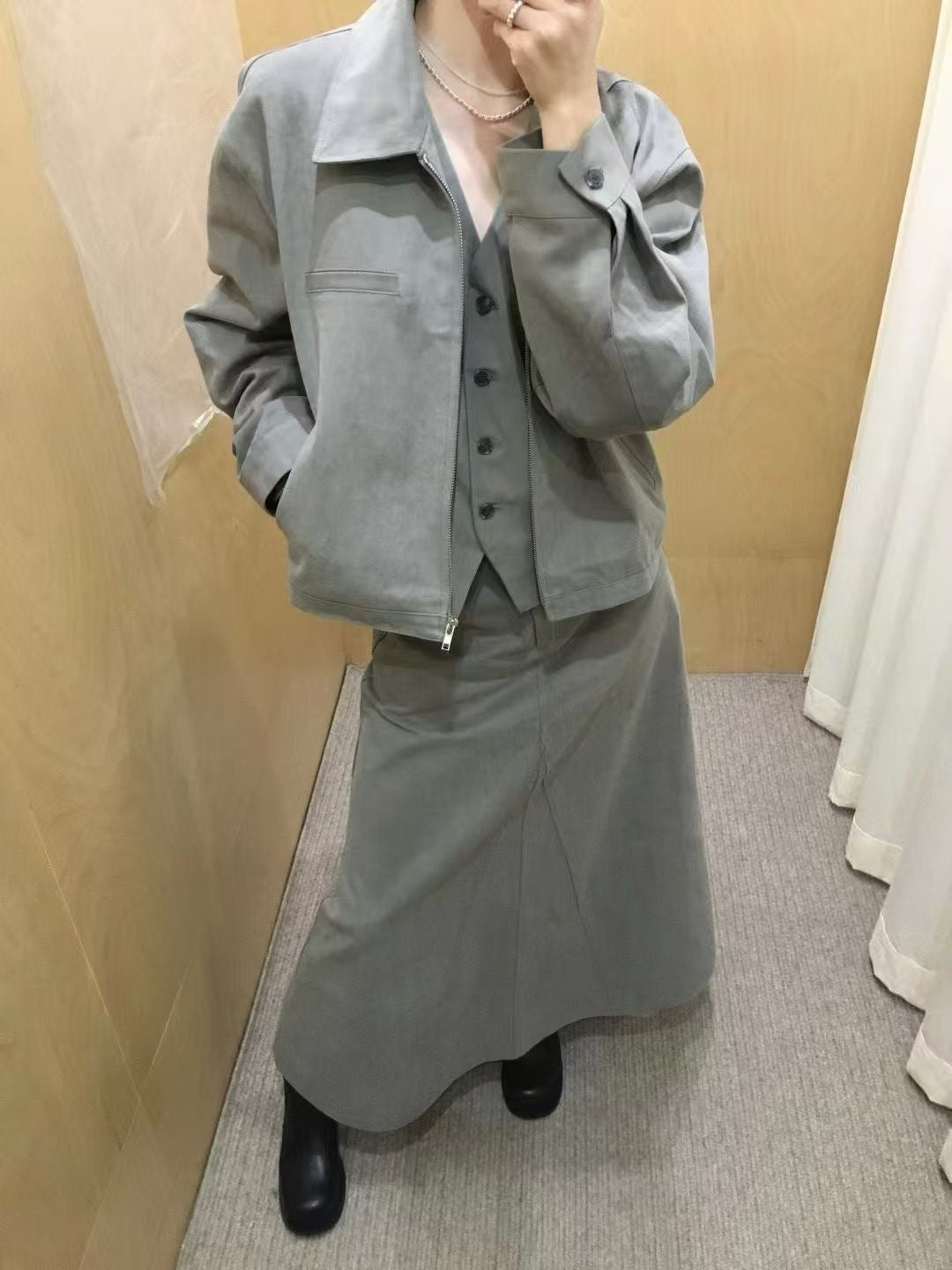三件單品皆採用高級細膩面料,挺括有型且垂墜感絕佳。短版夾克與修身馬甲的疊穿,巧妙地拉高腰線,視覺上極為顯瘦。長裙則以簡潔的A字剪裁修飾身形,優雅大氣。