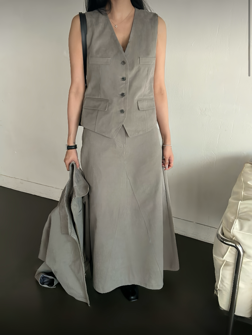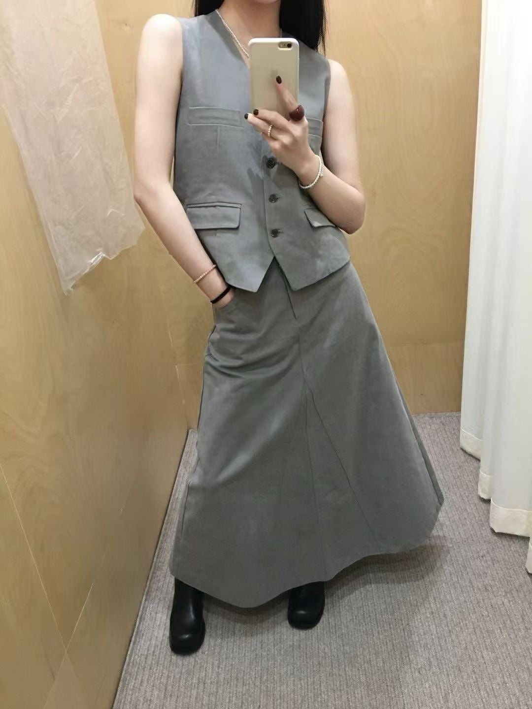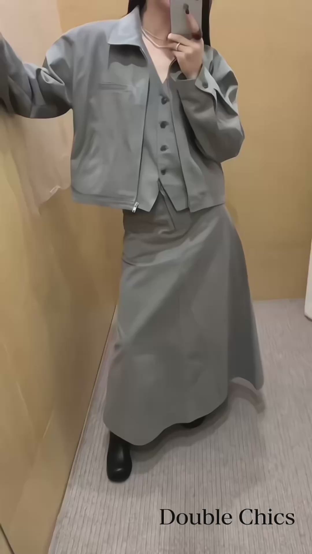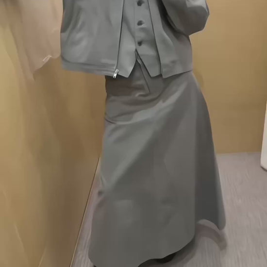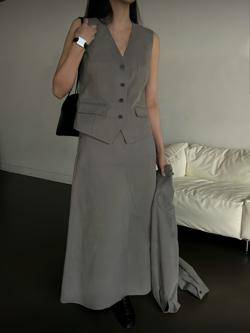 三件單品皆採用高級細膩面料,挺括有型且垂墜感絕佳。短版夾克與修身馬甲的疊穿,巧妙地拉高腰線,視覺上極為顯瘦。長裙則以簡潔的A字剪裁修飾身形,優雅大氣。