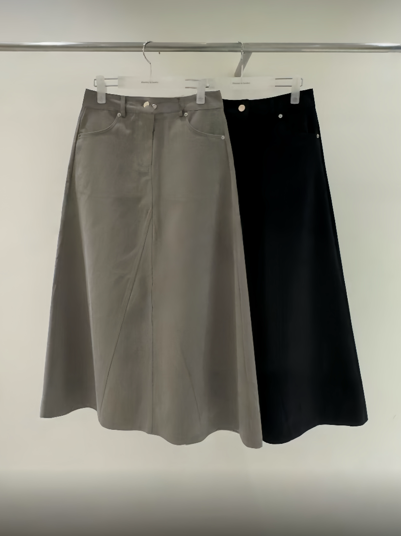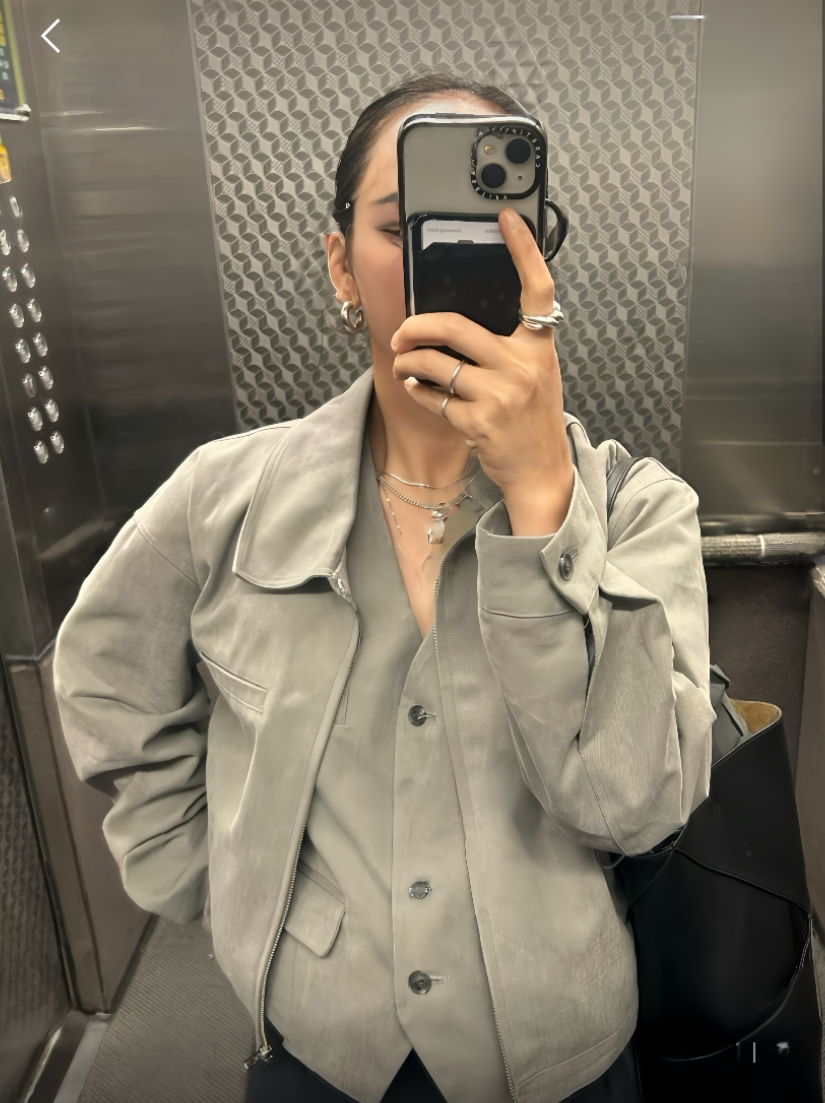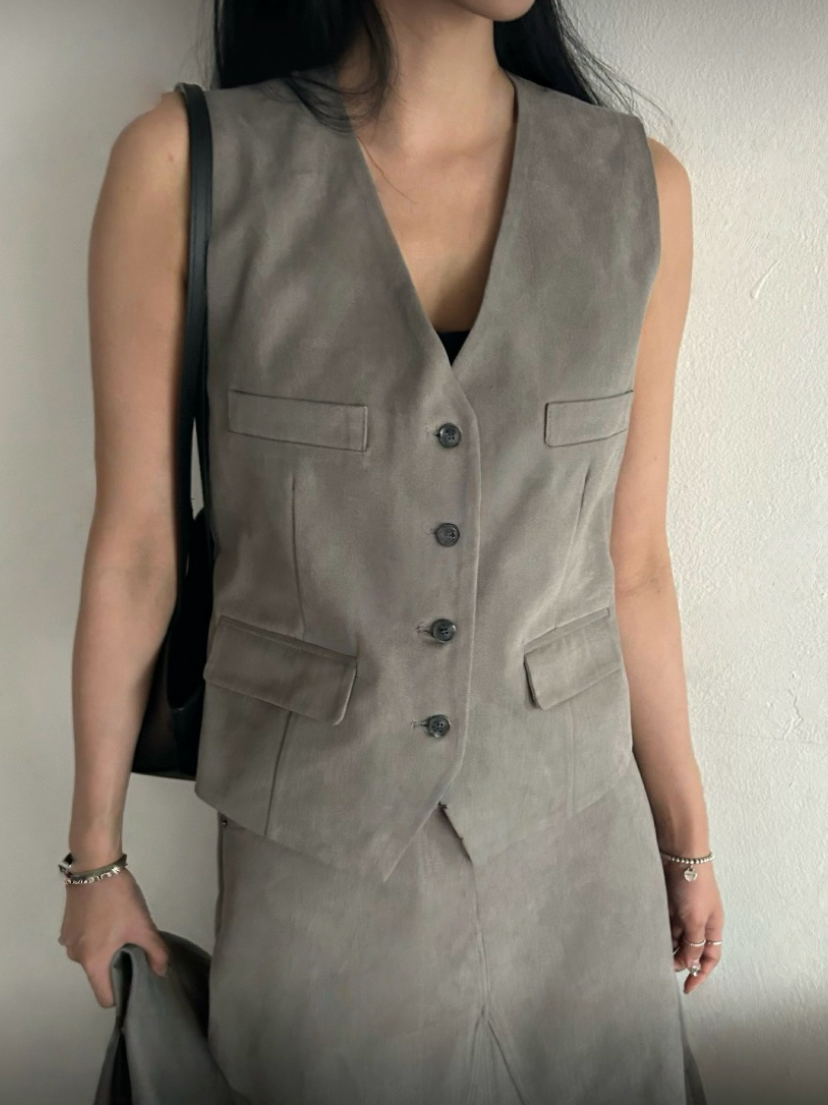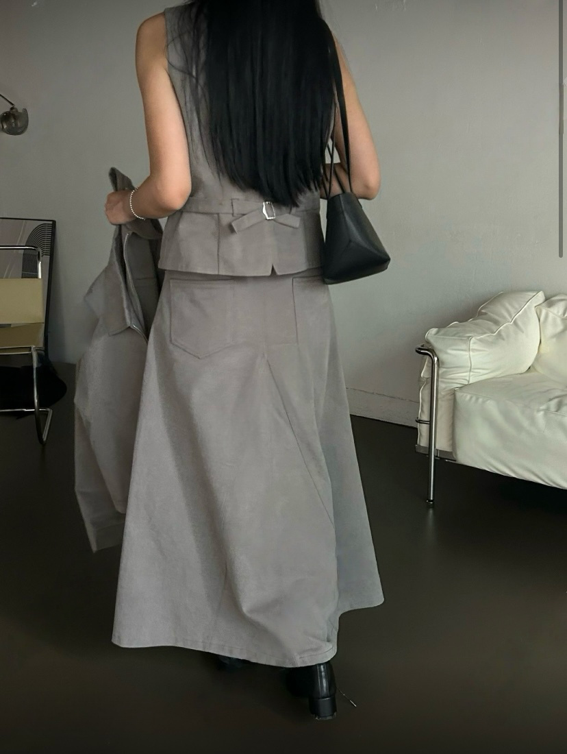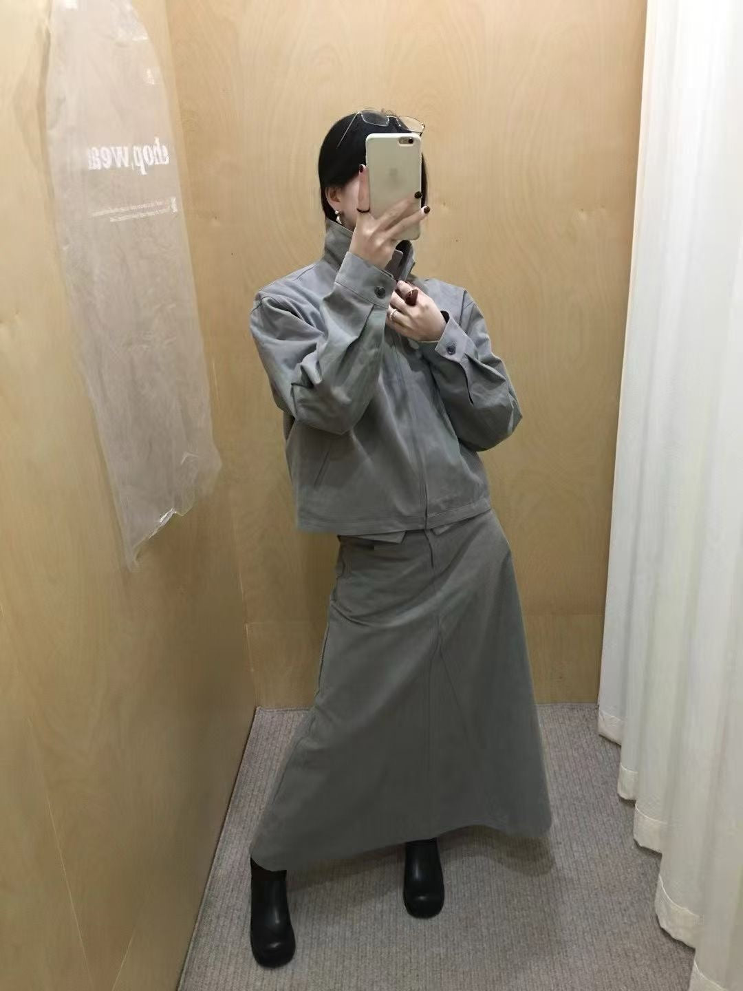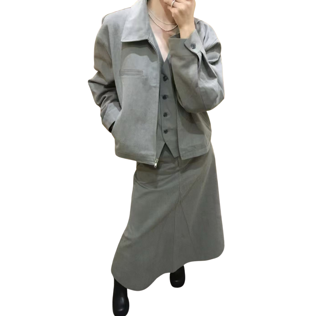 三件單品皆採用高級細膩面料,挺括有型且垂墜感絕佳。短版夾克與修身馬甲的疊穿,巧妙地拉高腰線,視覺上極為顯瘦。長裙則以簡潔的A字剪裁修飾身形,優雅大氣。