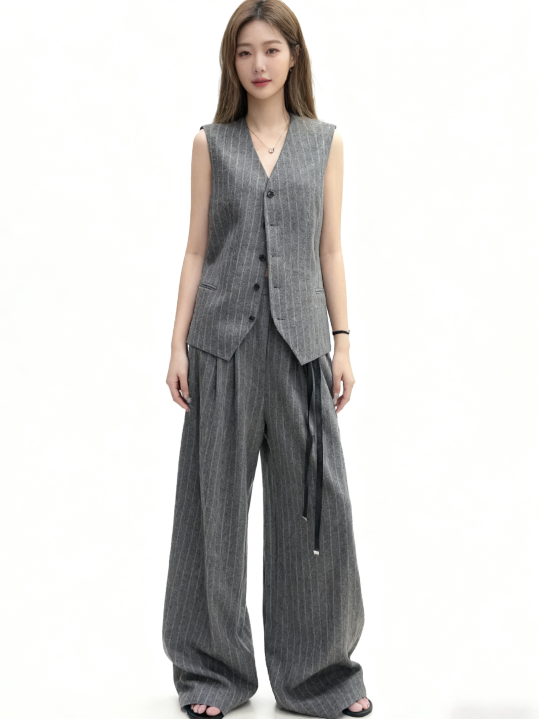 套裝包含:一件無領西裝外套、一件修身V領馬甲、以及一條高腰闊腿西裝褲。面料挺括有型,垂墜感絕佳,細膩的直條紋設計,從視覺上極大化拉長身形,達成驚人的顯瘦效果。