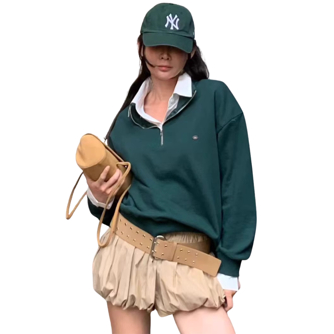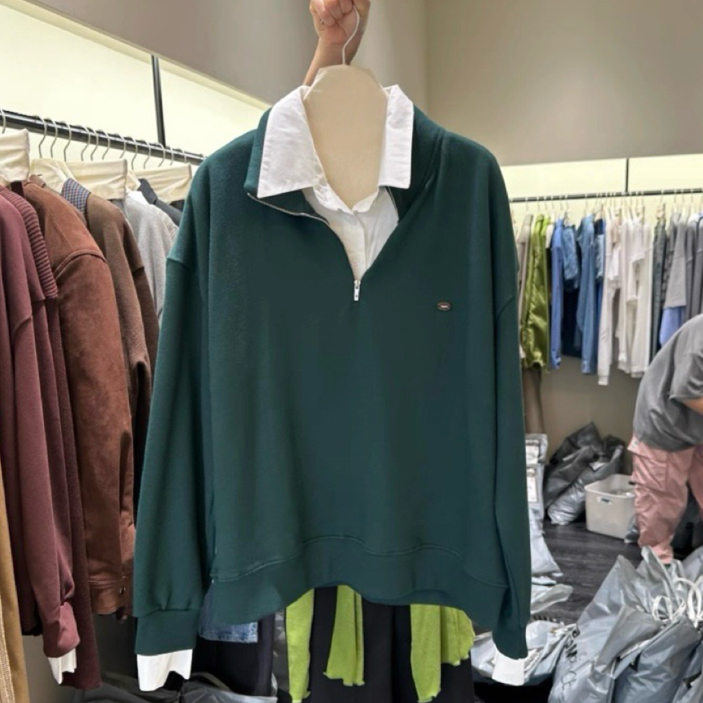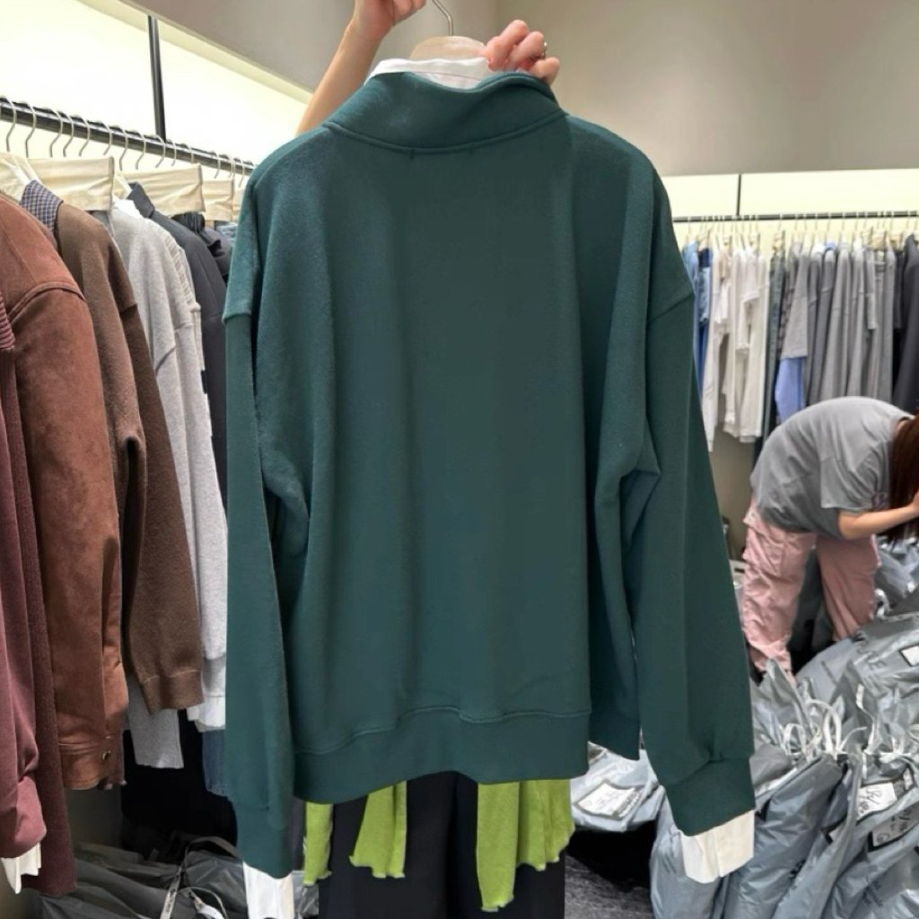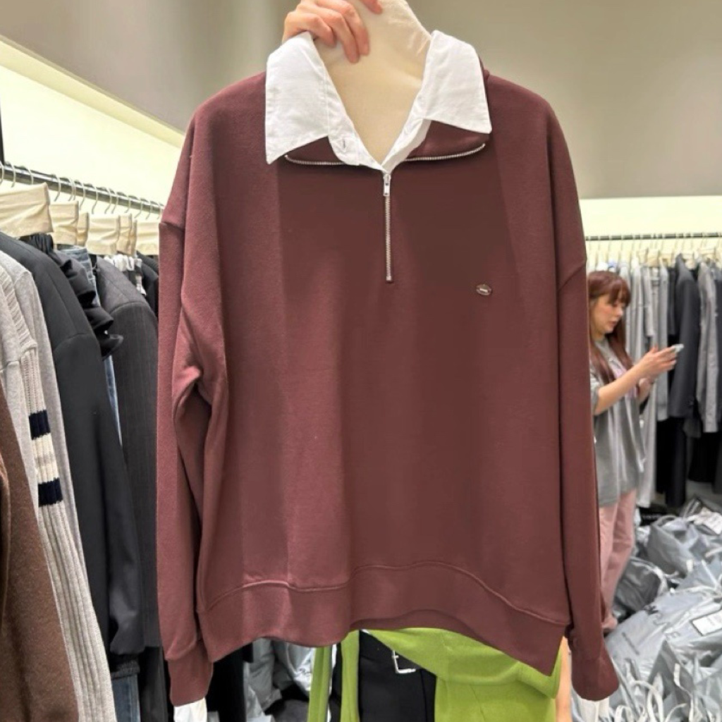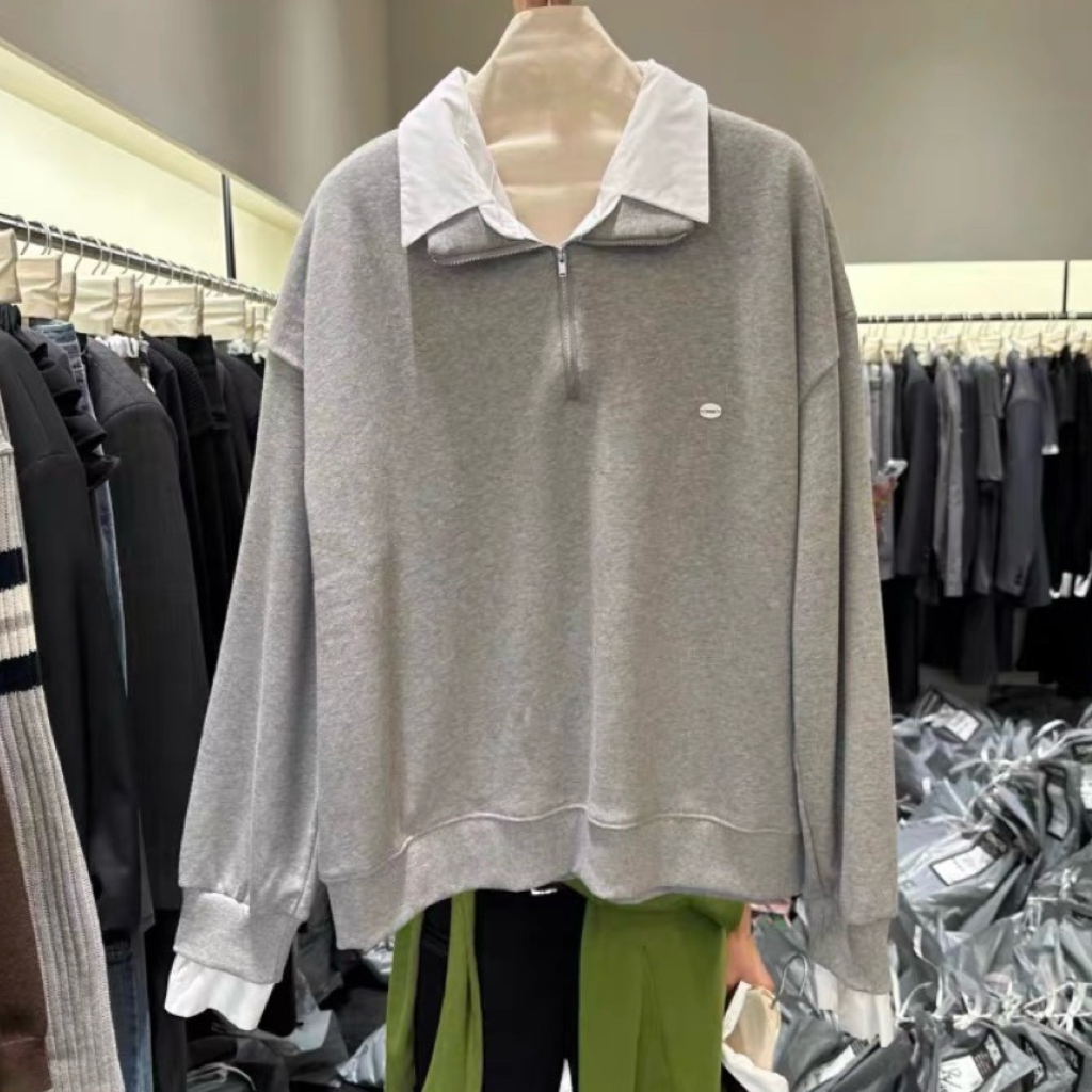 其獨特的假兩件式設計,將衛衣與白色襯衫領、袖口完美結合,讓你輕鬆穿出層次感,同時避免了繁瑣的疊穿。半拉鍊翻領的設計,既可拉上展現俐落,也可拉開呈現隨性,為整體造型注入巧思與百變風格。