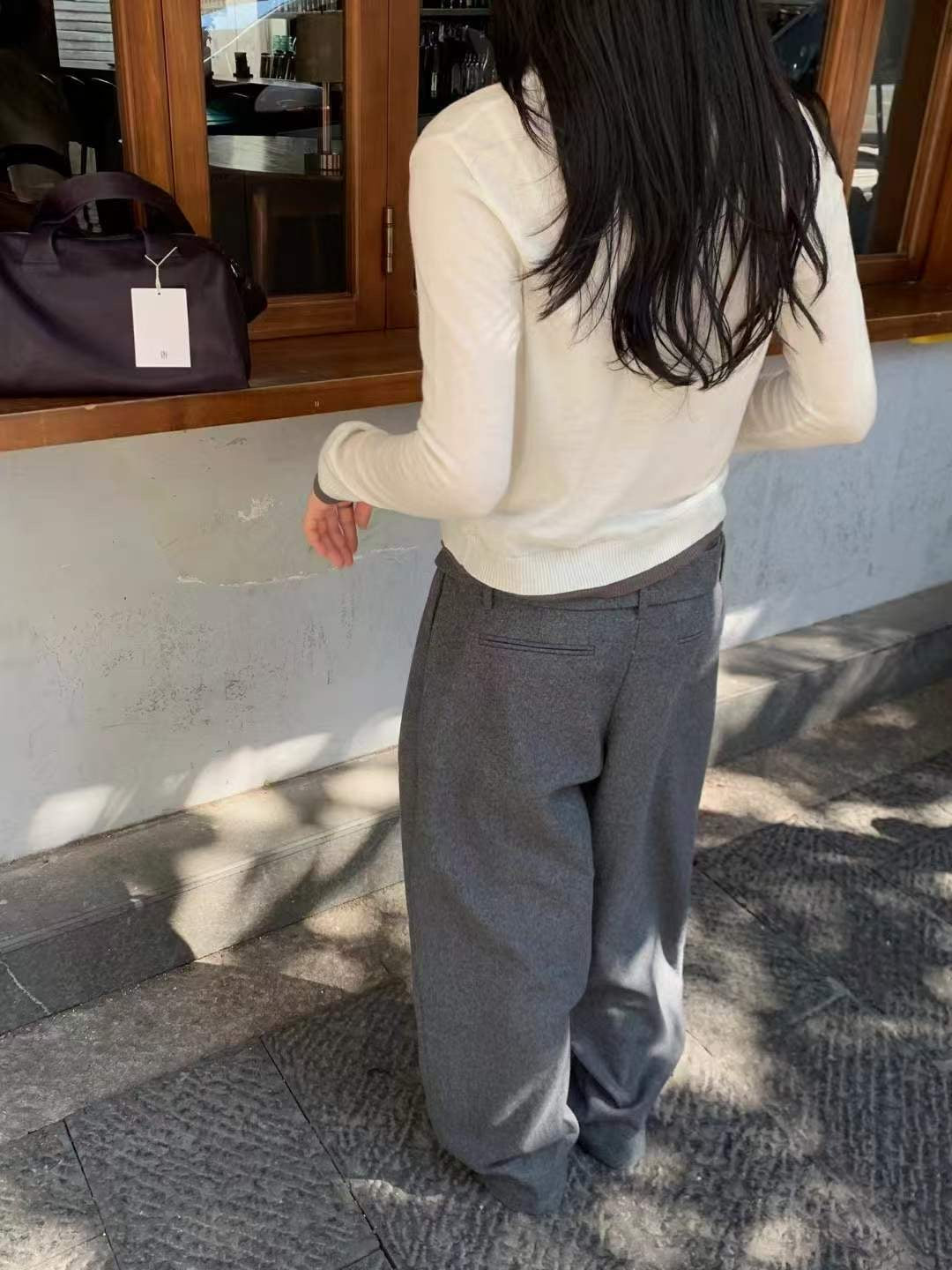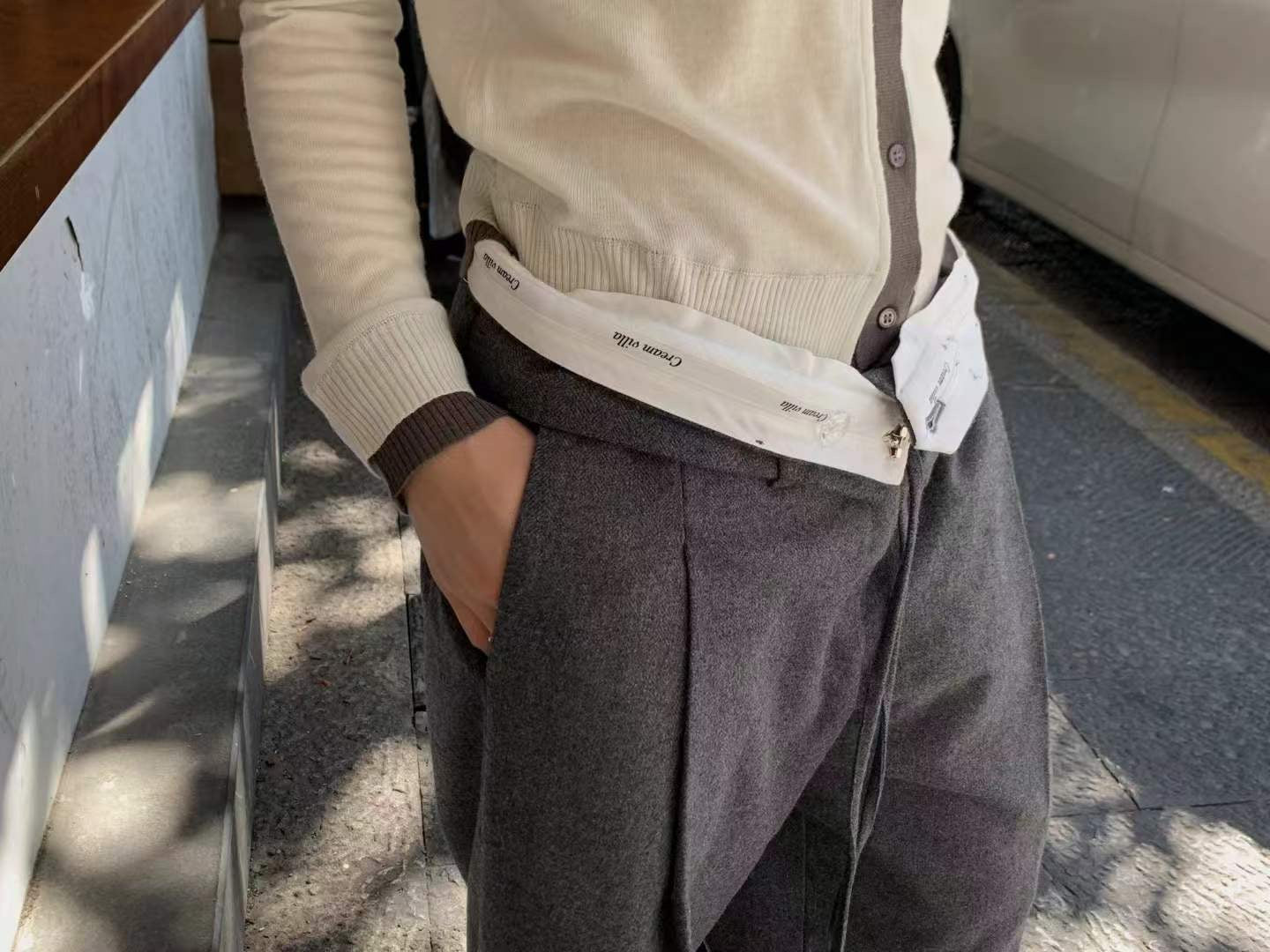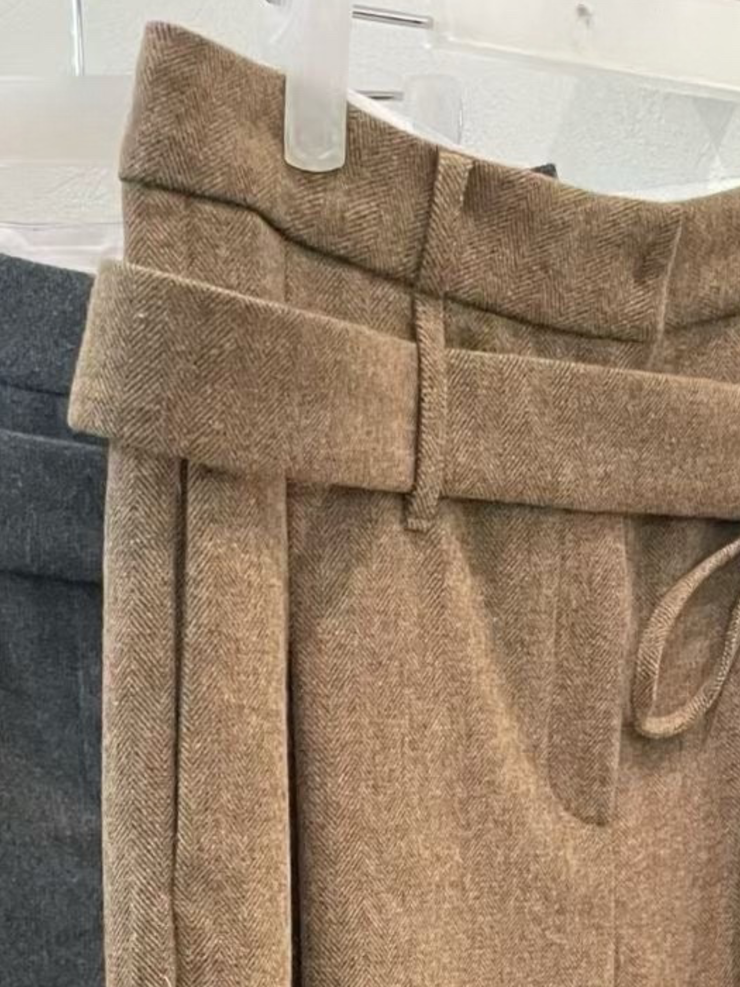 質感與保暖: 褲子採用高級羊毛混紡面料,觸感豐厚軟糯,提供絕佳的保暖性,是秋冬季節的首選。面料自帶的細膩紋理,充滿復古的高級氛圍。