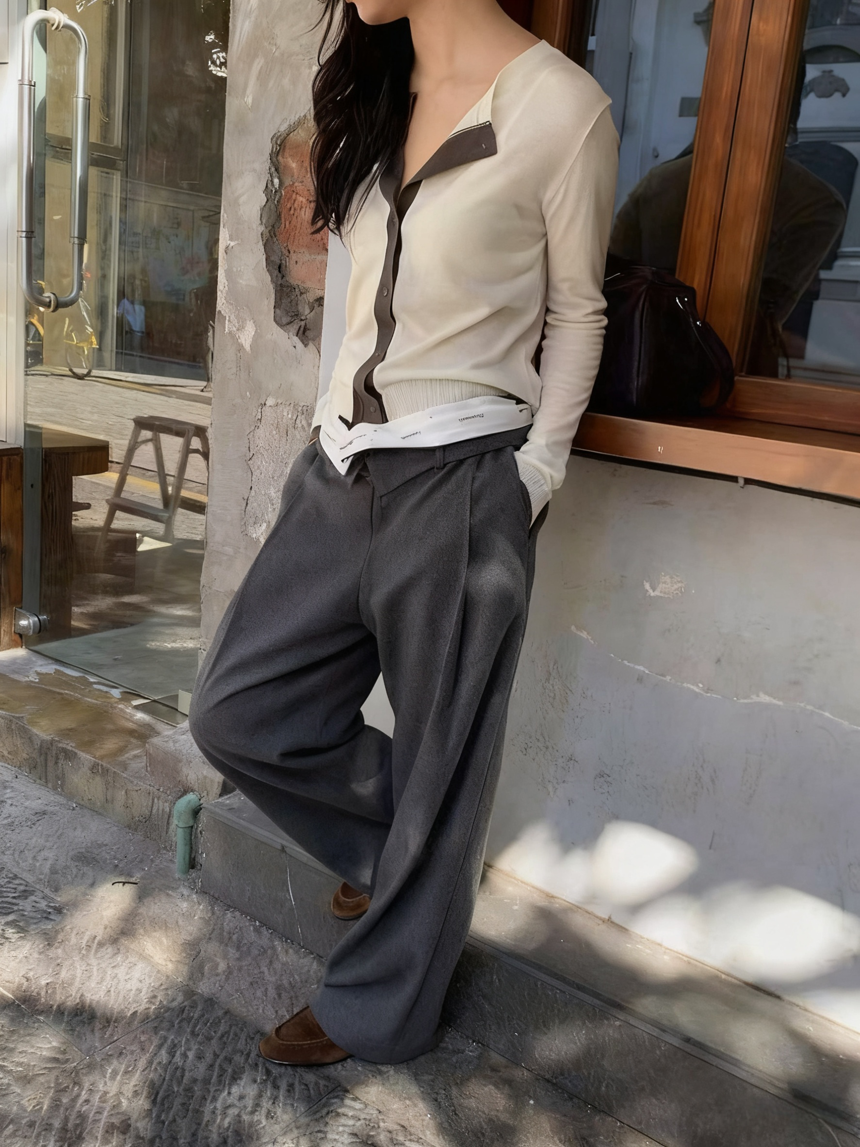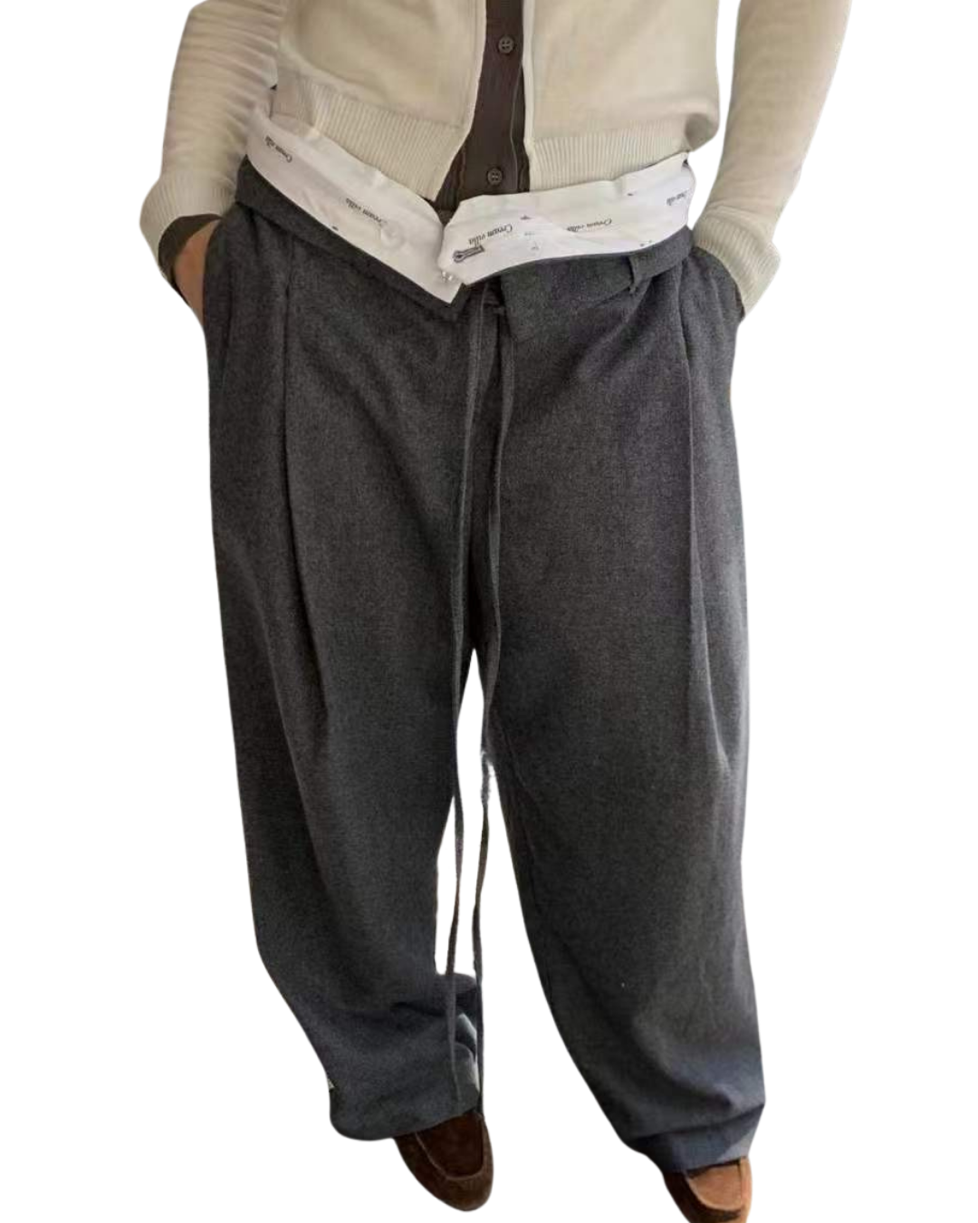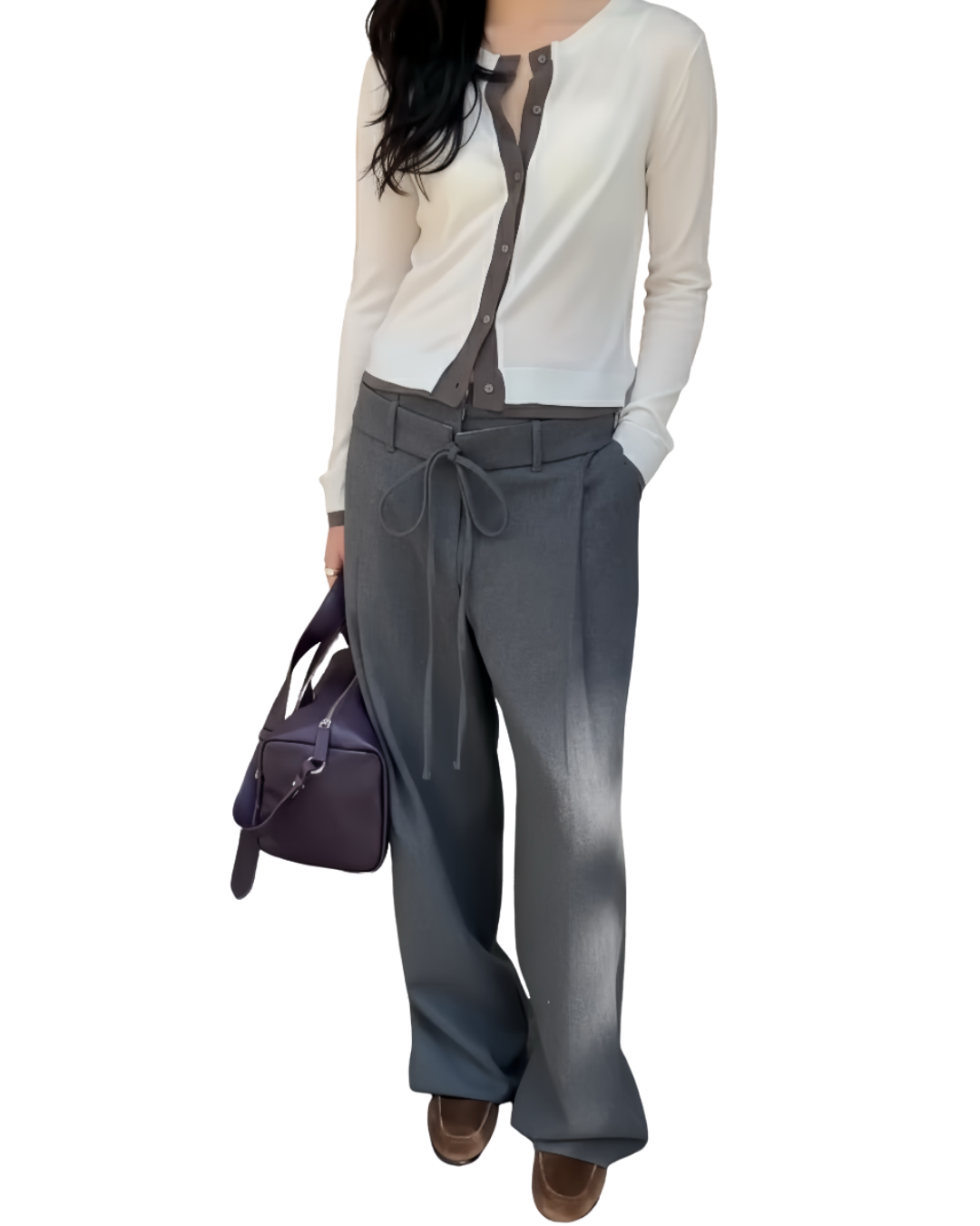 獨家設計: 褲子最大的亮點在於加寬的高腰腰頭設計,搭配可調節的長繫帶。繫帶可隨意打結或自然垂墜,打破傳統西裝褲的單調,充滿設計巧思。寬鬆的闊腿剪裁與俐落的打褶細節,不僅能有效修飾腿部比例,更在行走間展現出優雅的垂墜感。