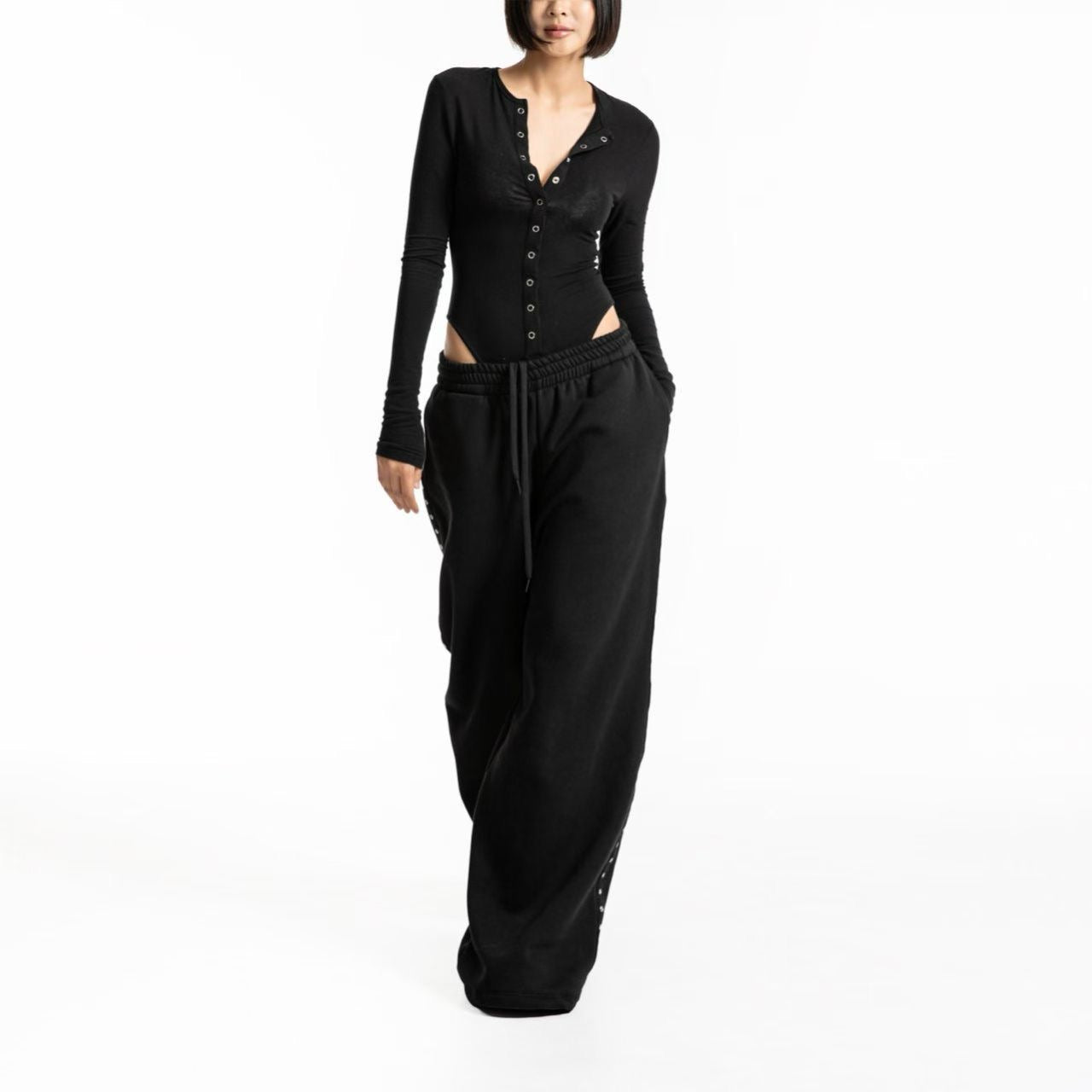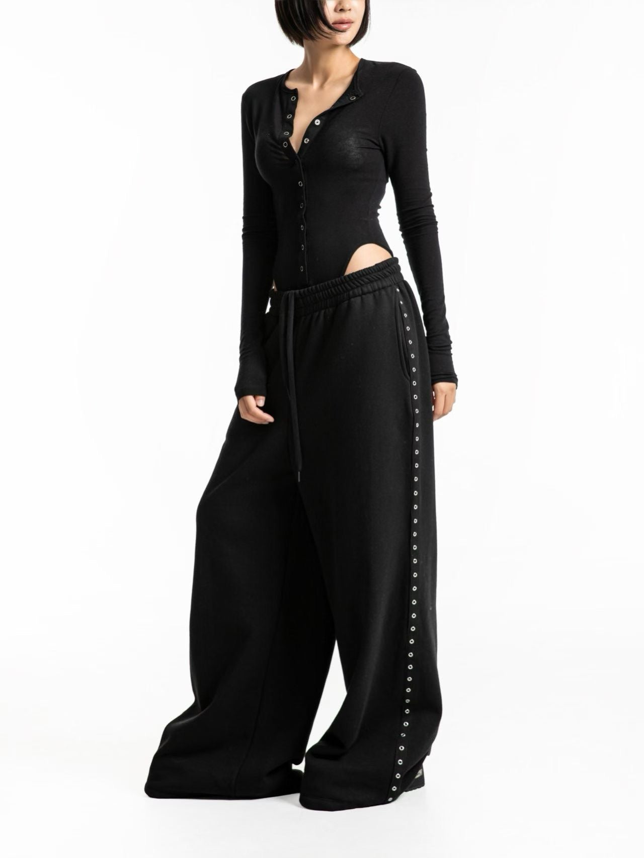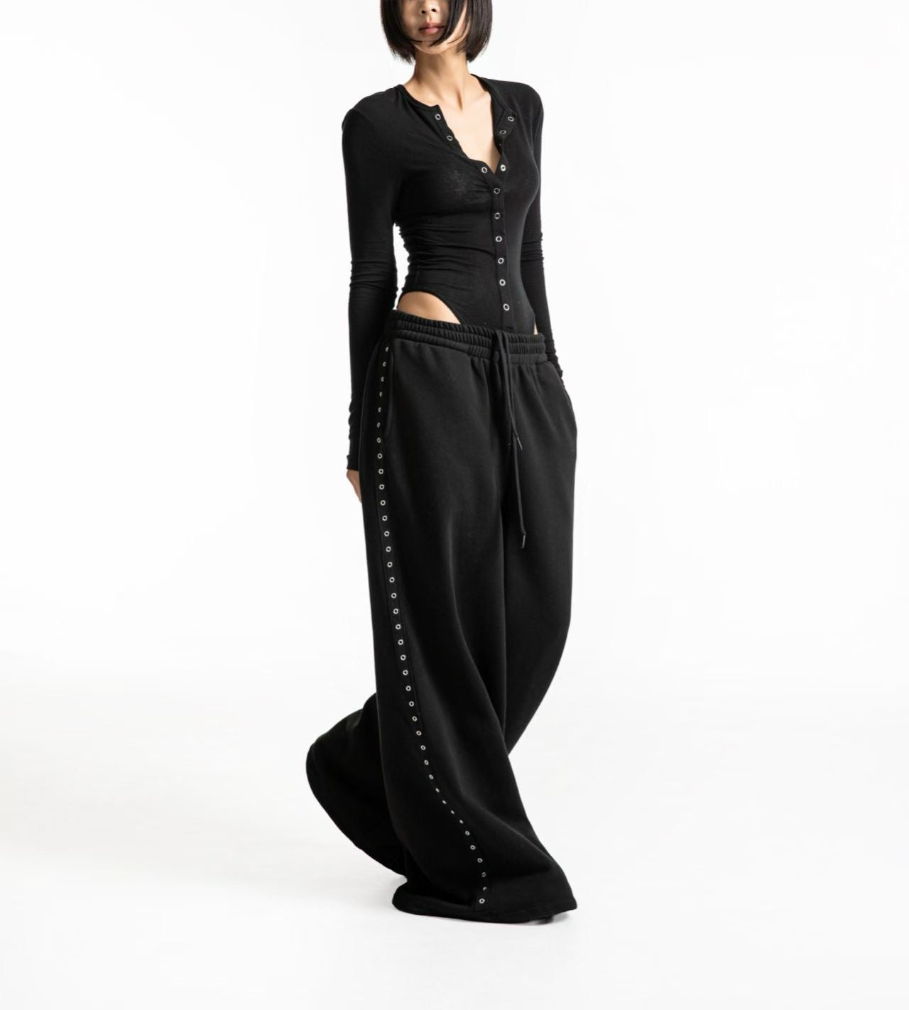 街頭酷帥,極寬鬆金屬雞眼闊腿運動褲