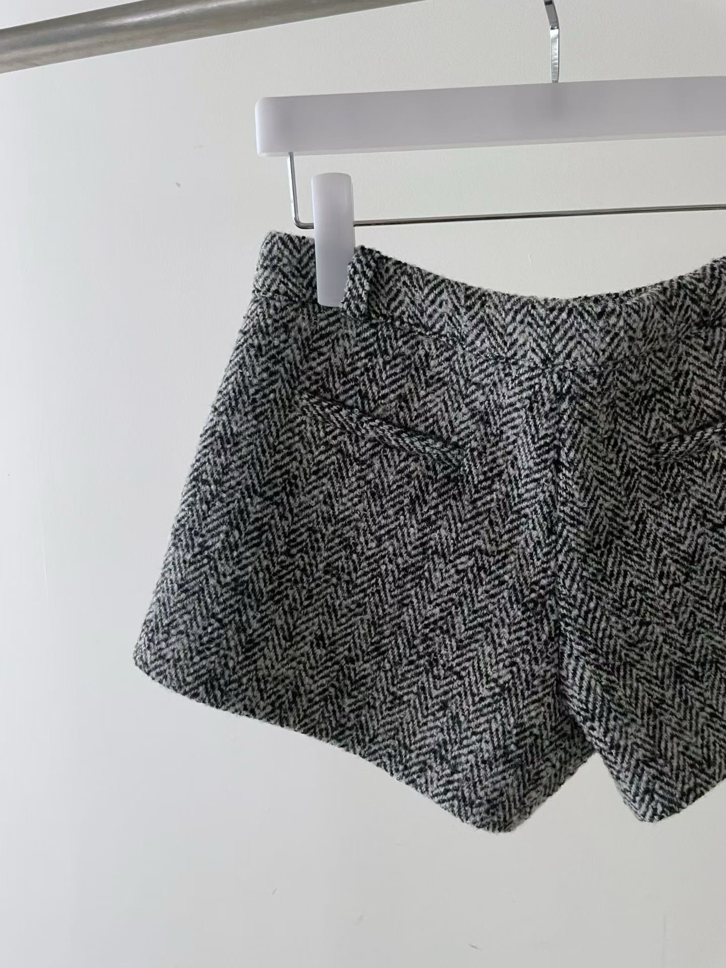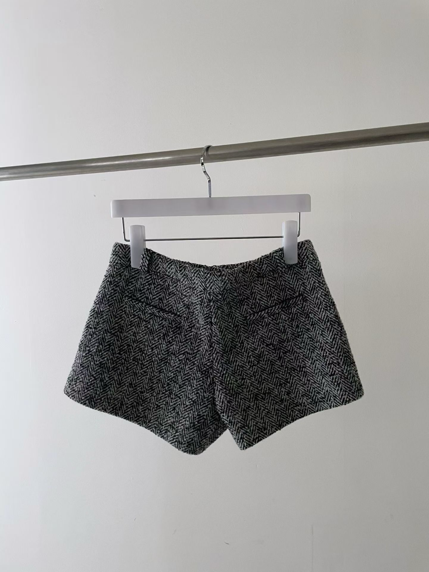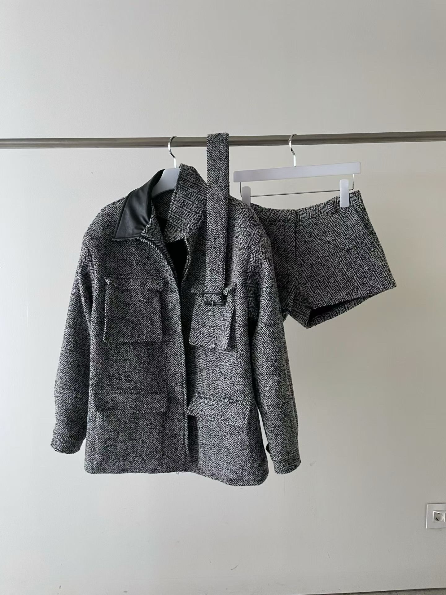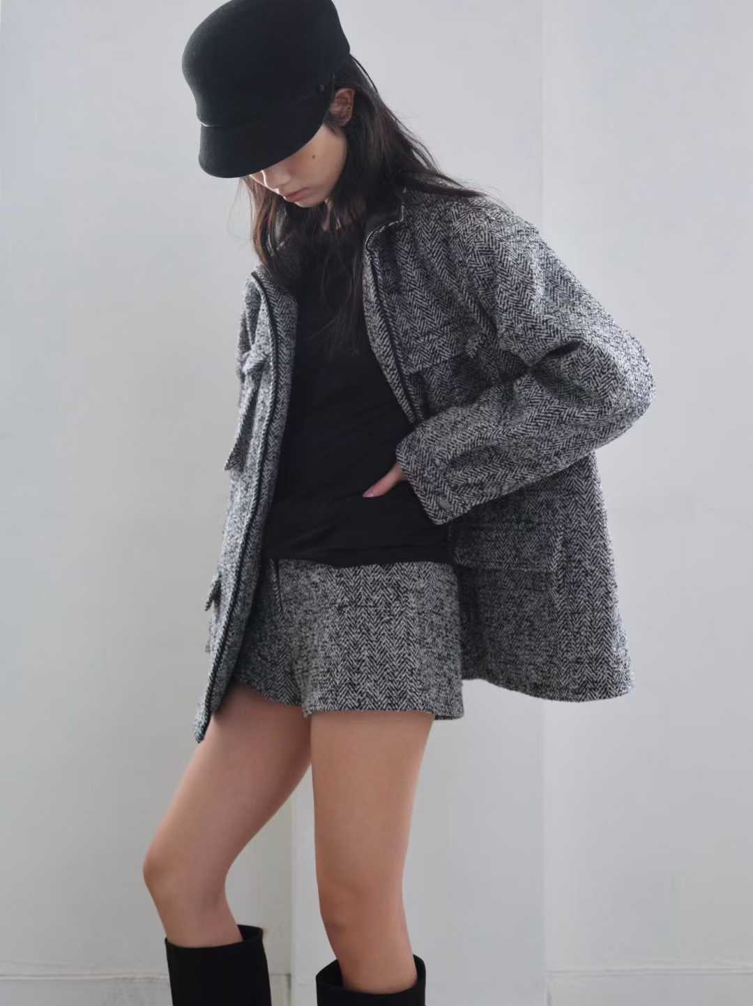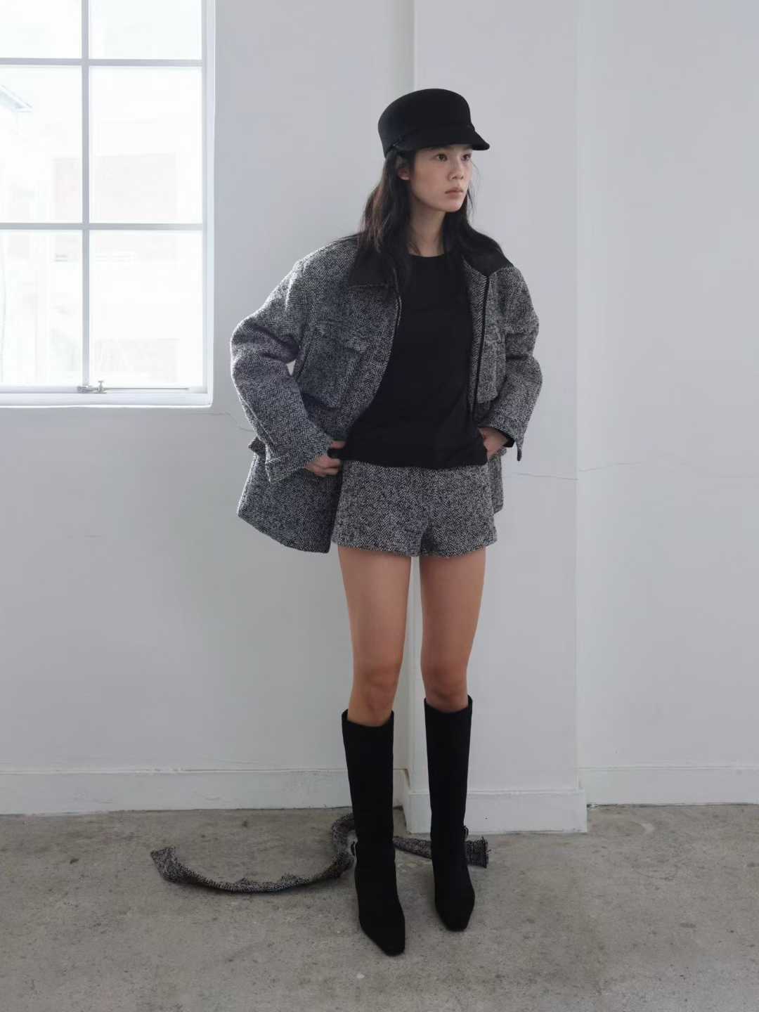 短褲則採用與外套相同的人字紋面料,簡潔俐落的版型與適中的長度,能完美修飾腿部線條。整套穿搭或搭配長靴,皆能展現強烈的時尚氣場。