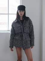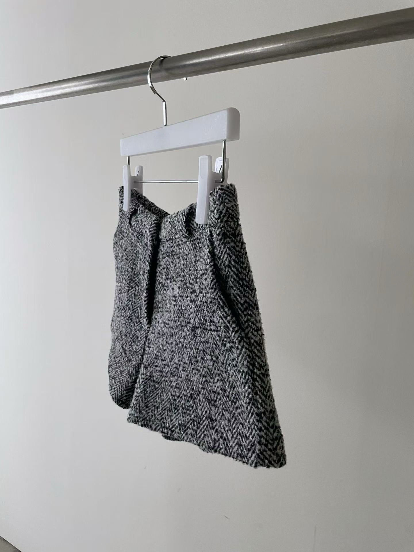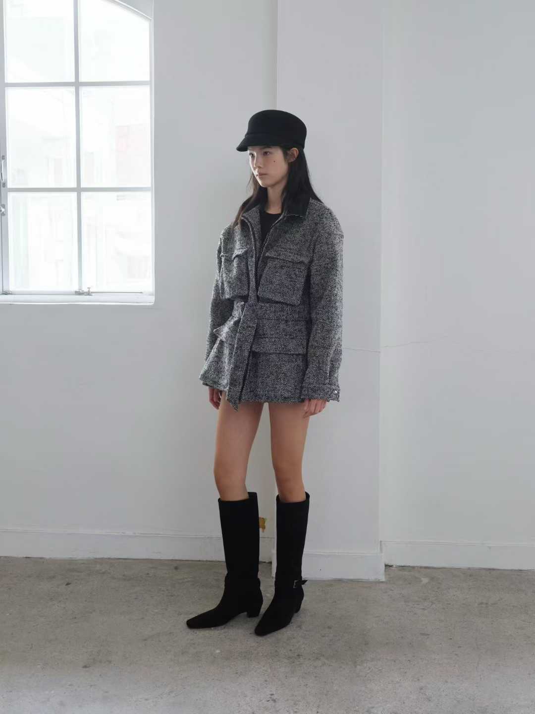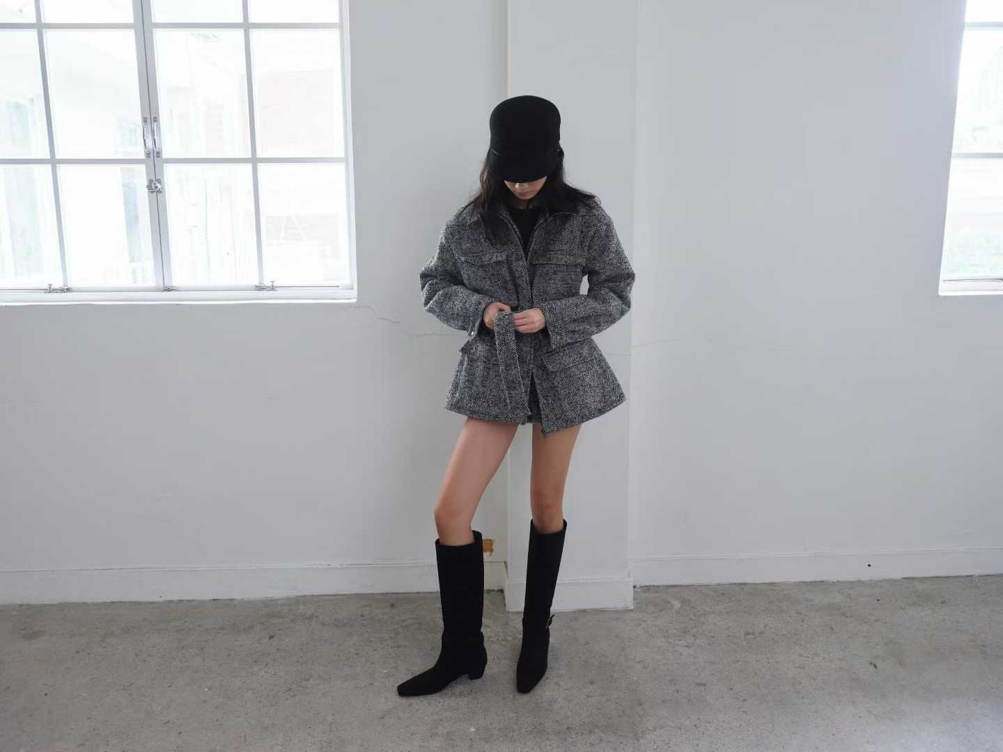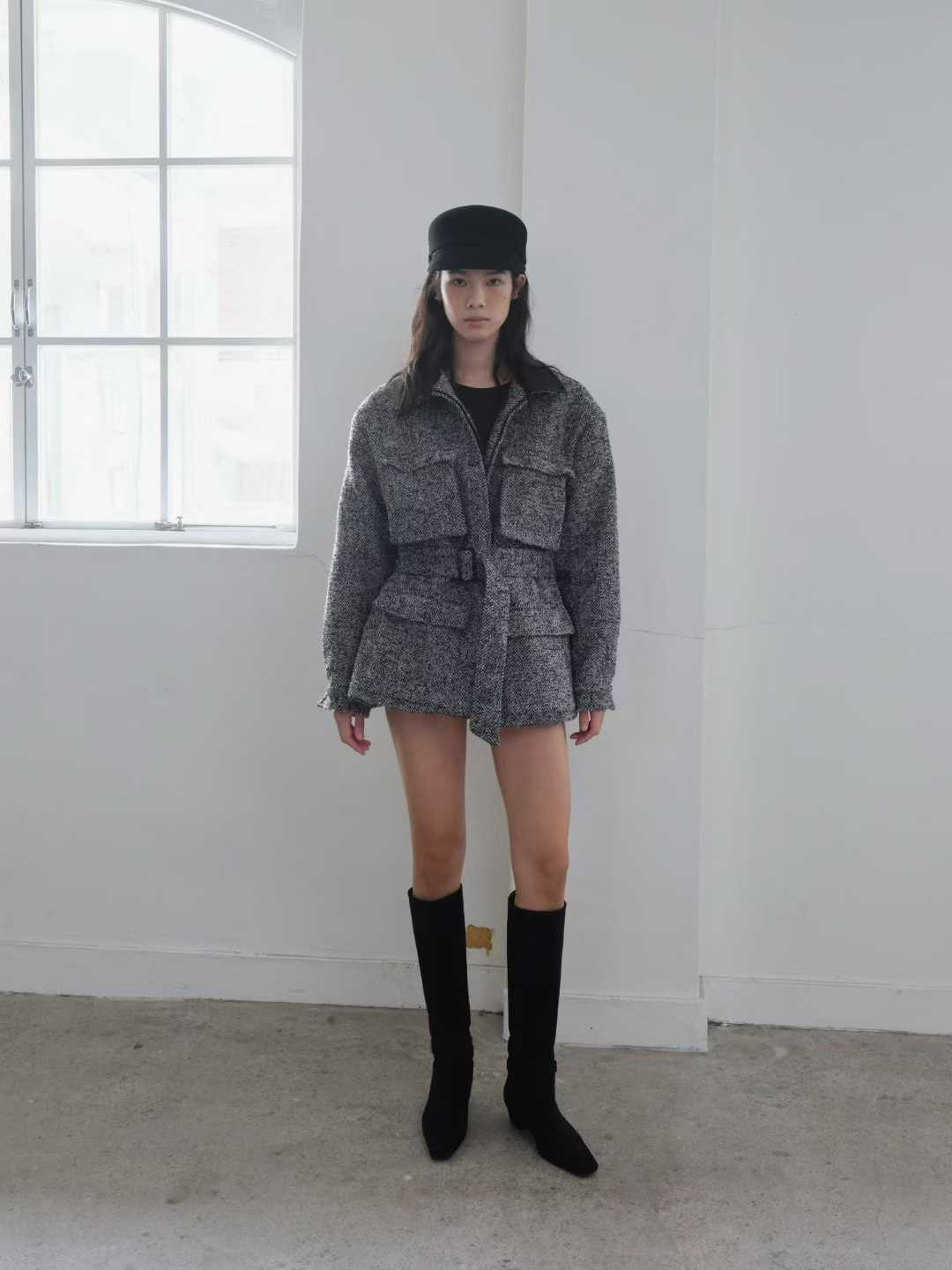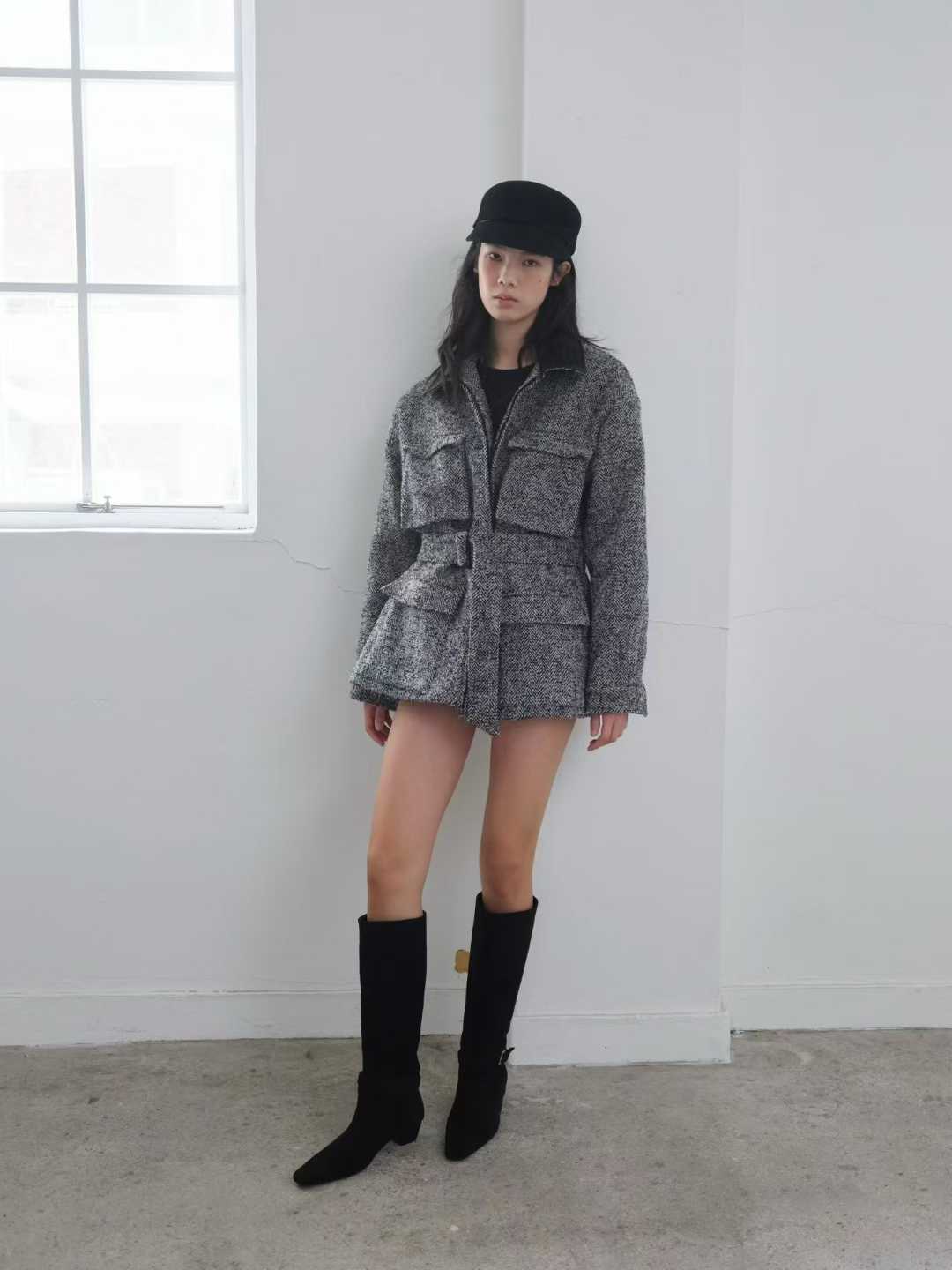 短褲則採用與外套相同的人字紋面料,簡潔俐落的版型與適中的長度,能完美修飾腿部線條。整套穿搭或搭配長靴,皆能展現強烈的時尚氣場。