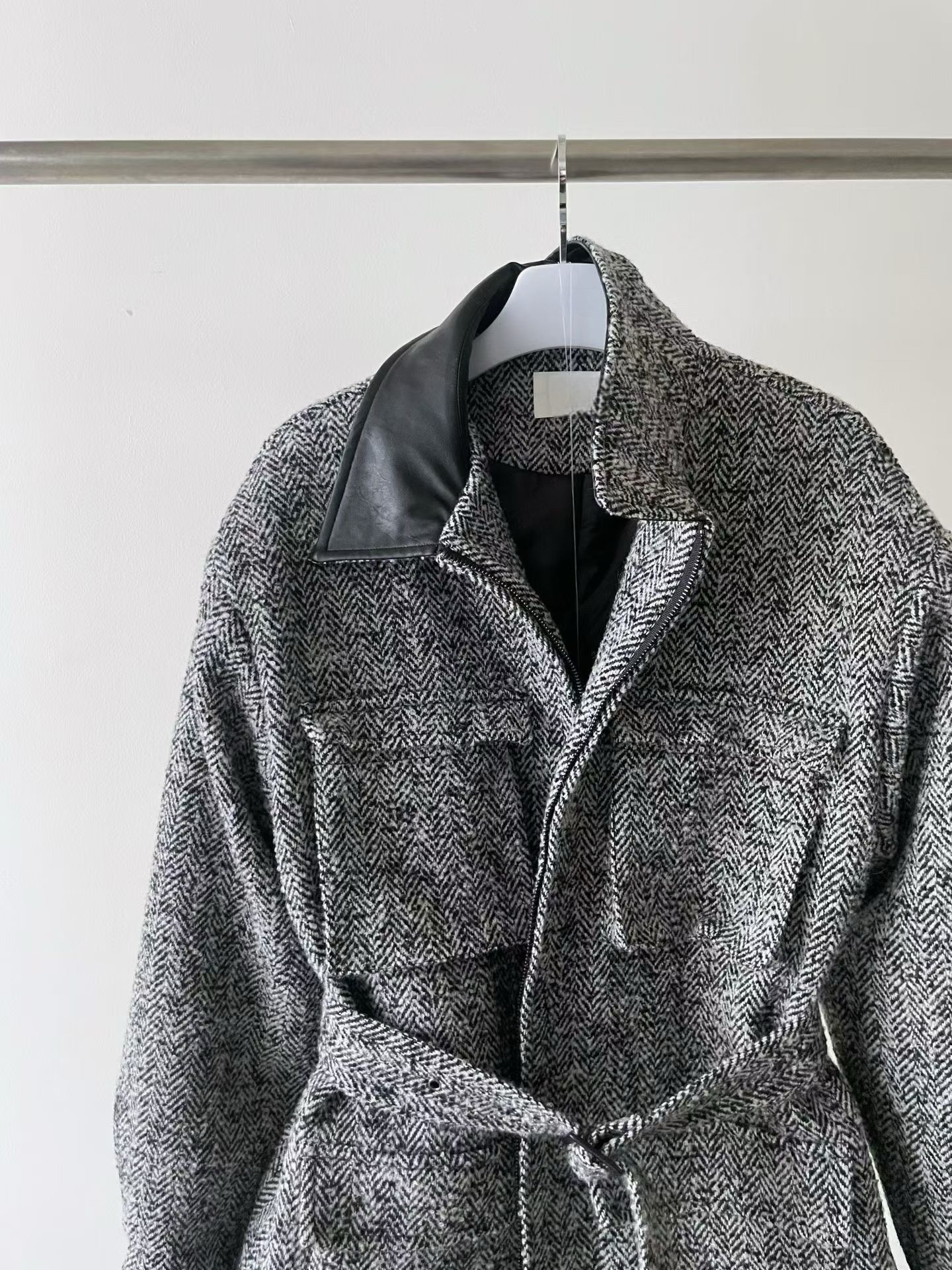 外套為中長款剪裁(長度至臀部或稍長),版型寬鬆俐落,能有效修飾身形。獨特的皮革翻領拼接,為整體注入一絲酷帥。外套具備多口袋和可調節腰帶,讓你可隨心收束腰身,打造出顯瘦效果。