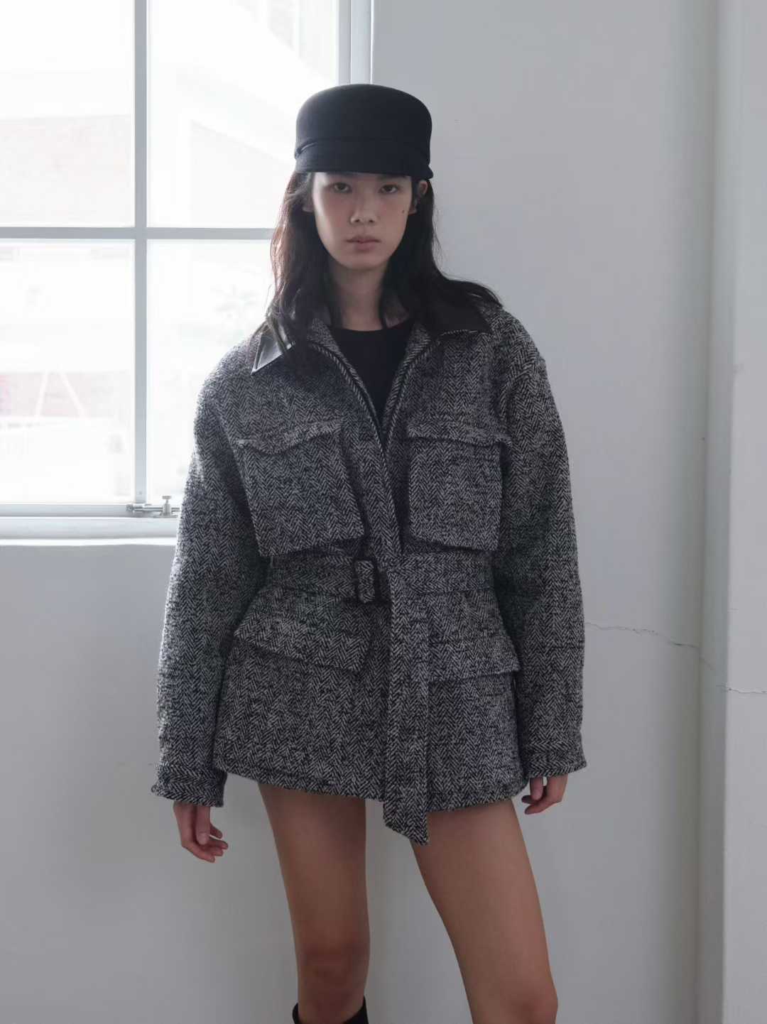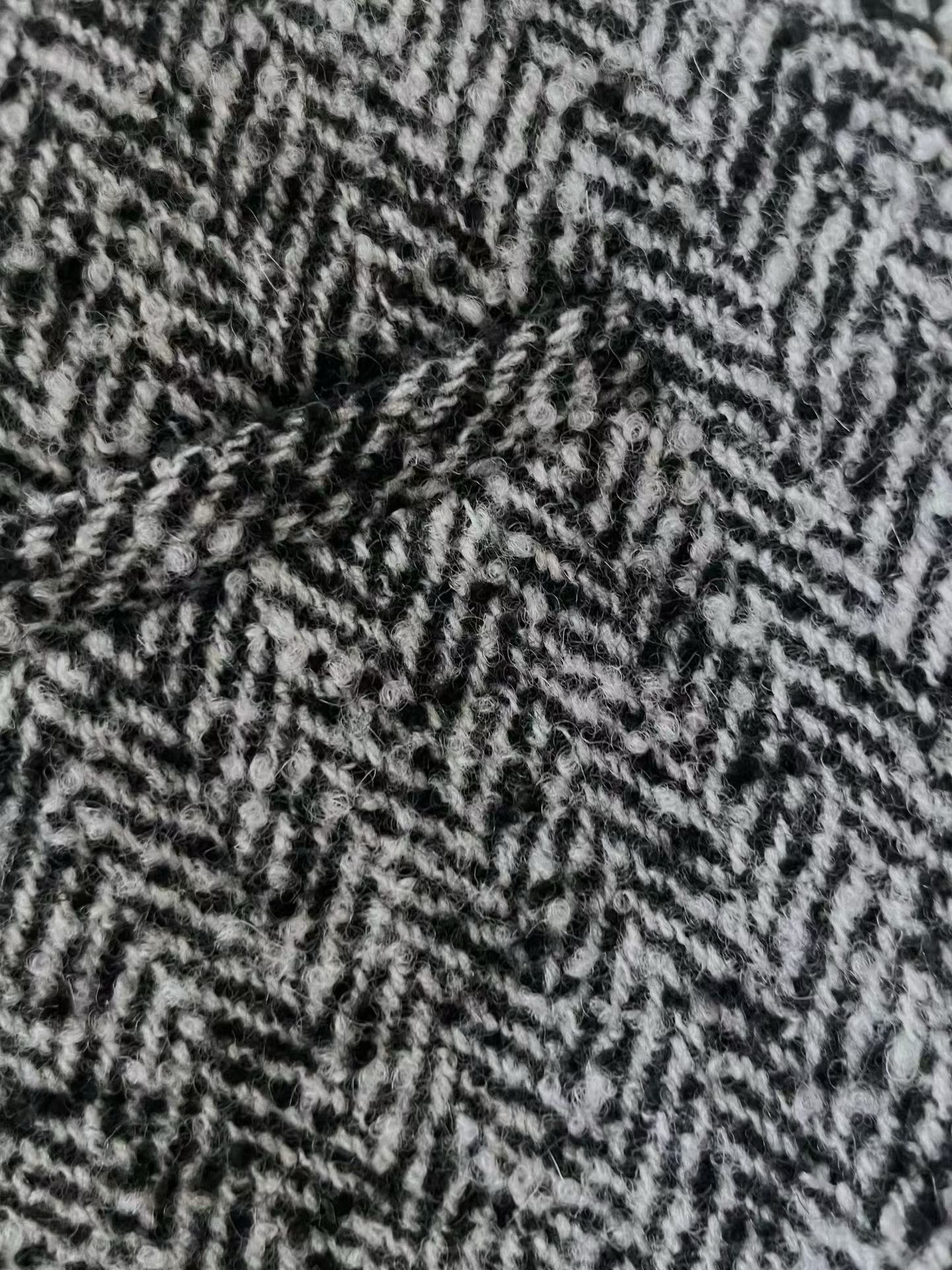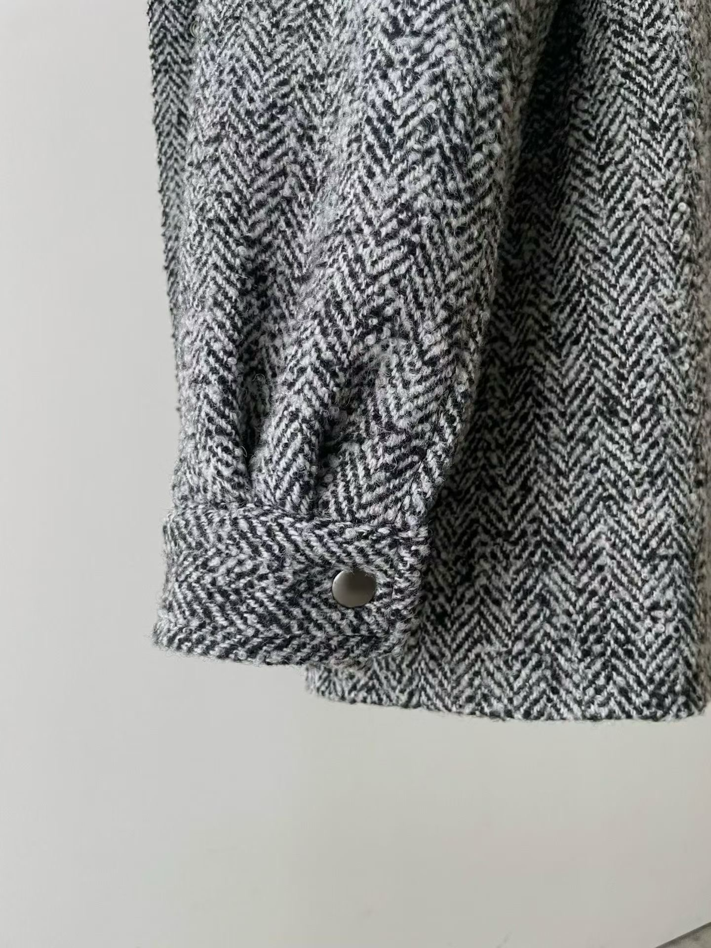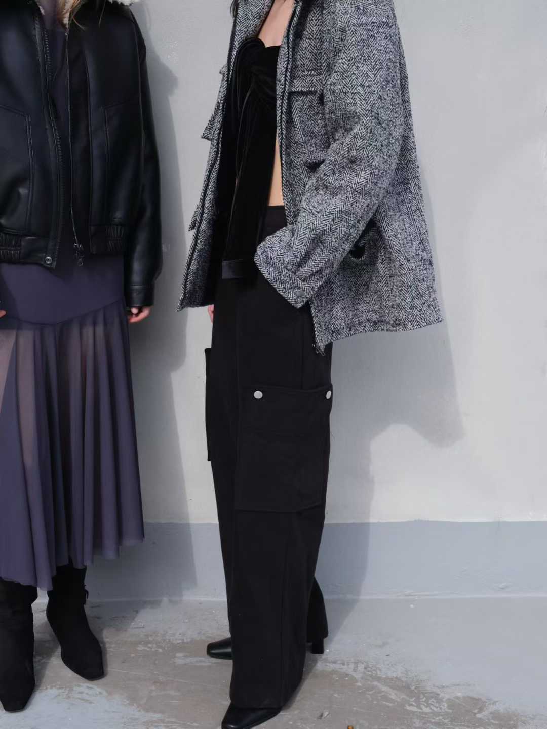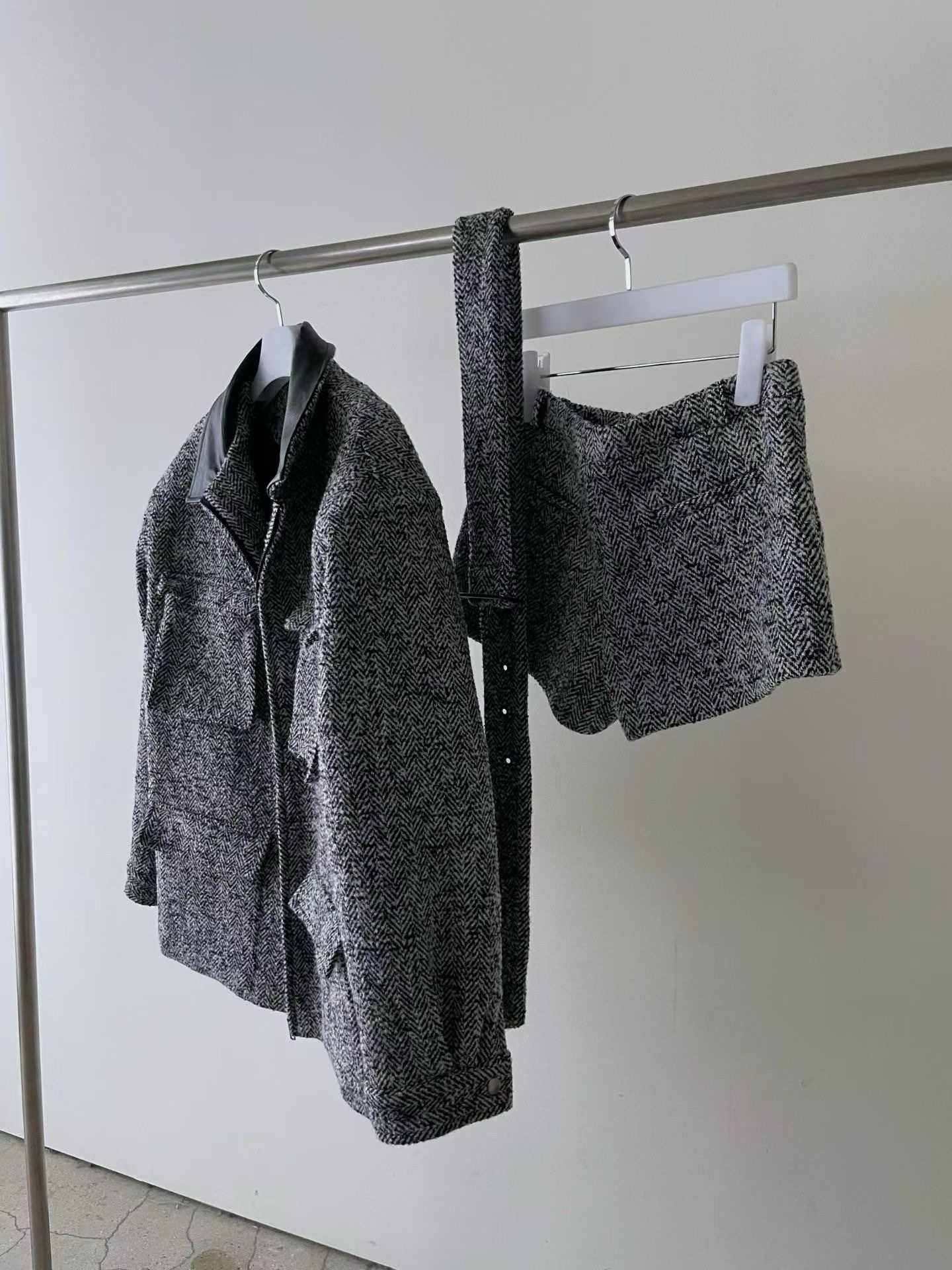 設計與質感: 套裝採用經典人字紋毛呢面料,質感厚實且視覺豐富,充滿濃郁的秋冬氛圍。