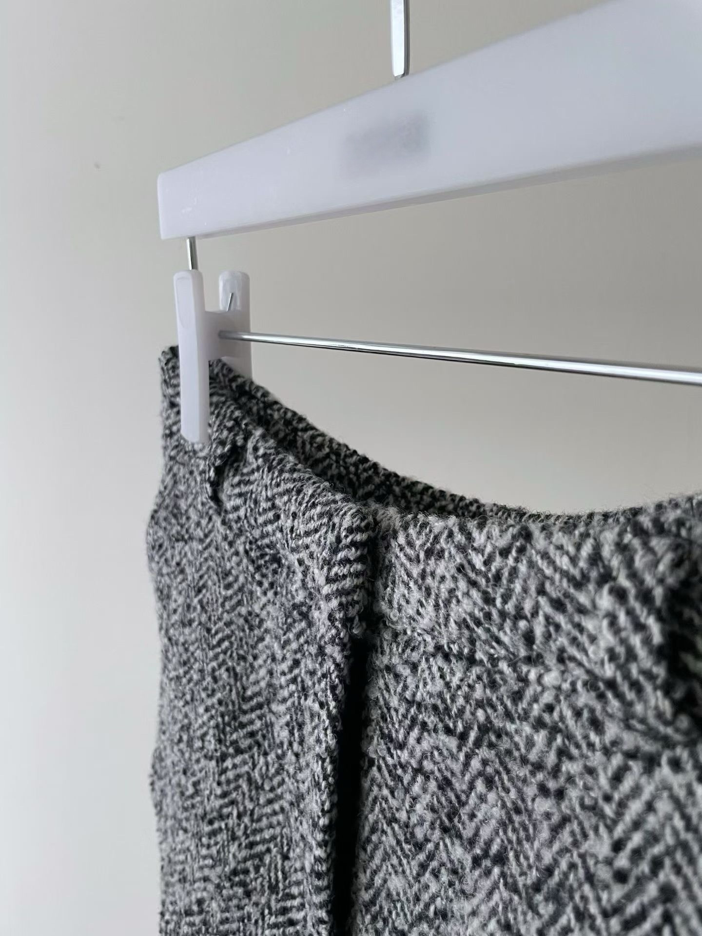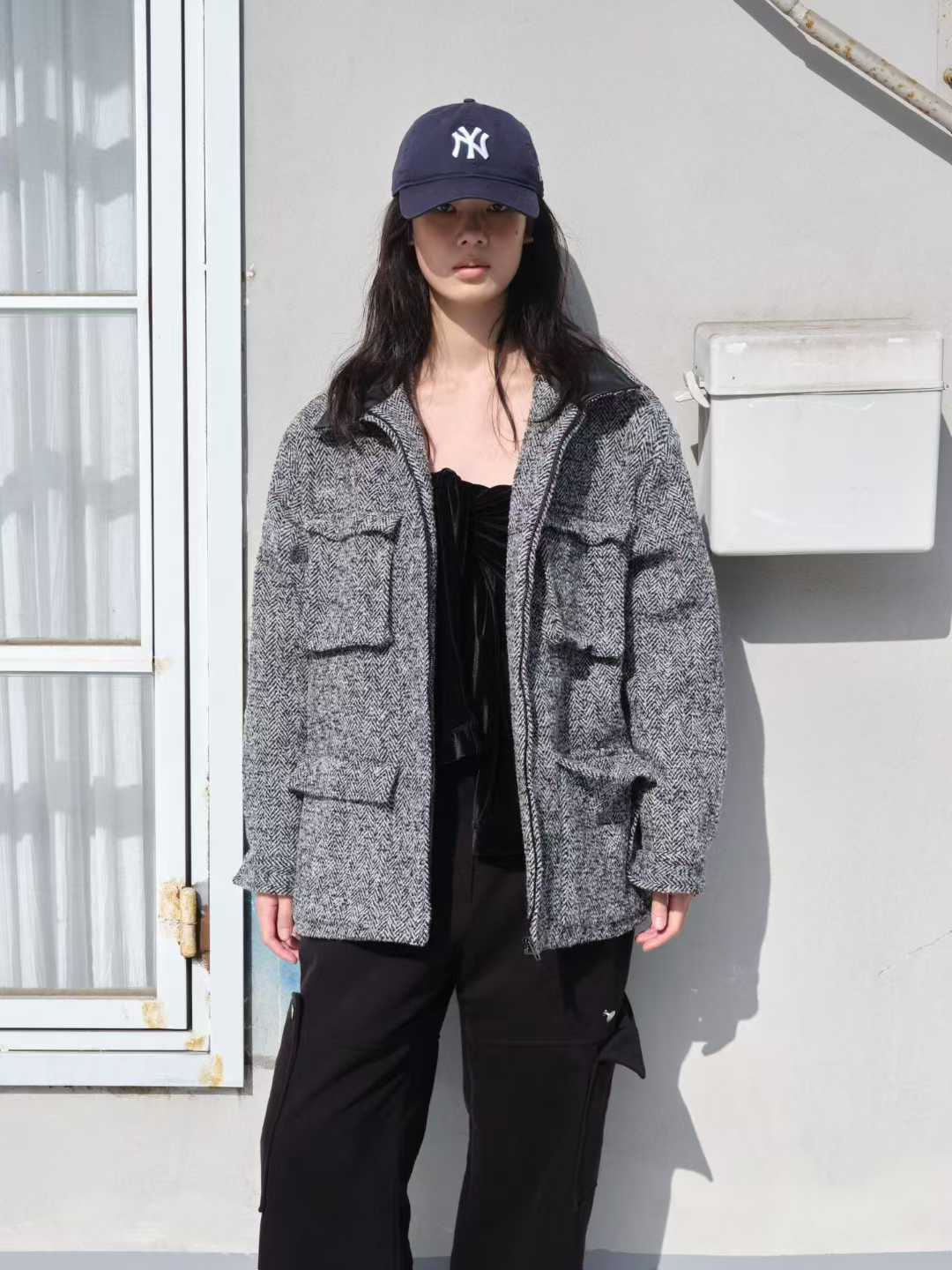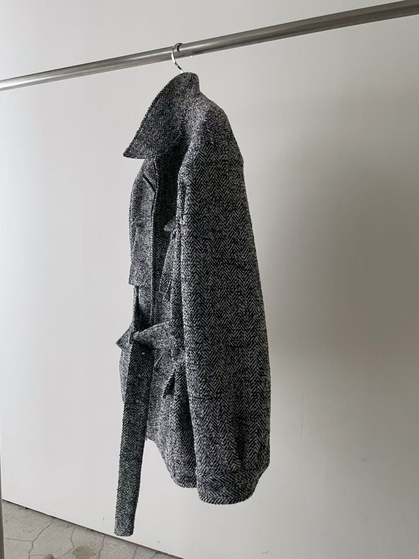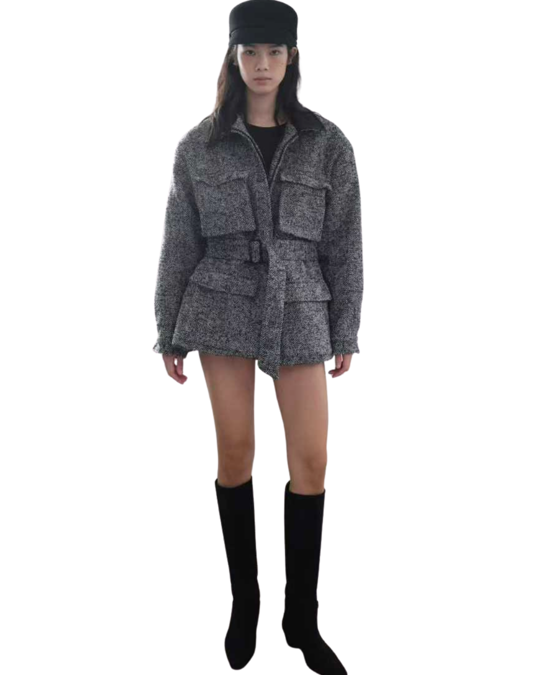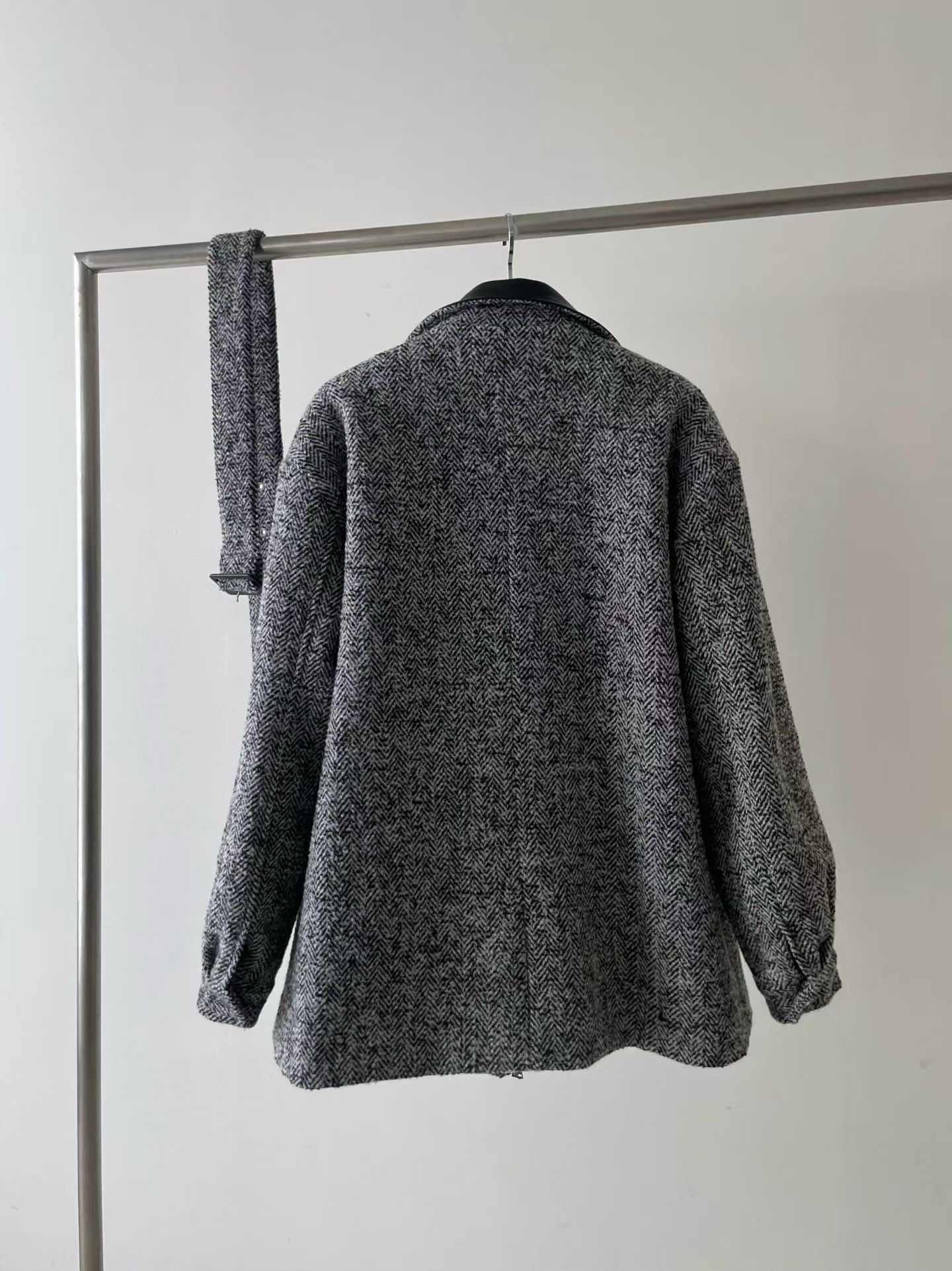 設計與質感: 套裝採用經典人字紋毛呢面料,質感厚實且視覺豐富,充滿濃郁的秋冬氛圍。