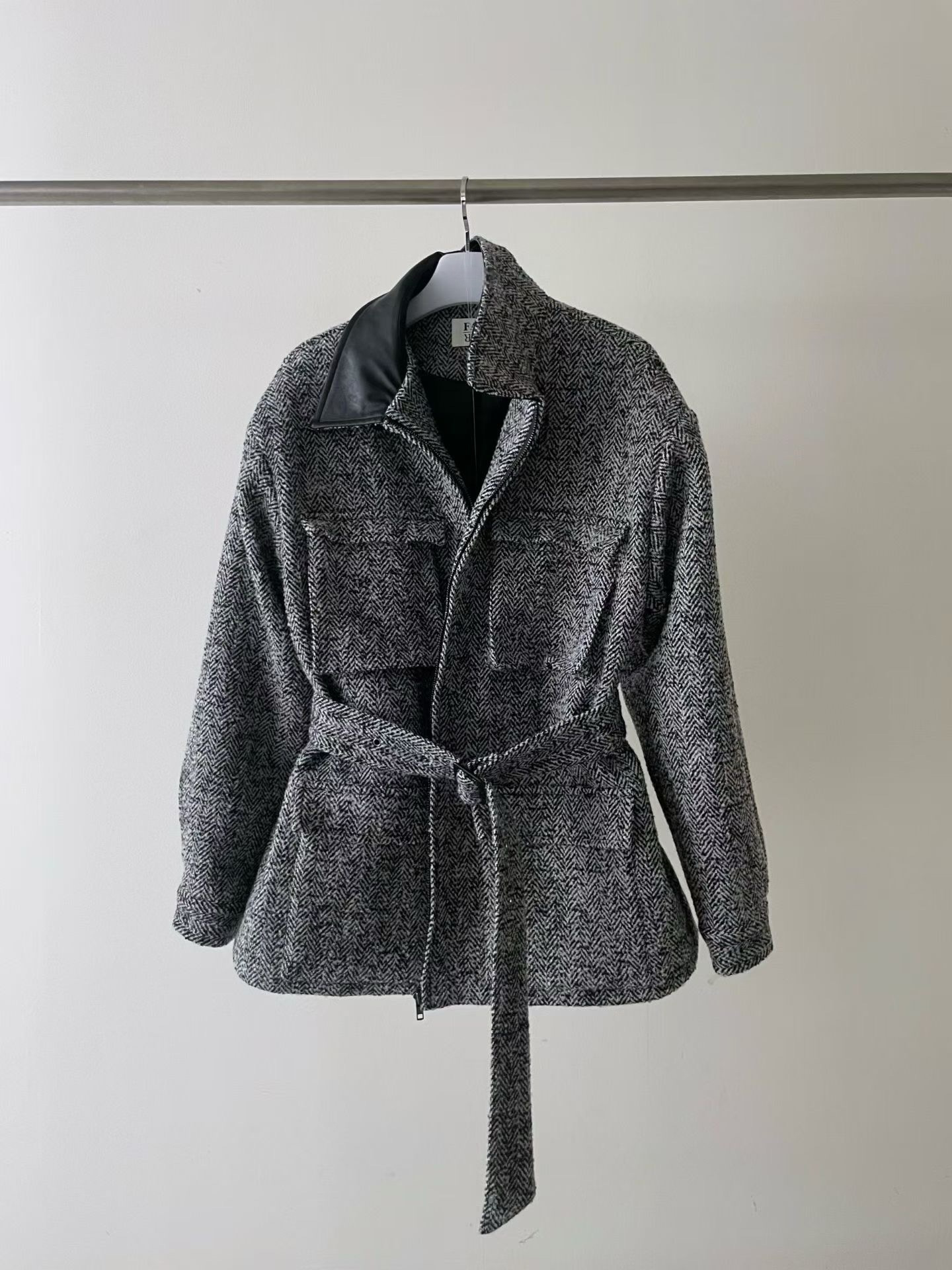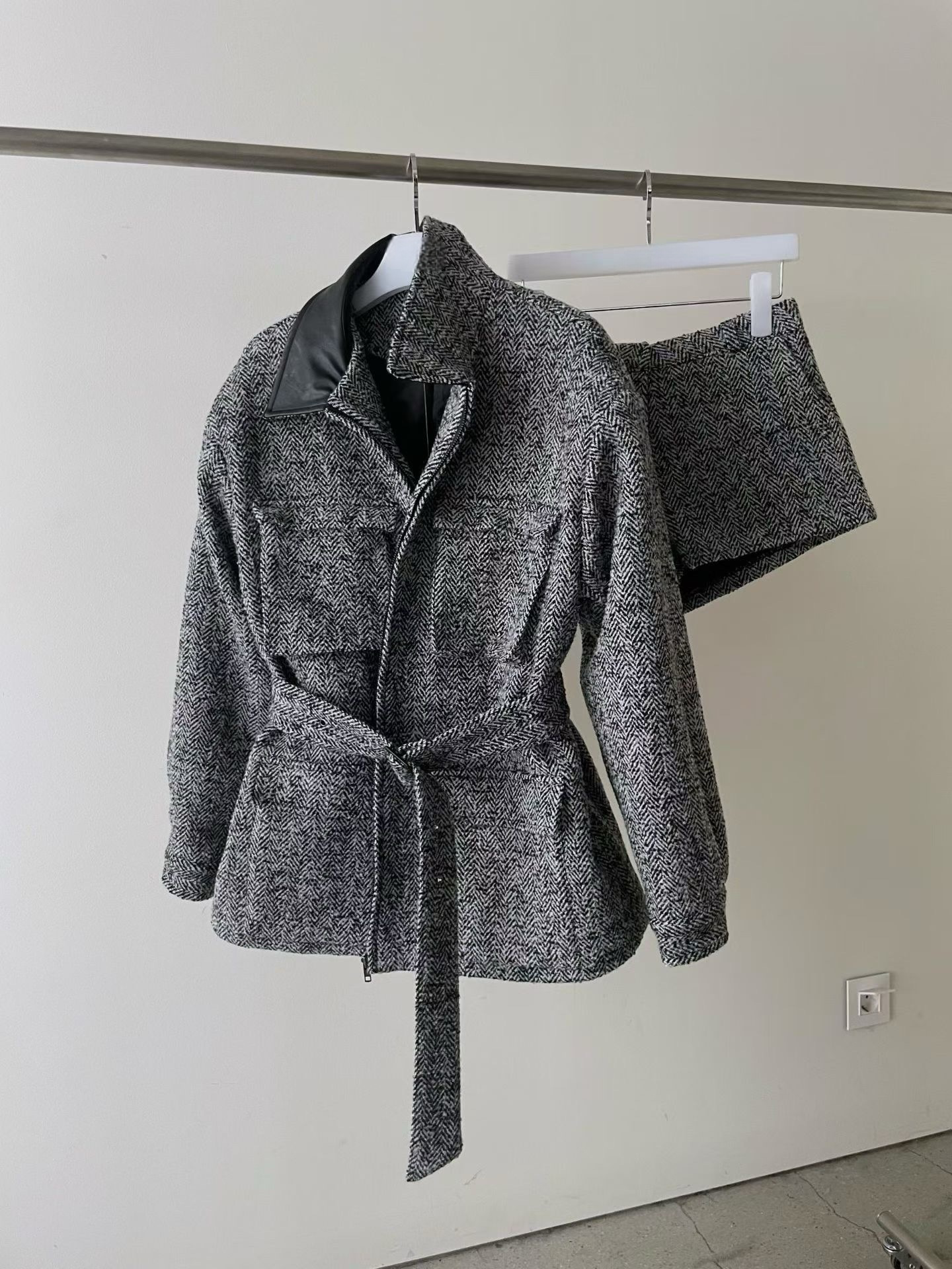 ST22002- 韓國設計師款重工人字紋皮革拼接中長外套與短褲套裝