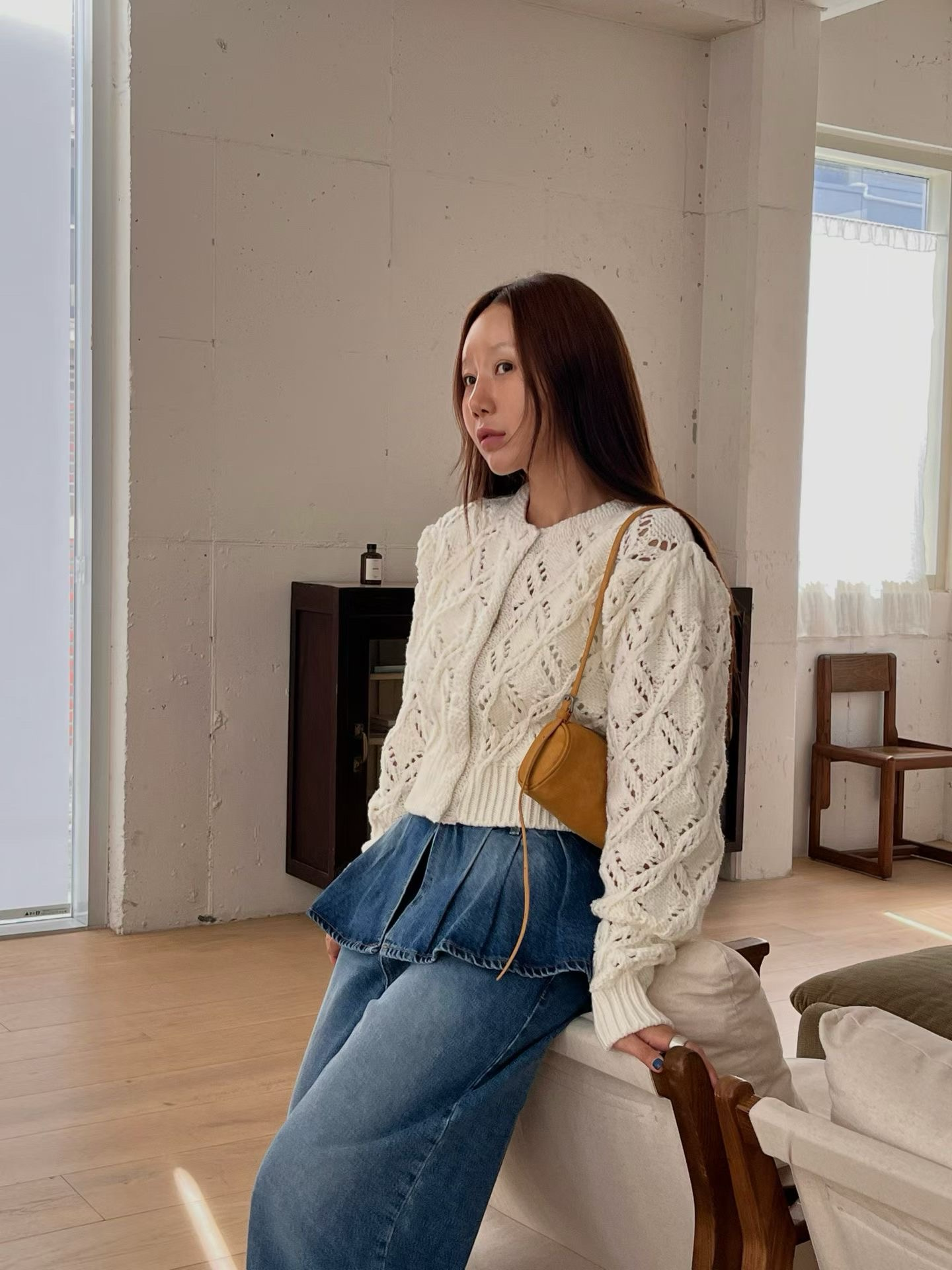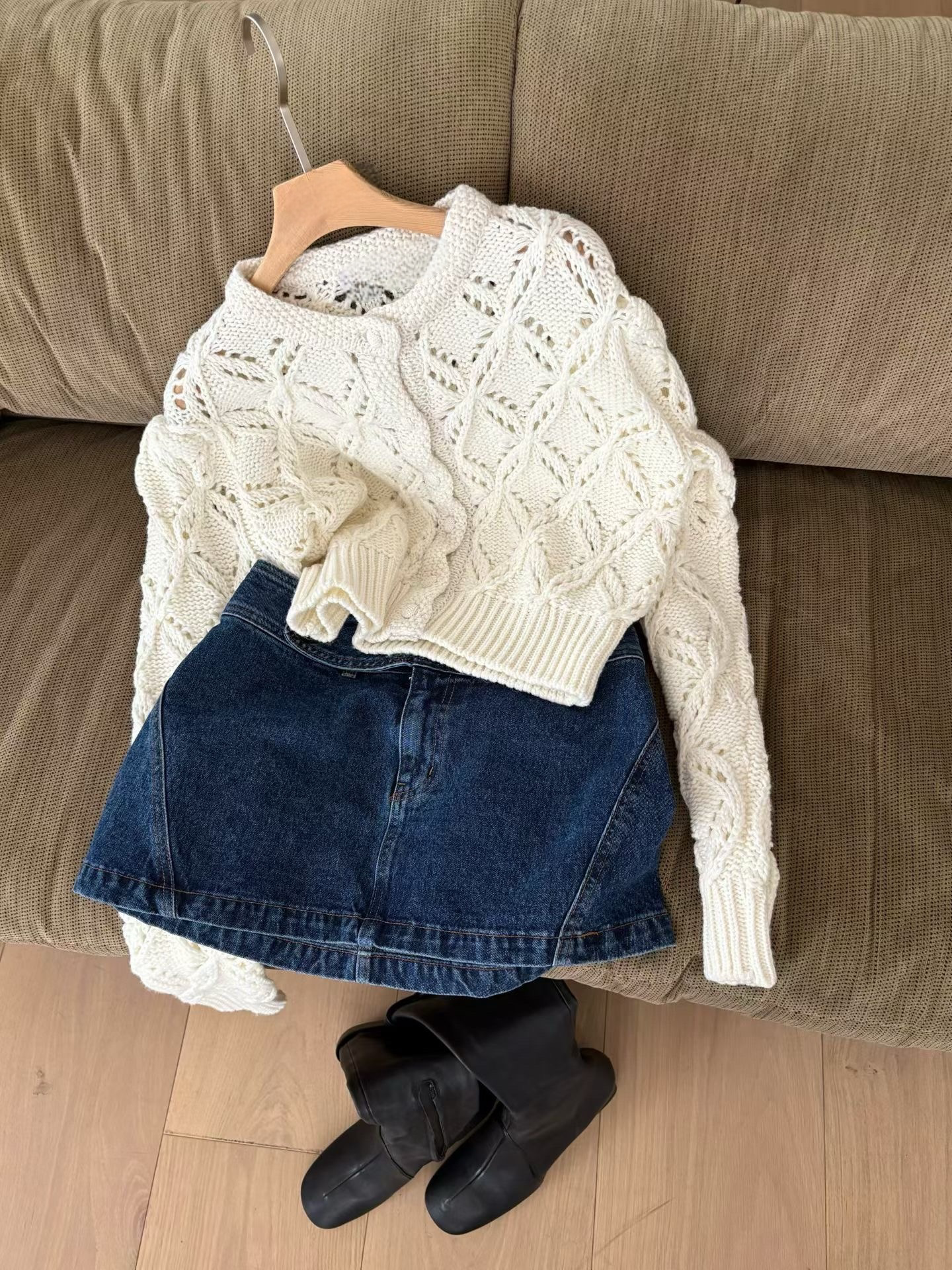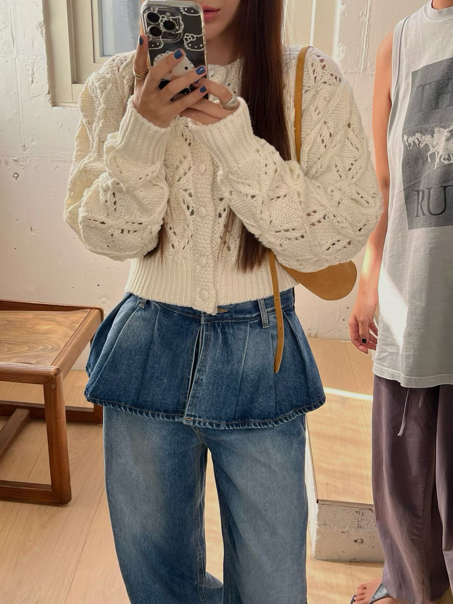 這套設計感鏤空針織開衫與荷葉邊牛仔褲套裝,專為追求甜美細節與前衛廓形的你而設計。它將浪漫的田園風與硬朗的丹寧元素完美融合,創造出充滿戲劇性的潮流造型。