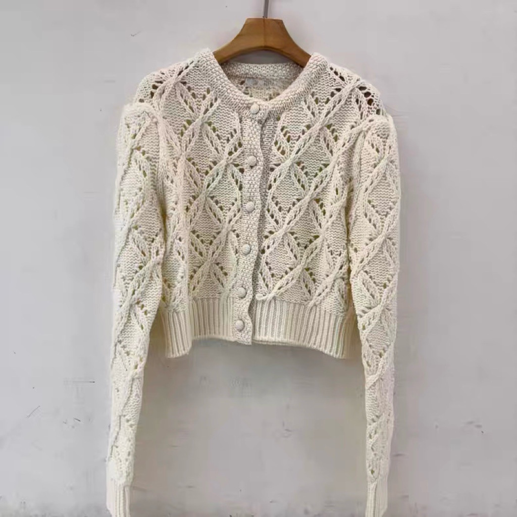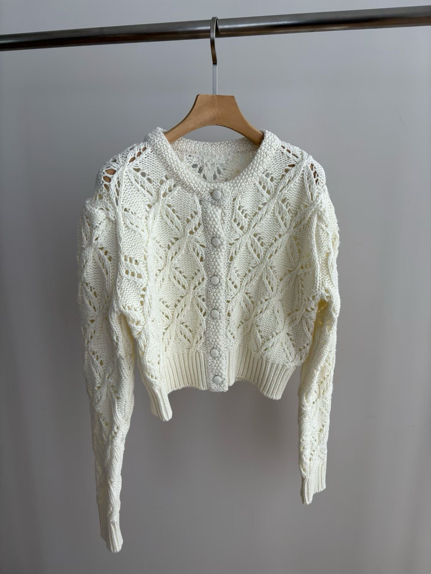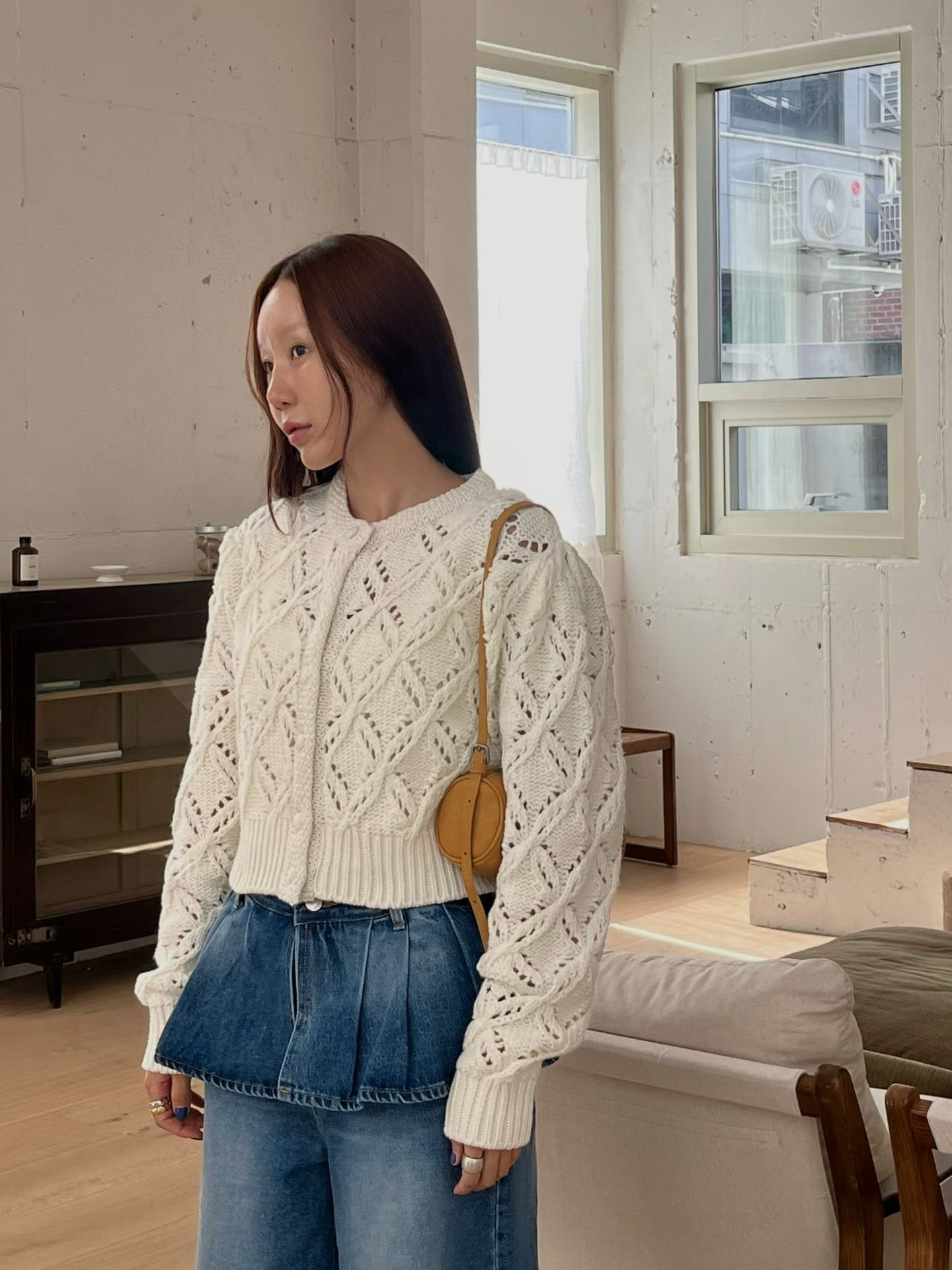 上衣採用鏤空編織針織開衫,由 35%錦綸和65%聚酯纖維混紡而成,輕盈透氣。短版剪裁巧妙拉高腰線,搭配精緻的菱格花紋與鈕釦,展現浪漫的甜美氣息。提供象牙色、經典黑與潮流黃綠色三色。