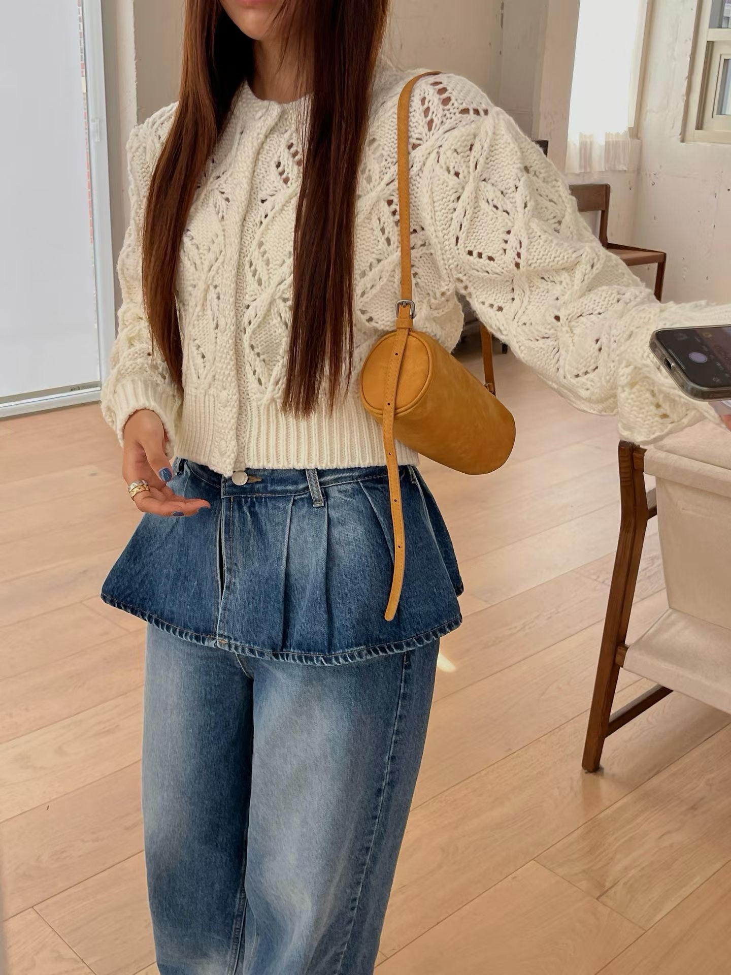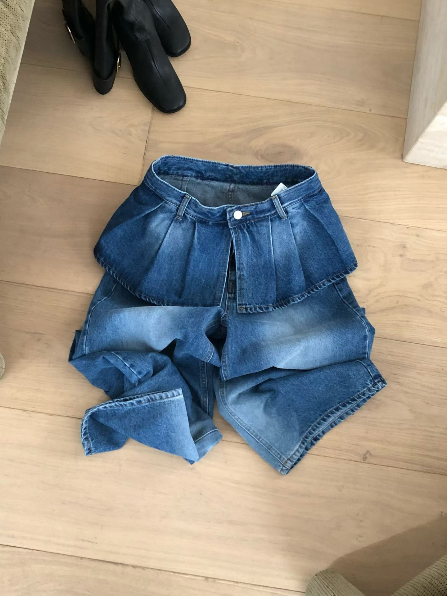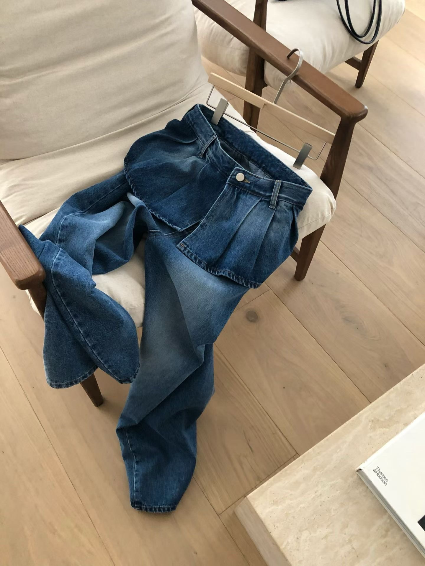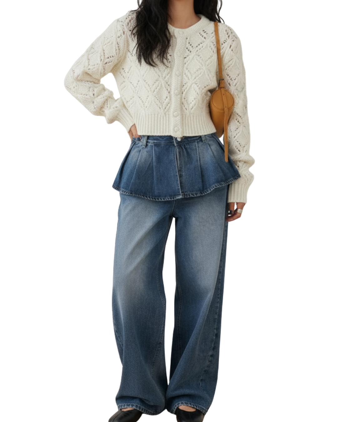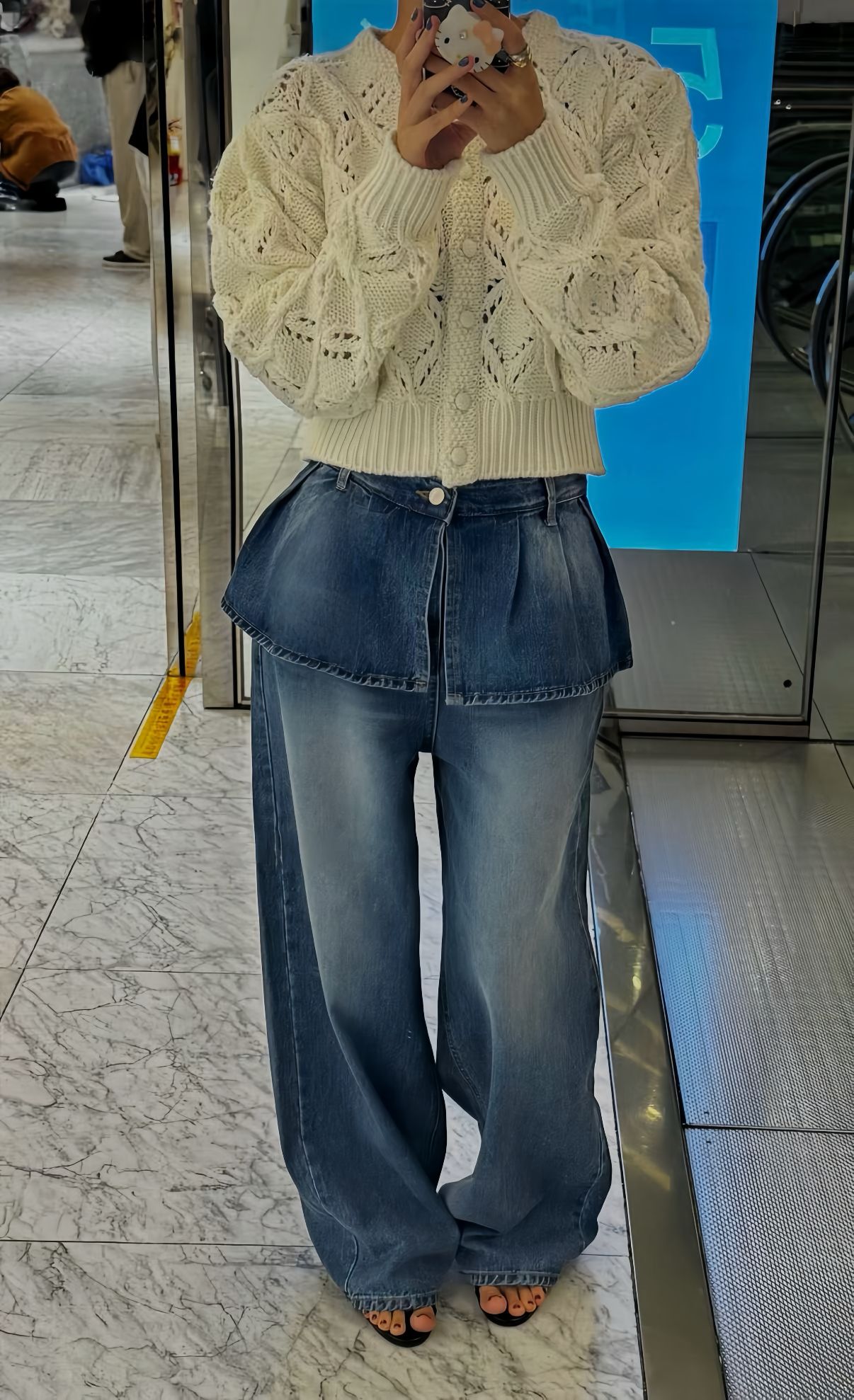 牛仔褲是本套裝的靈魂所在,採用復古水洗闊腿版型,充滿隨性街頭感。最獨特的是腰部立體的荷葉邊(Peplum)設計,創造出宛如裙子外穿的錯視效果,完美收束腰身,同時增添了個性的設計感。