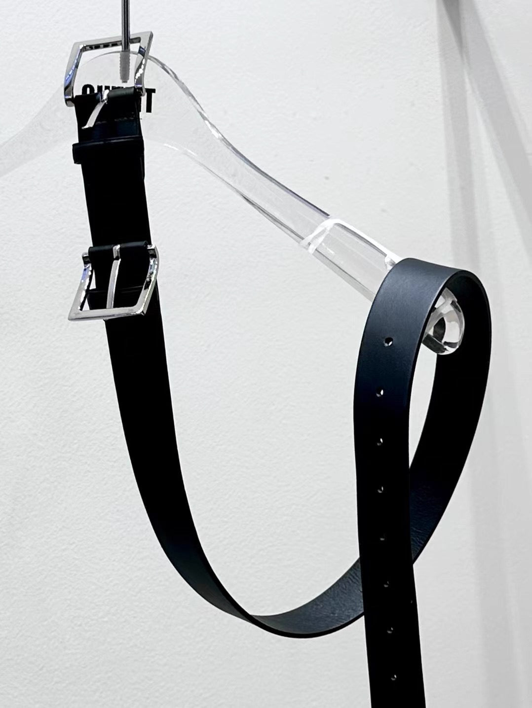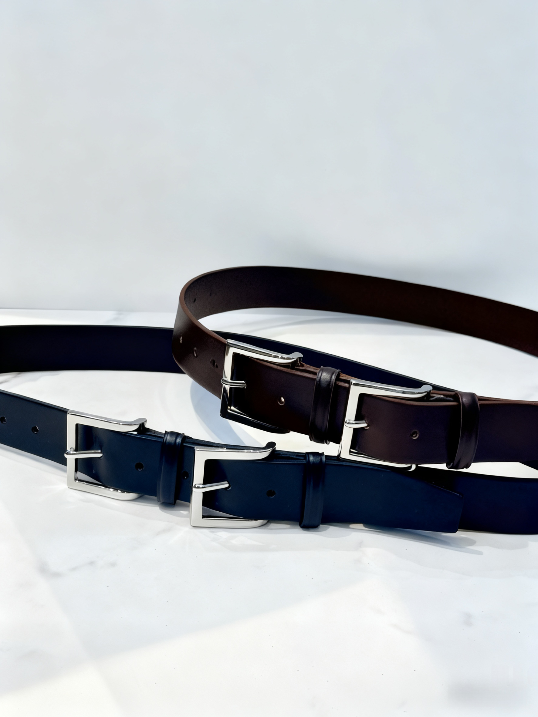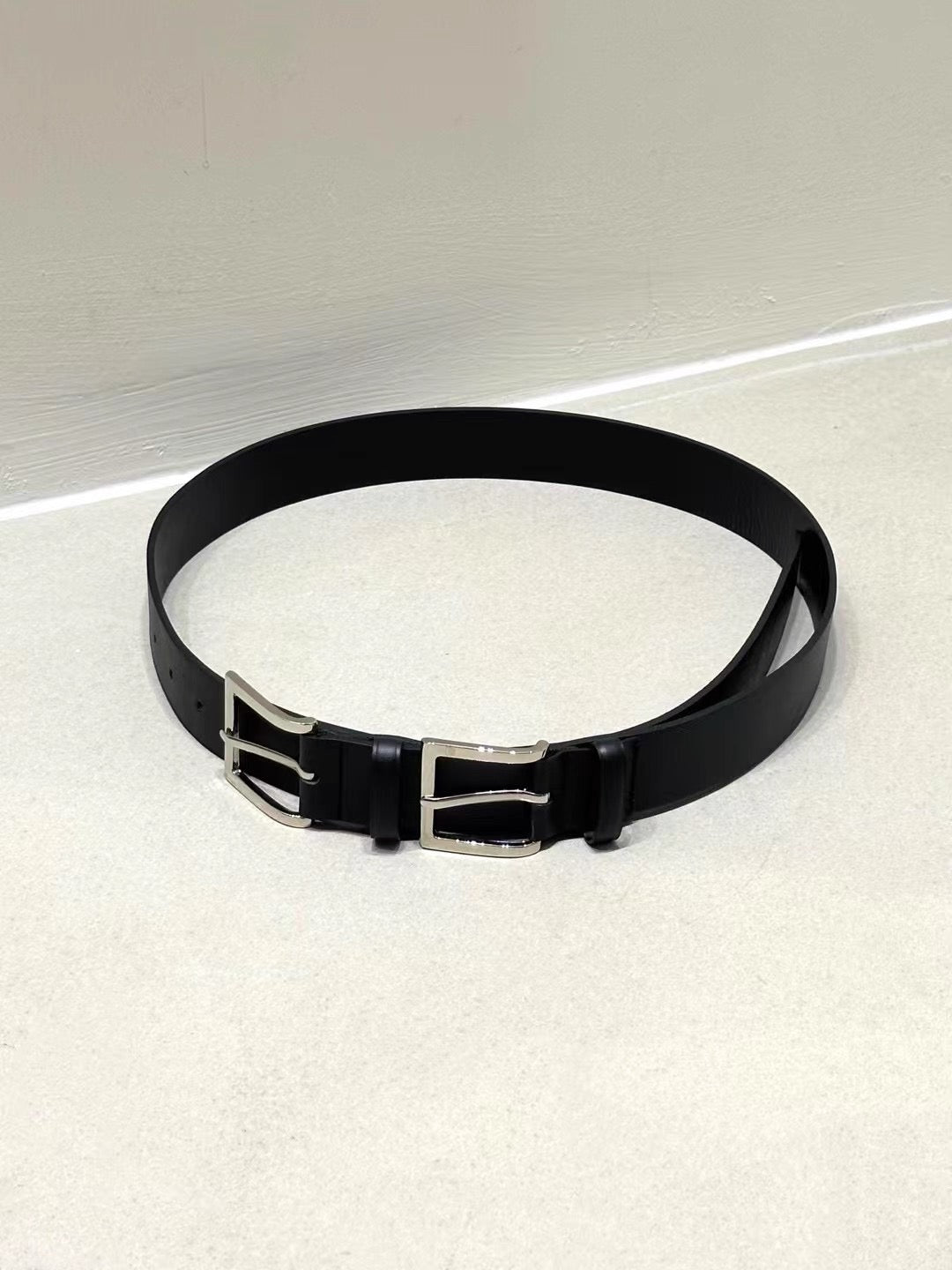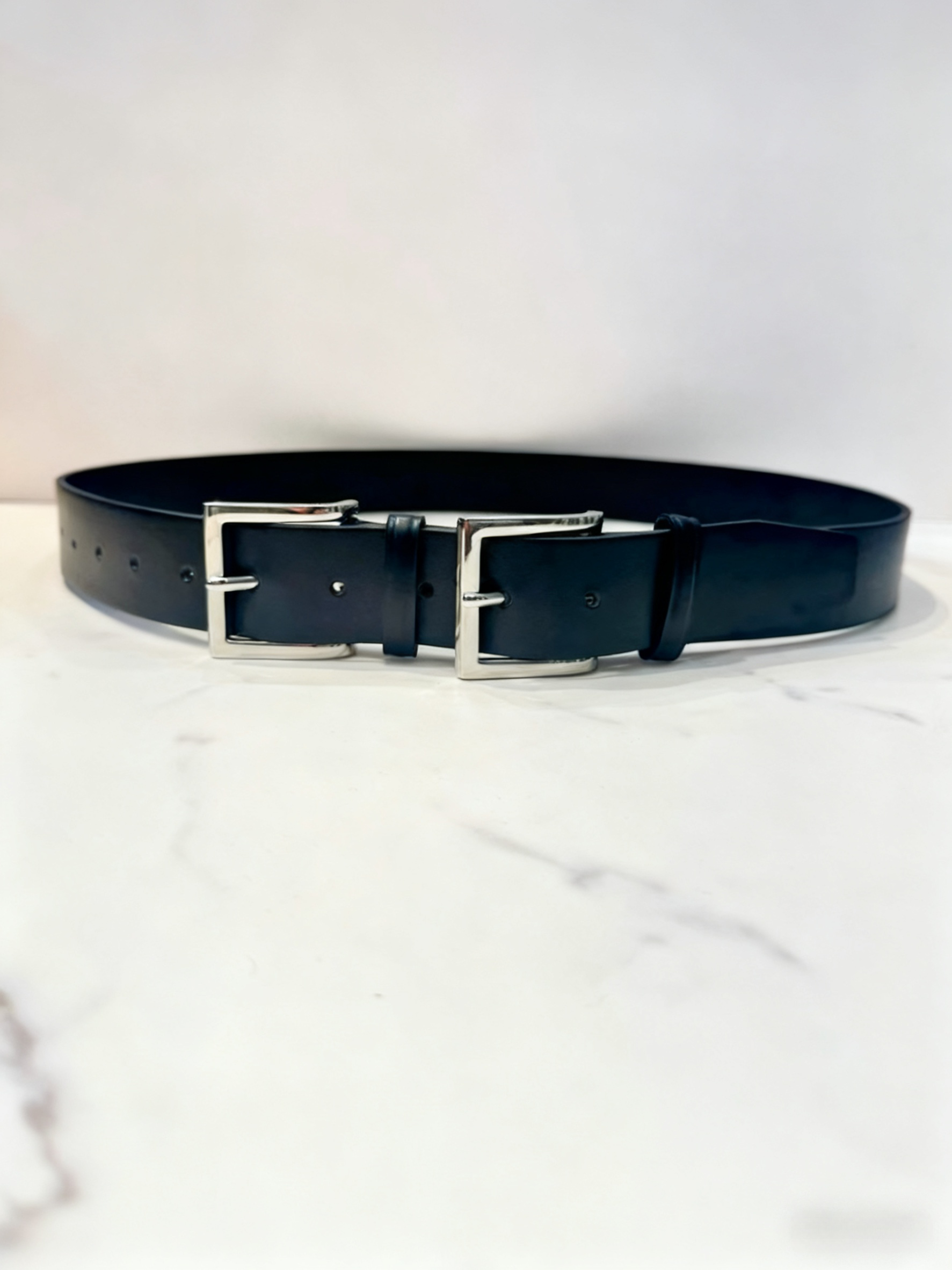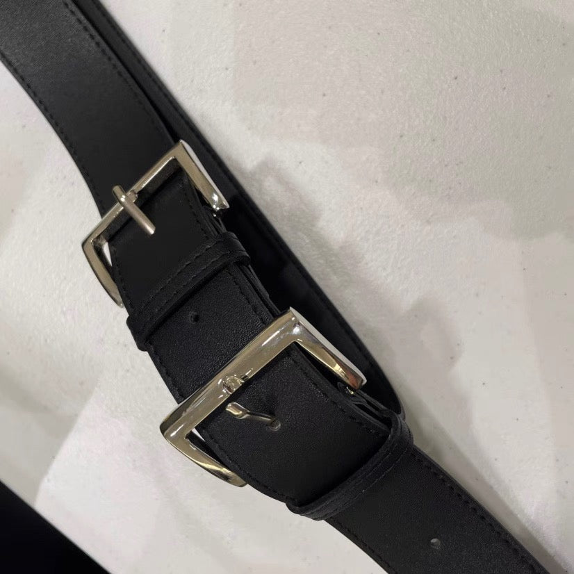 設計與材質: 採用優質真牛皮製作,皮質厚實挺括,質感絕佳。最獨特的設計在於雙金屬釦環,兩個方正的銀色釦頭緊密並排,造型大膽前衛,充滿設計巧思。3.5公分的寬度適中,能強烈突顯腰線,是打造俐落穿搭疊穿造型的完美配件。
