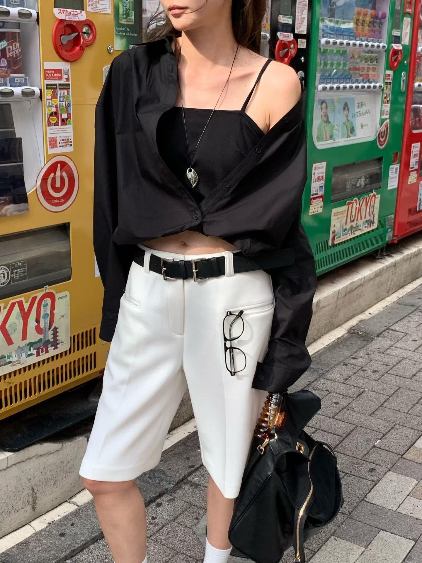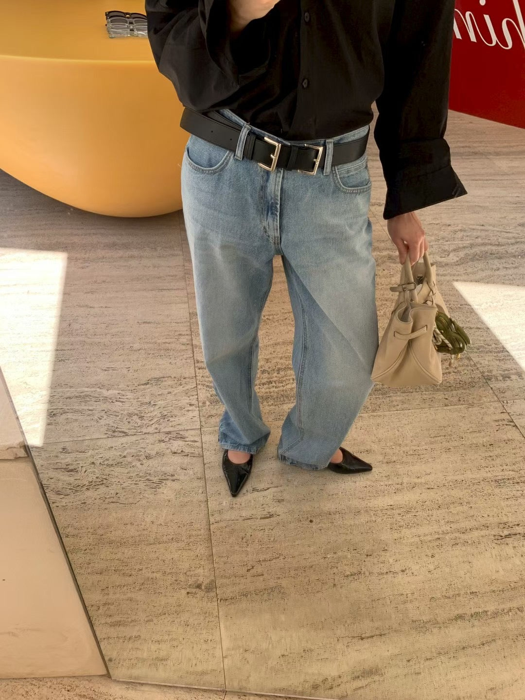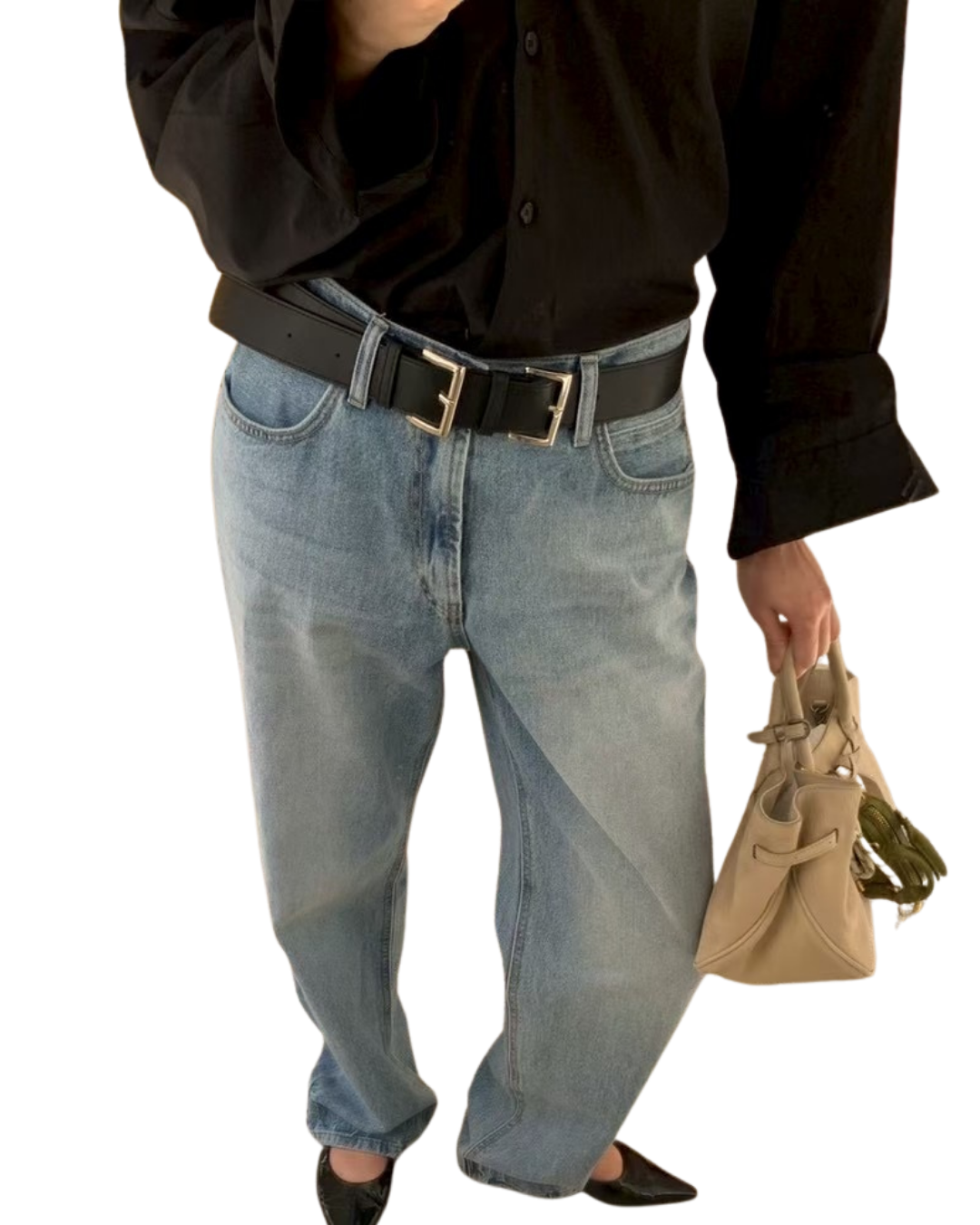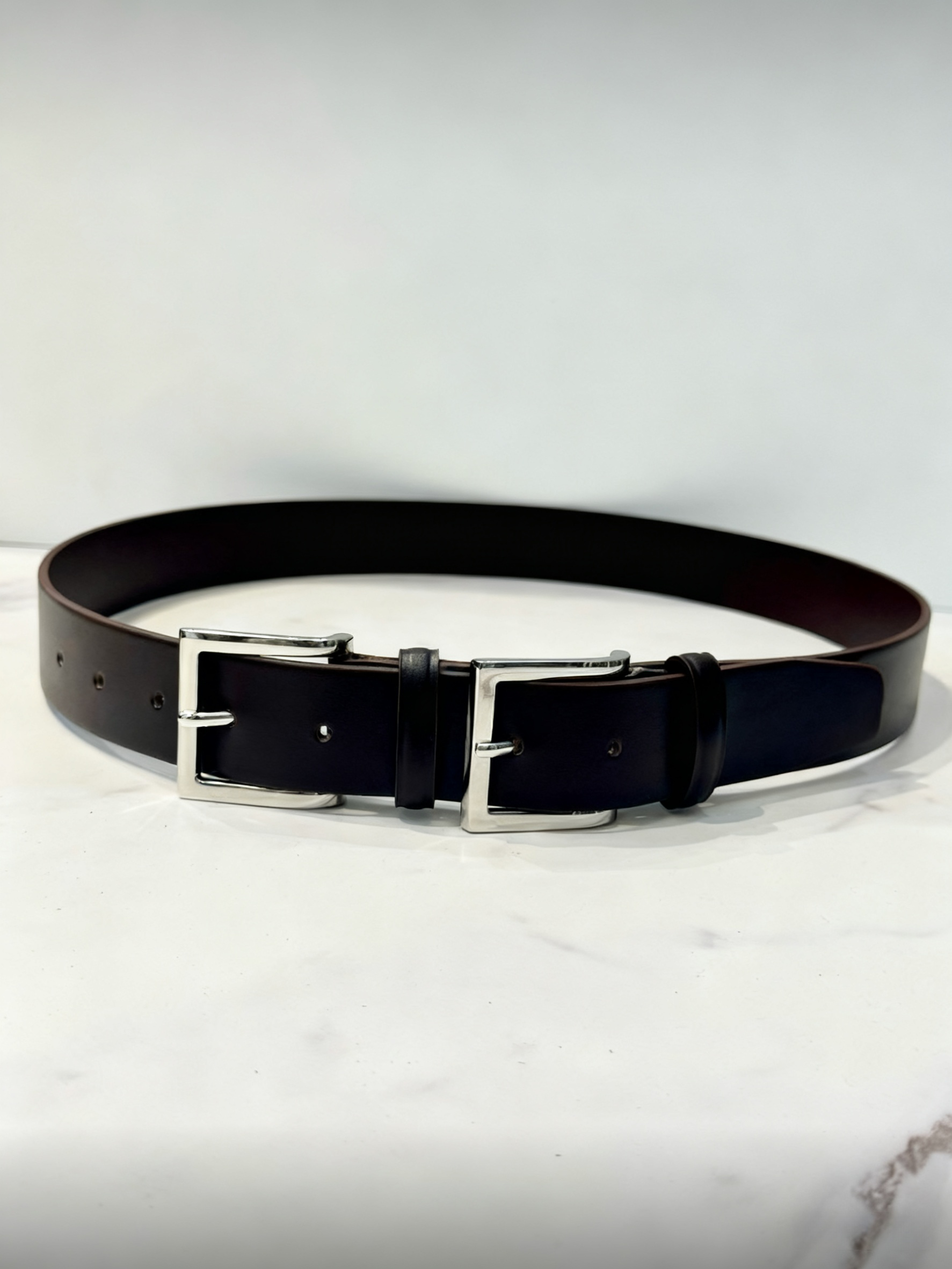設計與材質: 採用優質真牛皮製作,皮質厚實挺括,質感絕佳。最獨特的設計在於雙金屬釦環,兩個方正的銀色釦頭緊密並排,造型大膽前衛,充滿設計巧思。3.5公分的寬度適中,能強烈突顯腰線,是打造俐落穿搭疊穿造型的完美配件。