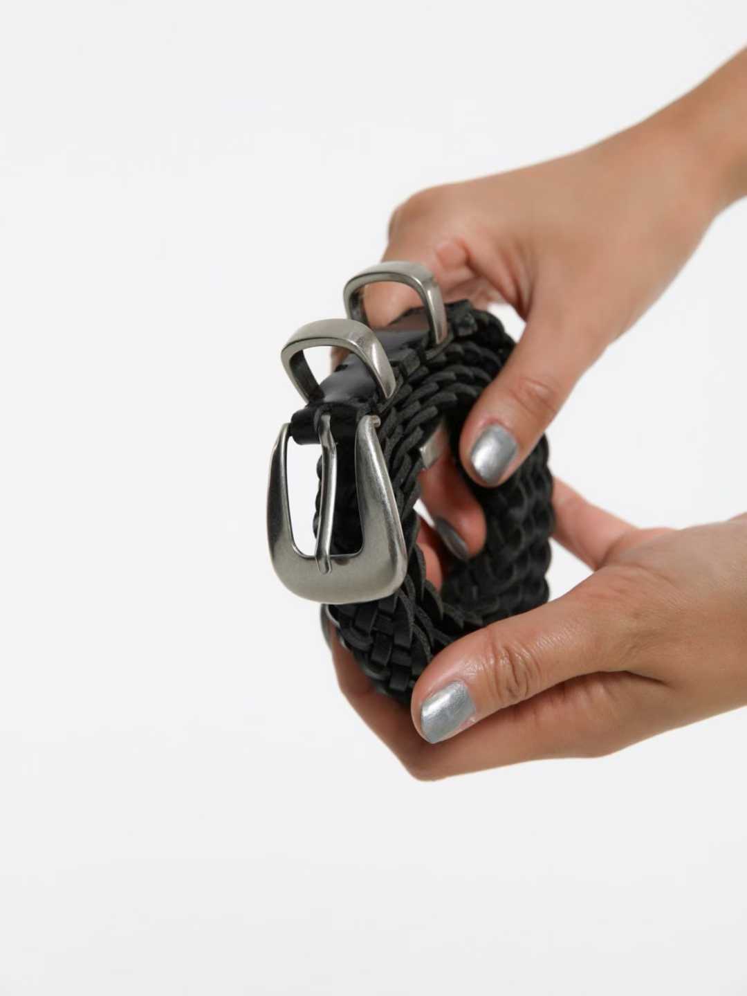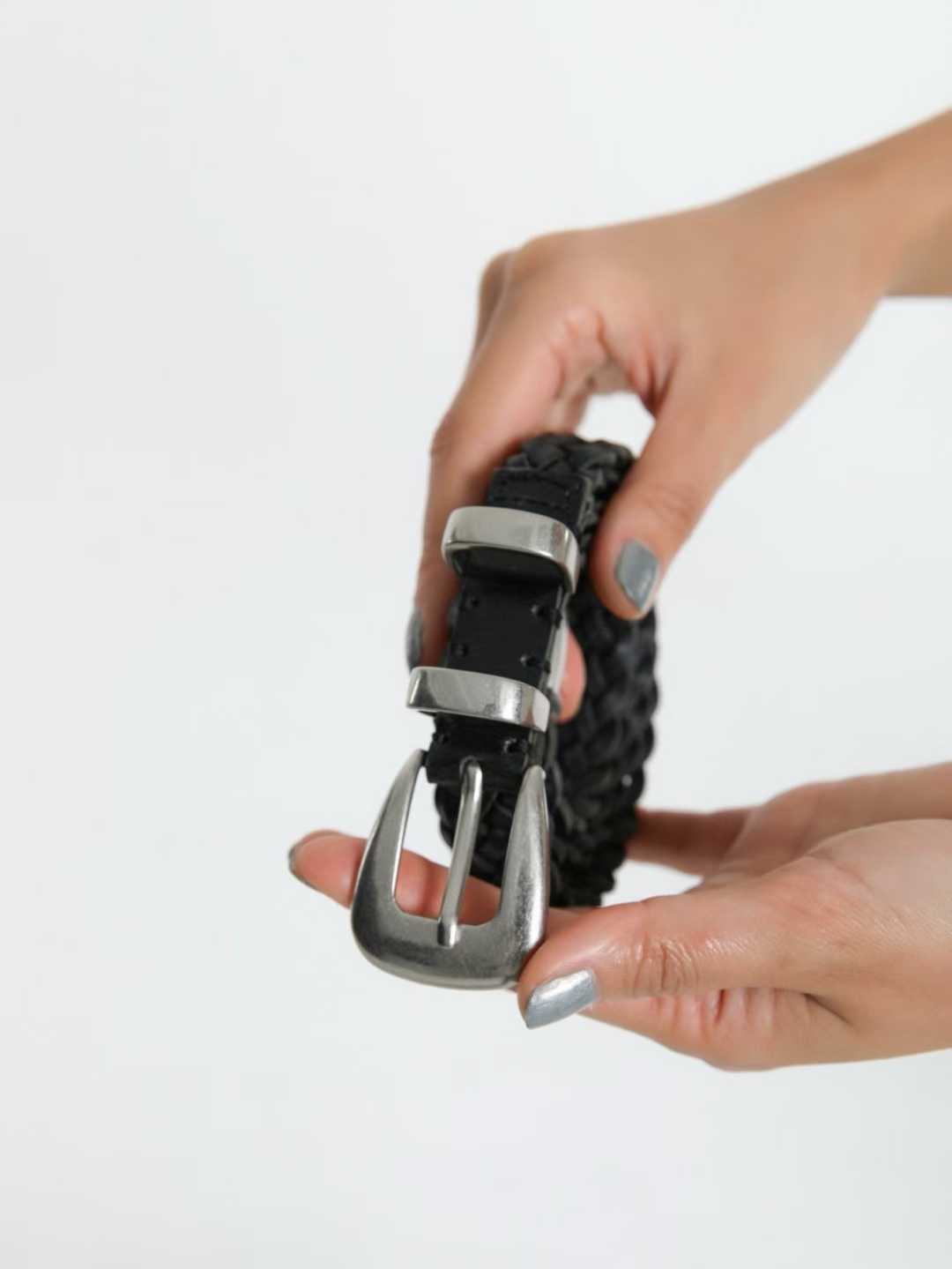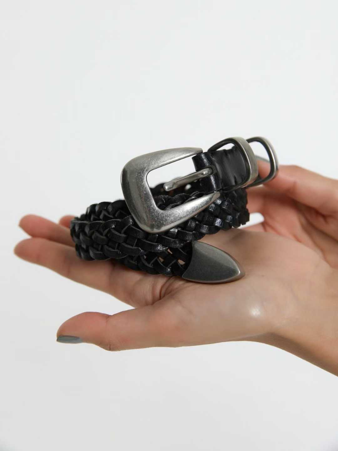 設計亮點: 腰帶配有復古銀色寬大金屬釦環,造型搶眼,充滿美式西部風情。尾端的金屬頭設計更是點睛之筆,讓整體造型更加俐落有型。由於是編織款式,可無段式調節,適用於任何腰圍。