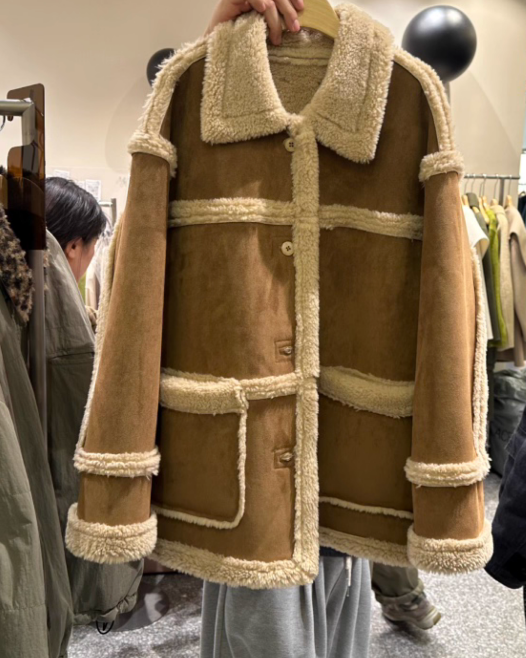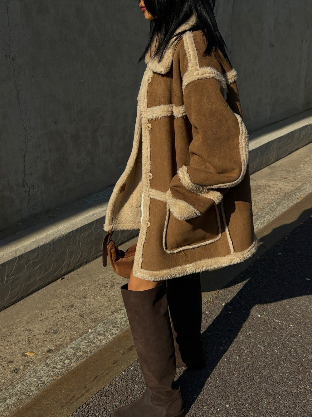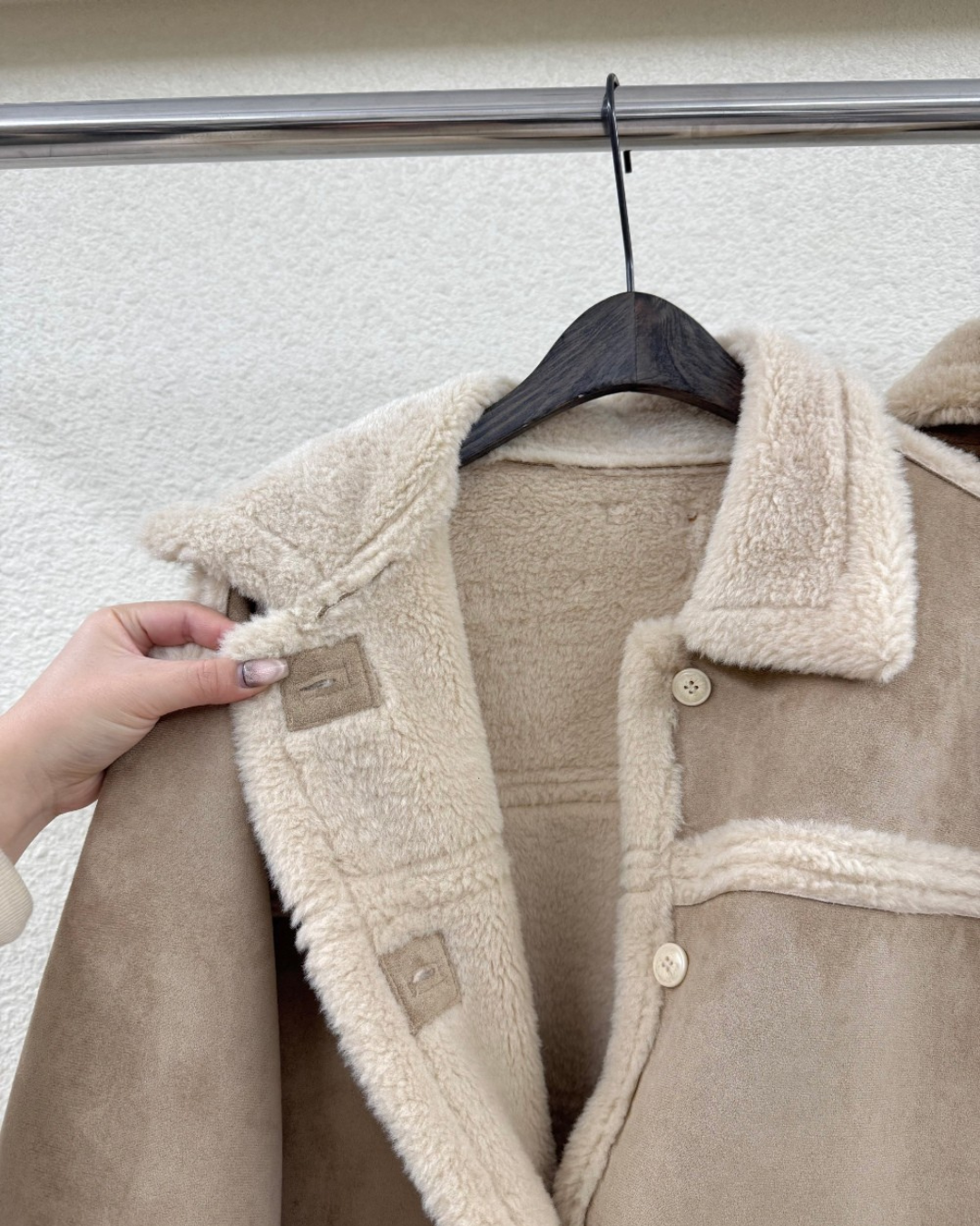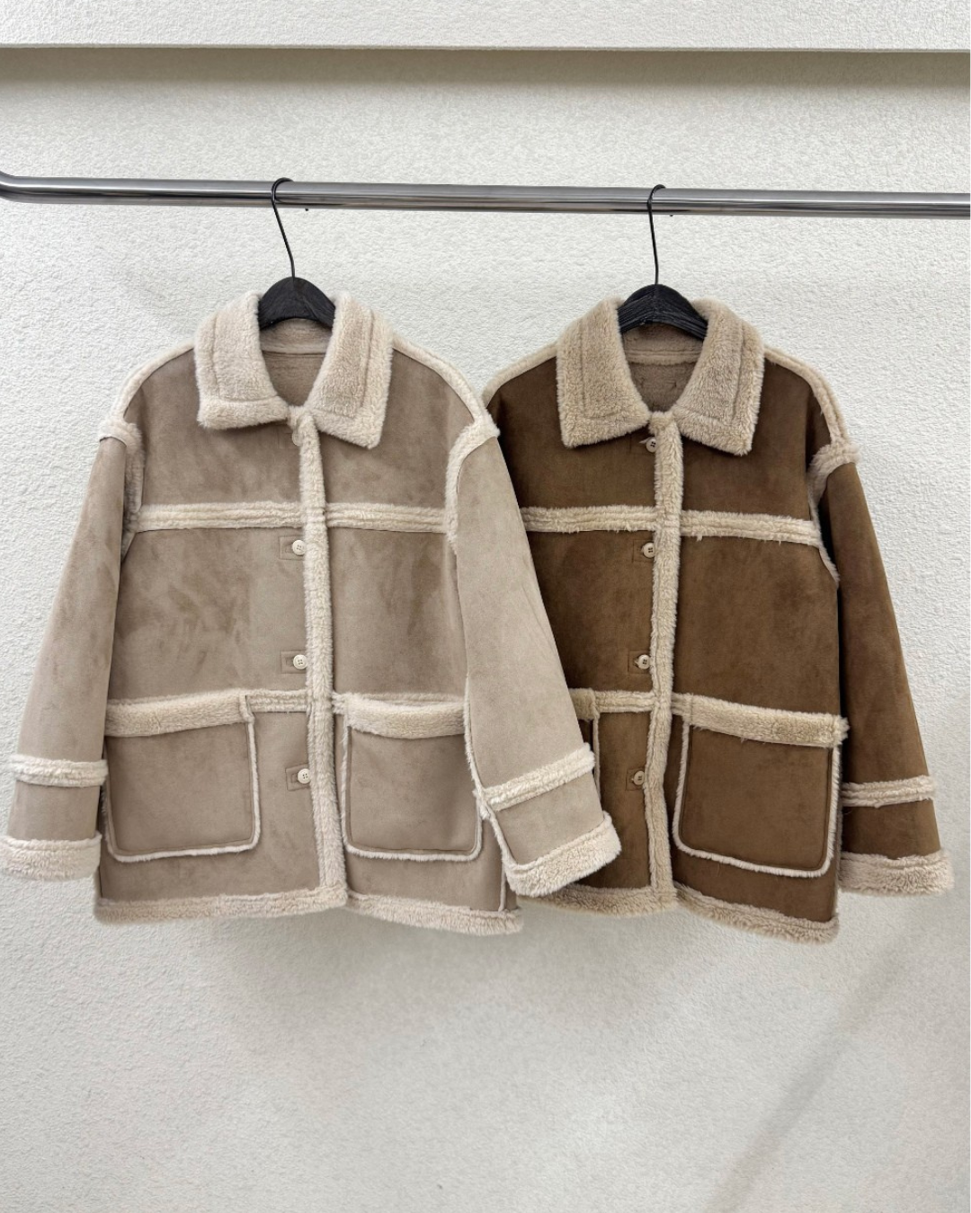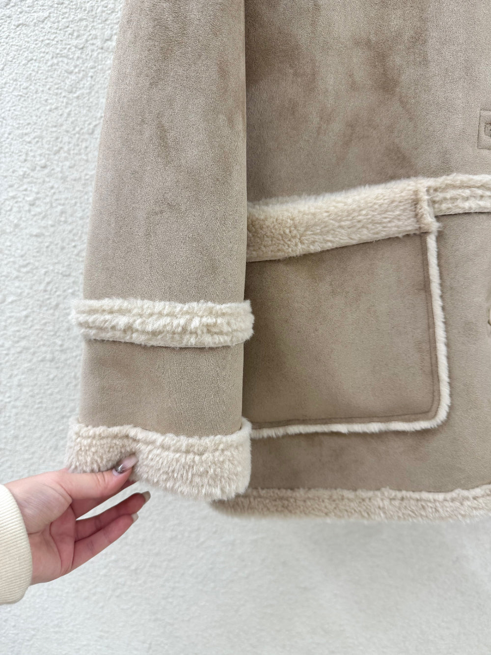 外套採用100%聚酯纖維 (Polyester) 面料製成,一面呈現質感麂皮/仿皮革的率性風格,另一面則為親膚細緻的羊羔毛/絨,兩種風格可隨意切換,輕鬆應對不同場合與心情!經典的Mustang機車夾克廓形搭配寬鬆的版型,不僅具備出色的防風保暖效果,視覺上也極致顯瘦,內搭毛衣也毫無束縛感。高領和袖口的毛絨細節設計,更增添了冬季的溫柔氣息。提供溫暖的駝色百搭的米色兩種質感色系,皆為均碼設計。立即擁有這件外套,用一件單品,輕鬆解鎖兩種頂級風格!