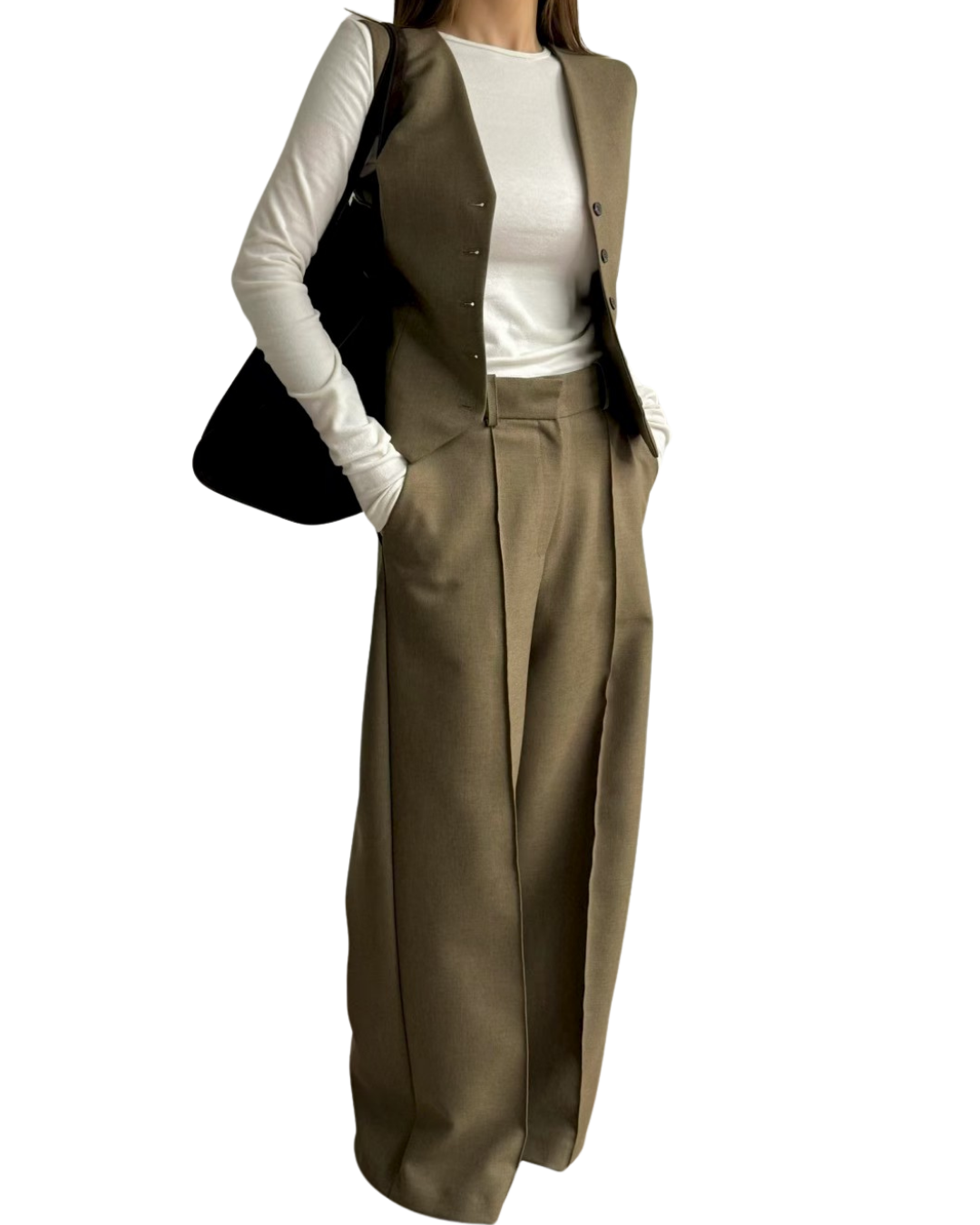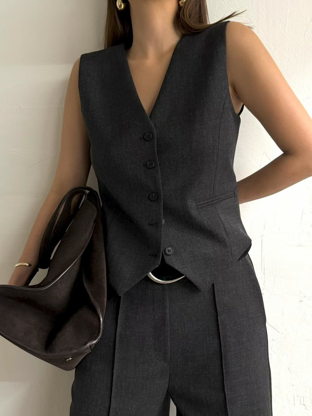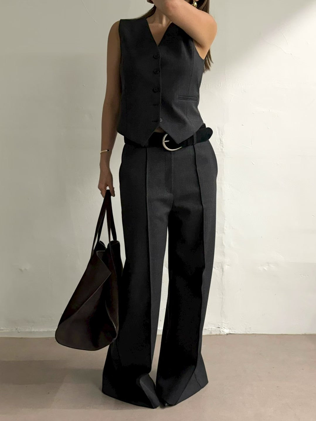 這套西裝馬甲背心搭配寬鬆直筒褲的兩件套裝是為追求簡約高效高級質感的您量身打造的年度熱銷單品!它完美解決了日常搭配的煩惱,以俐落的剪裁優雅的垂墜感,讓您輕鬆成為職場或休閒場合的時尚焦點.