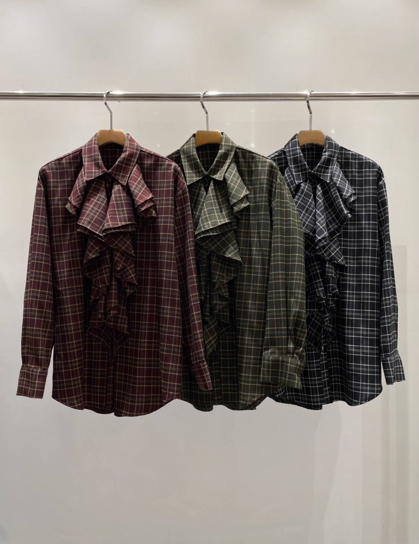TP22073- 韓國設計師款復古浪漫格紋荷葉邊長袖襯衫