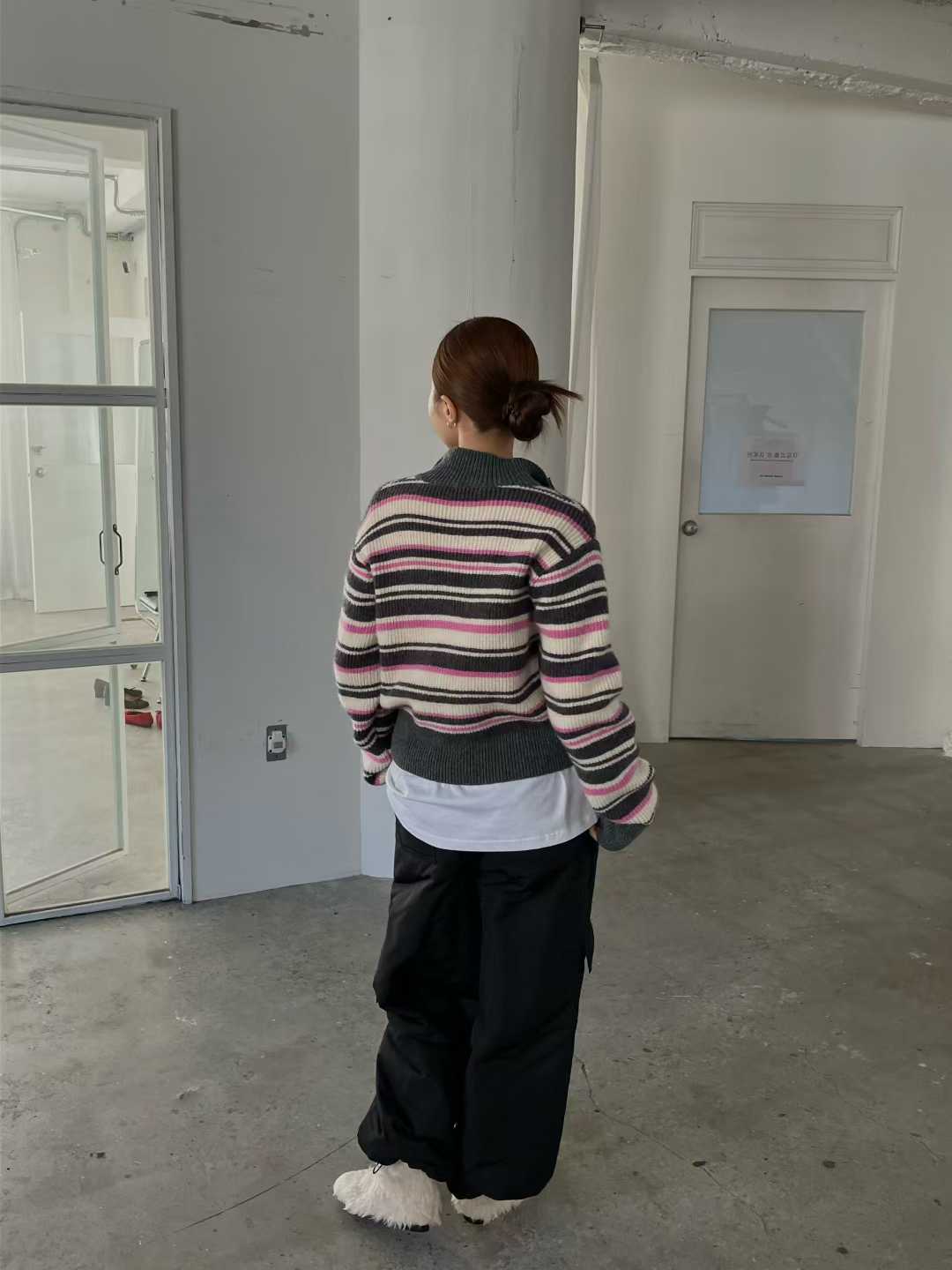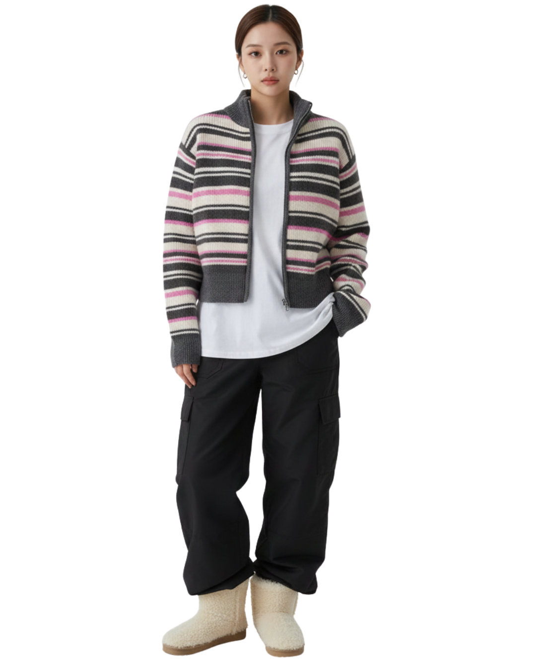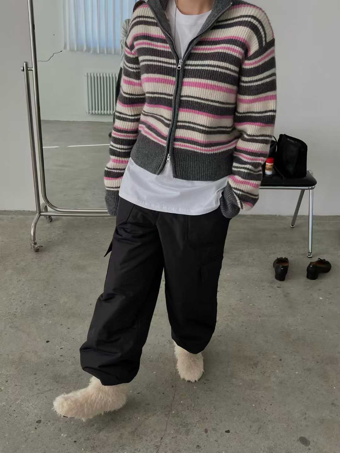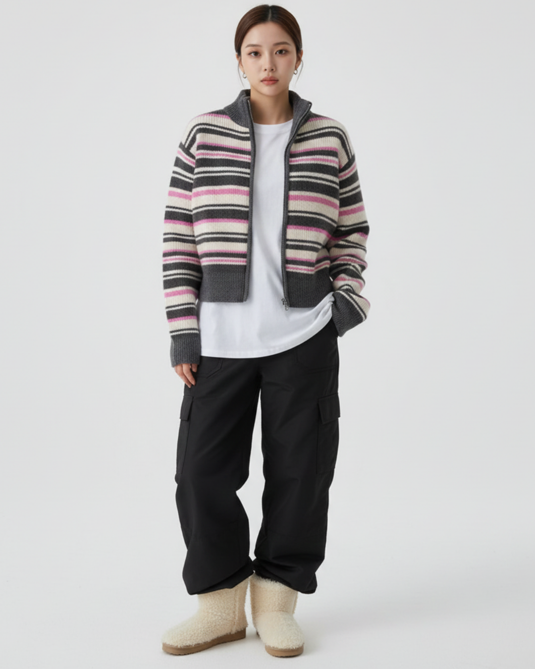 這款頂級條紋針織外套是為追求舒適慵懶韓系經典風格的您量身打造。它結合了多種奢華材質,提供極致的溫暖感,成為您衣櫥中最具親膚性百搭性的秋冬外套!
