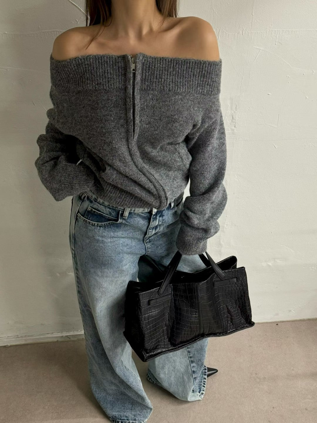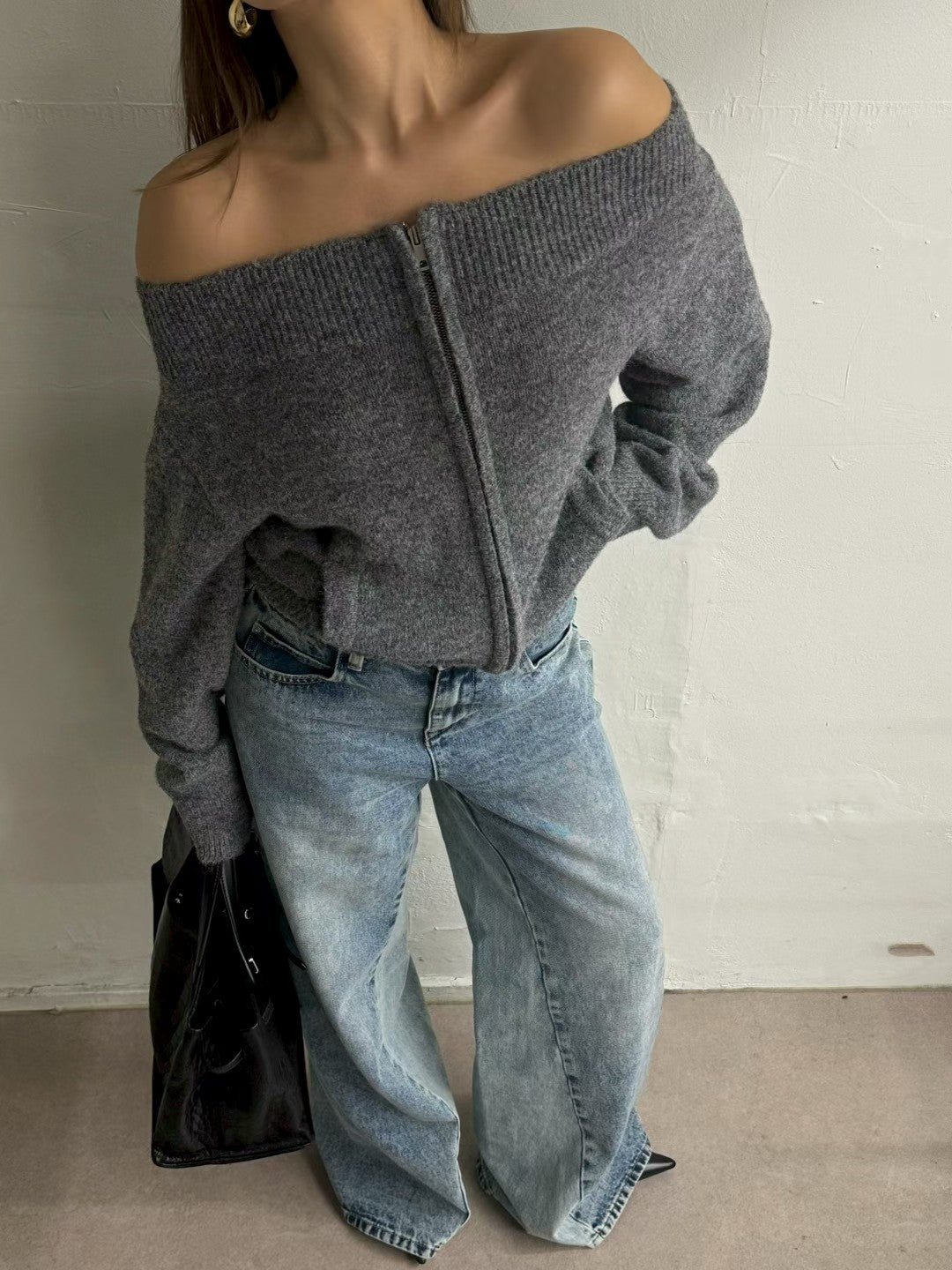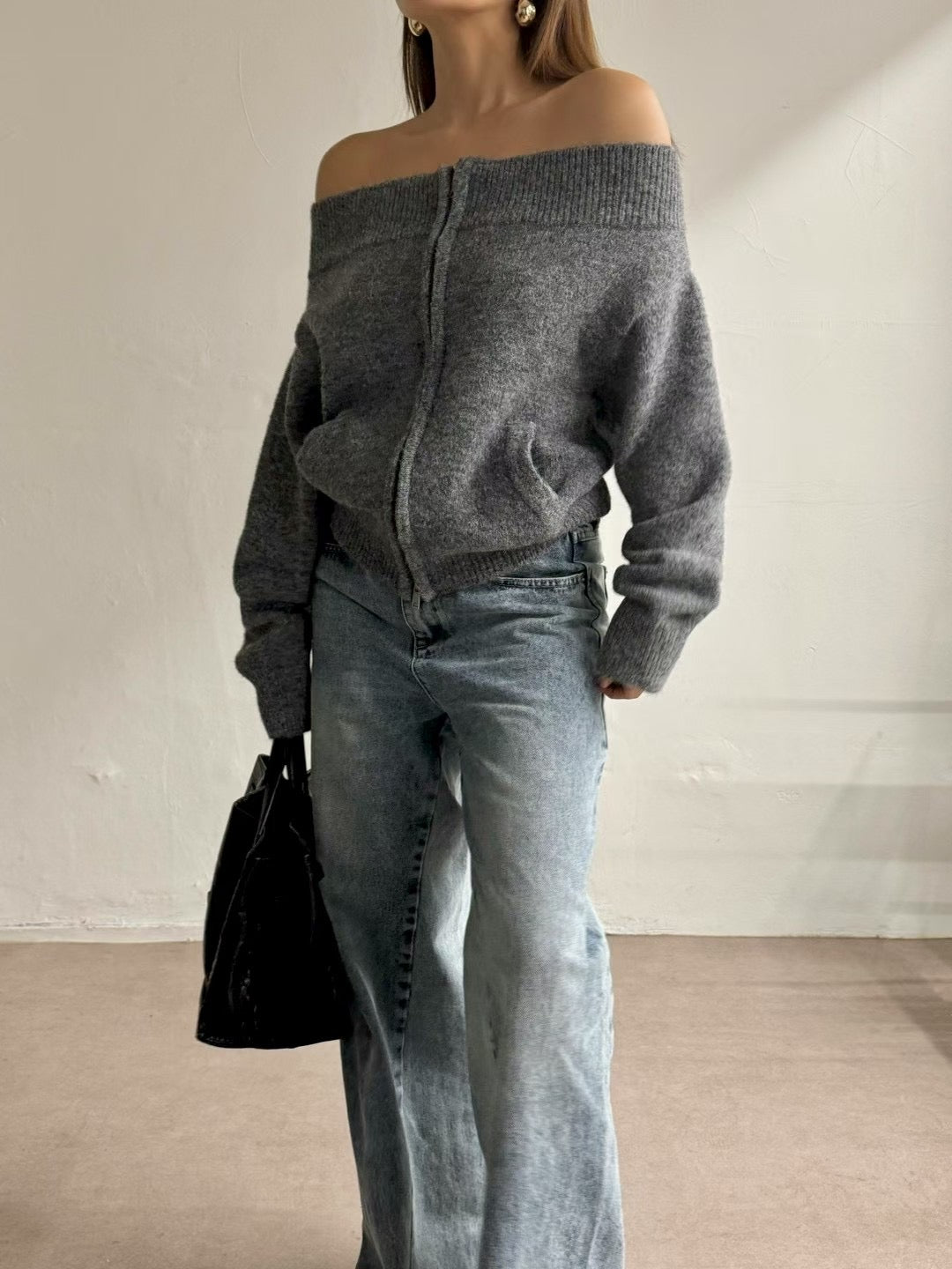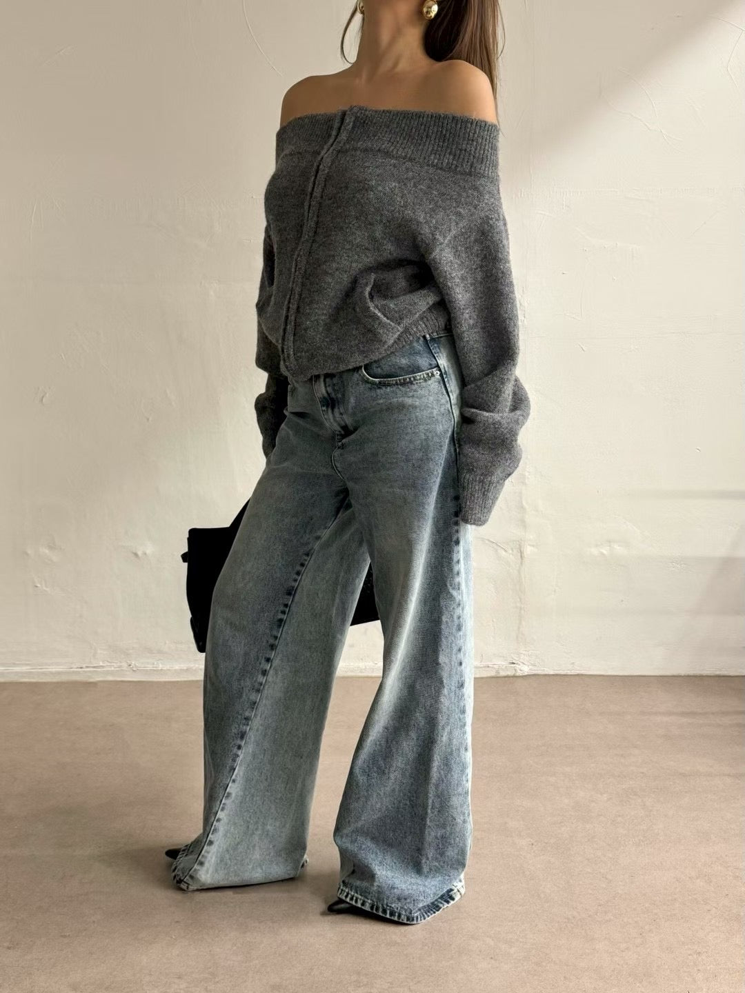 法式浪漫:羊毛混紡一字領寬鬆針織衫