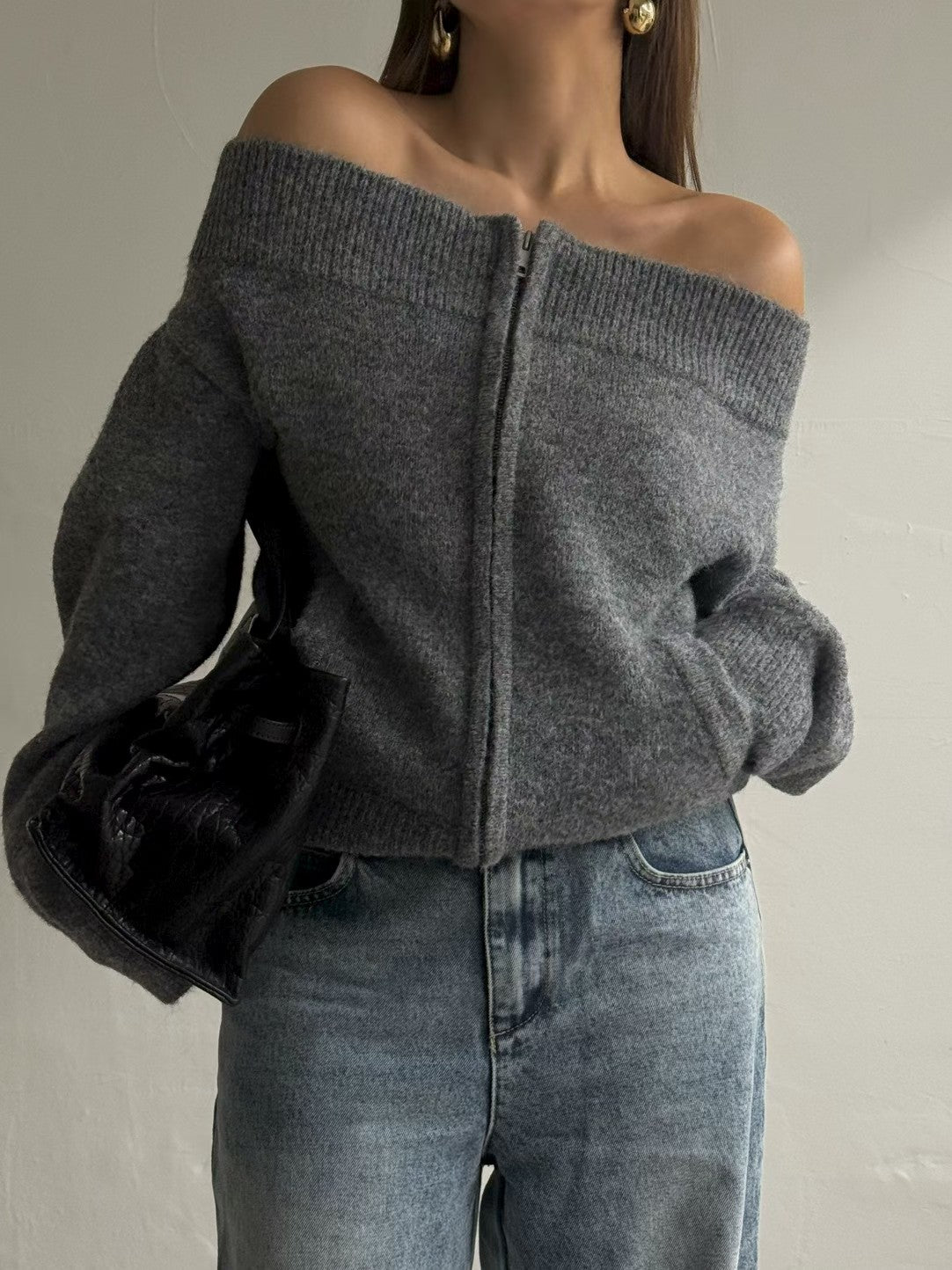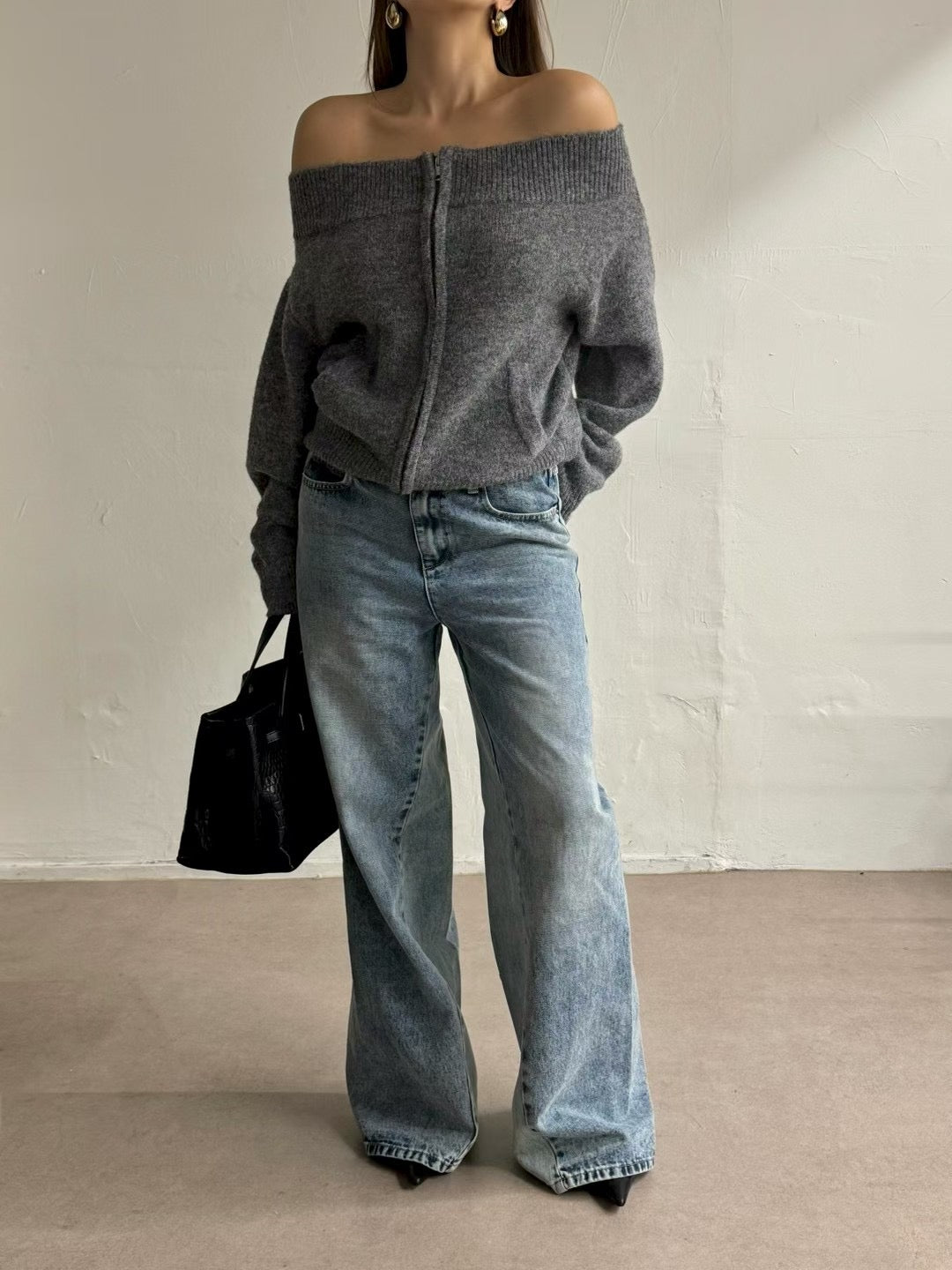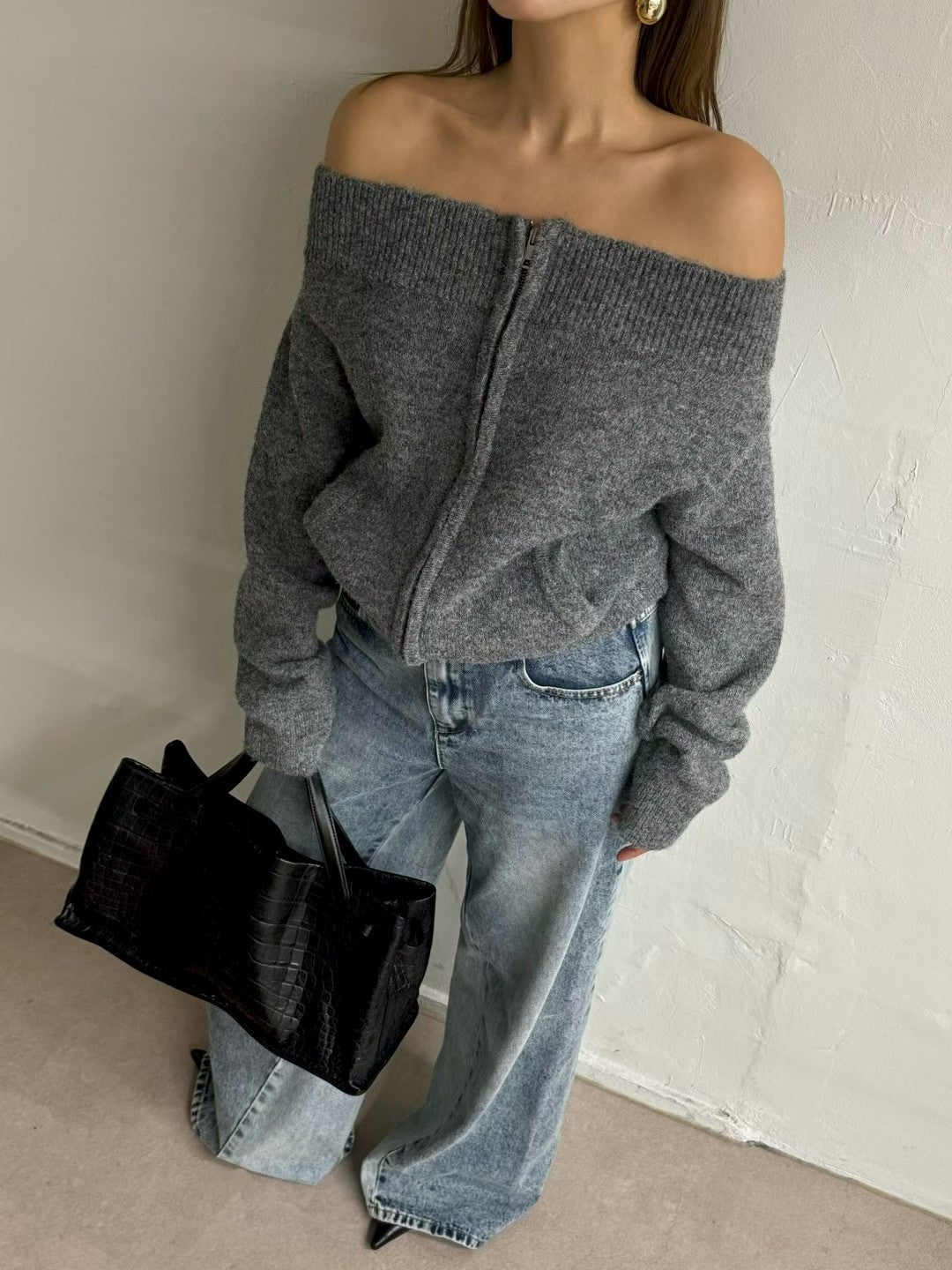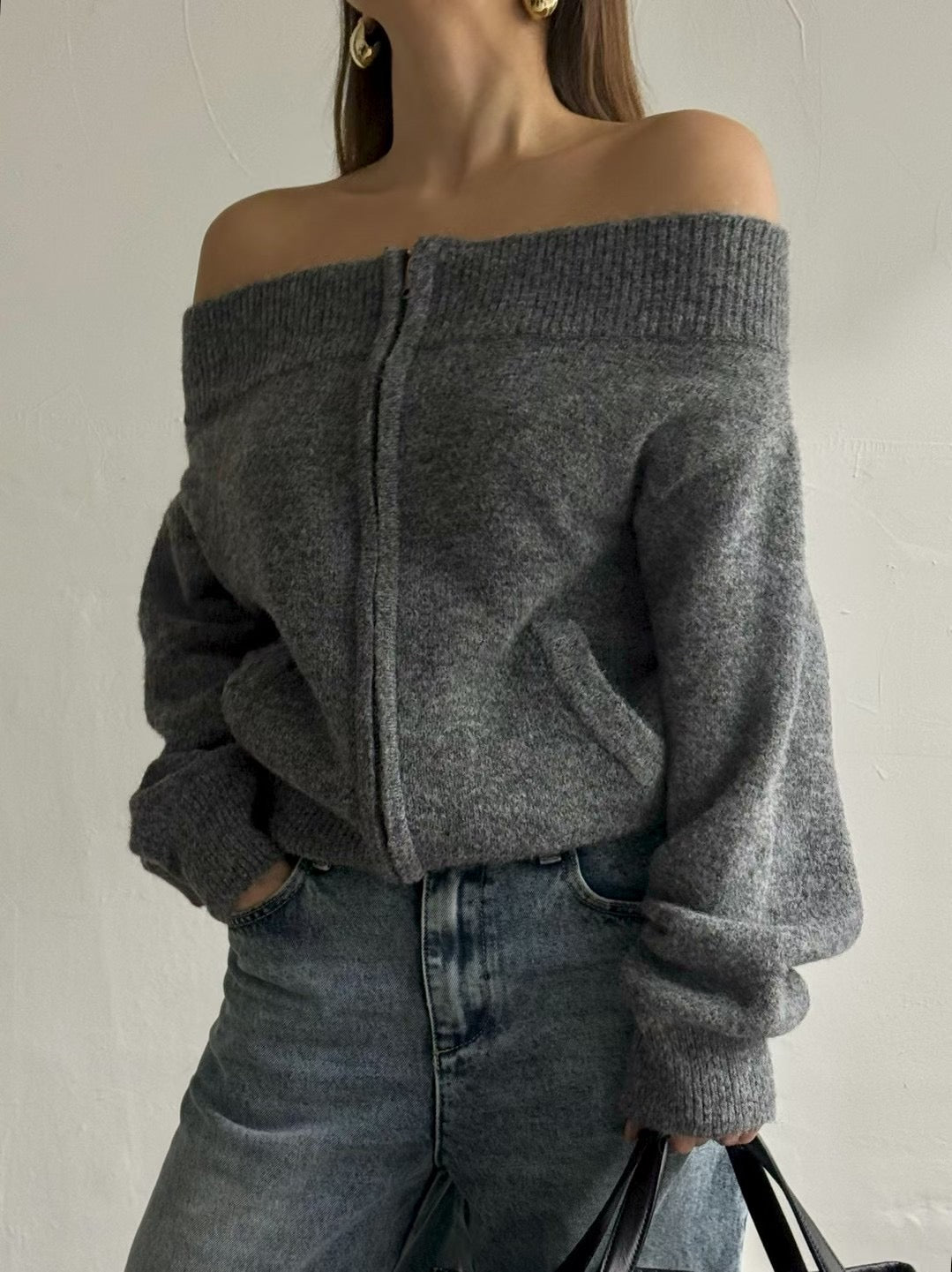 法式浪漫:羊毛混紡一字領寬鬆針織衫