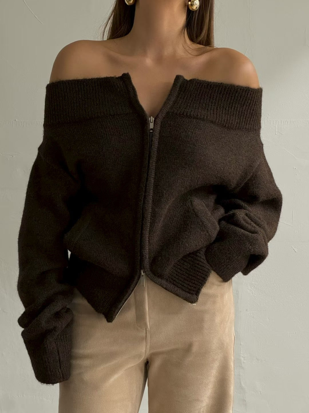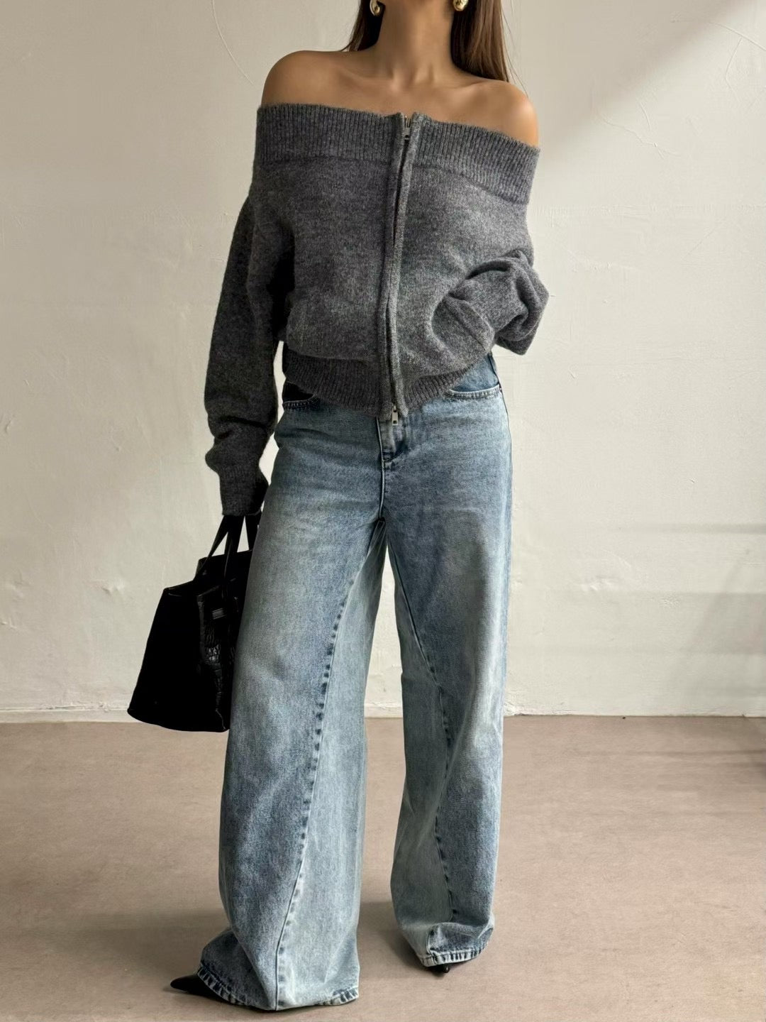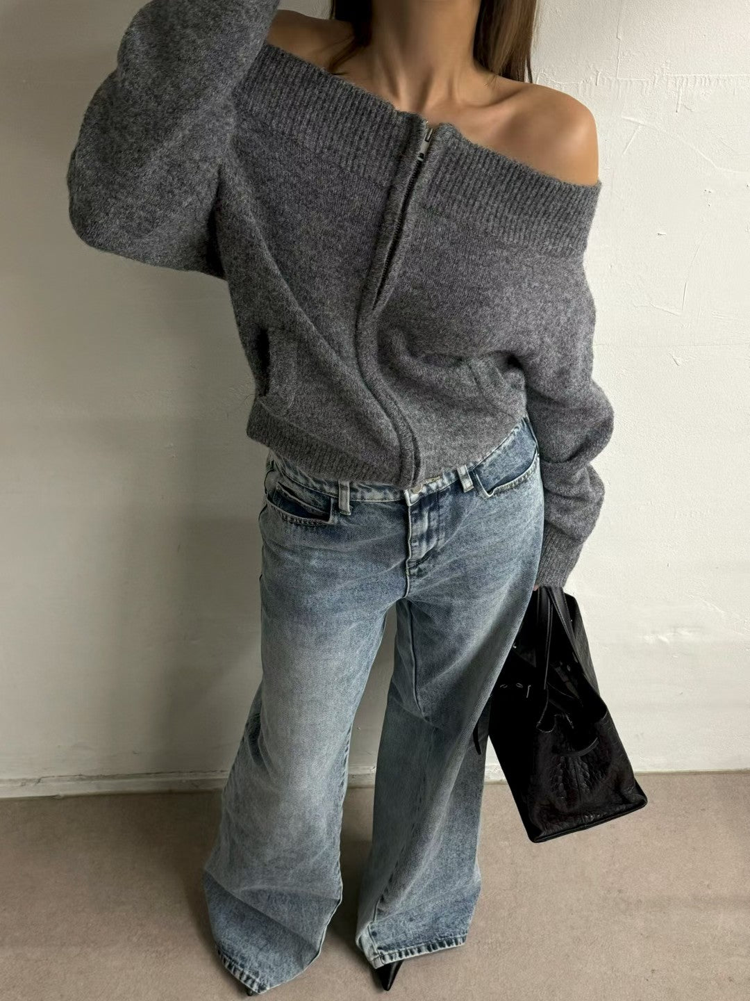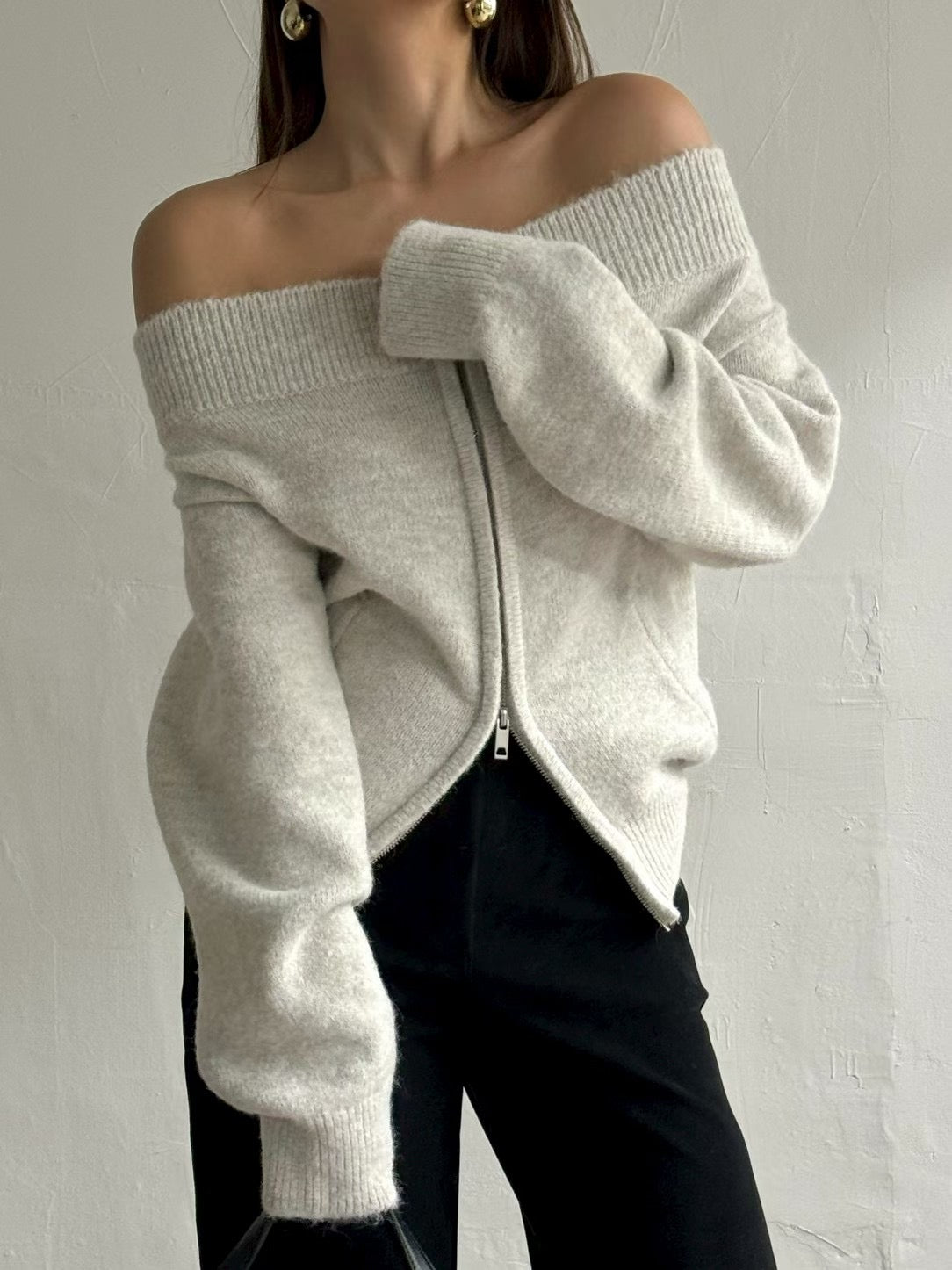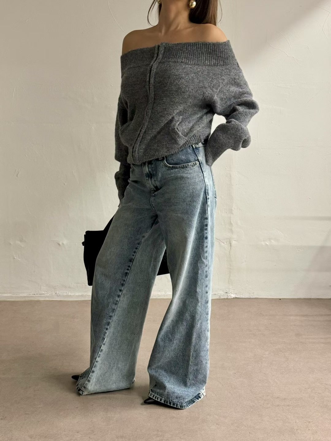 法式浪漫:羊毛混紡一字領寬鬆針織衫