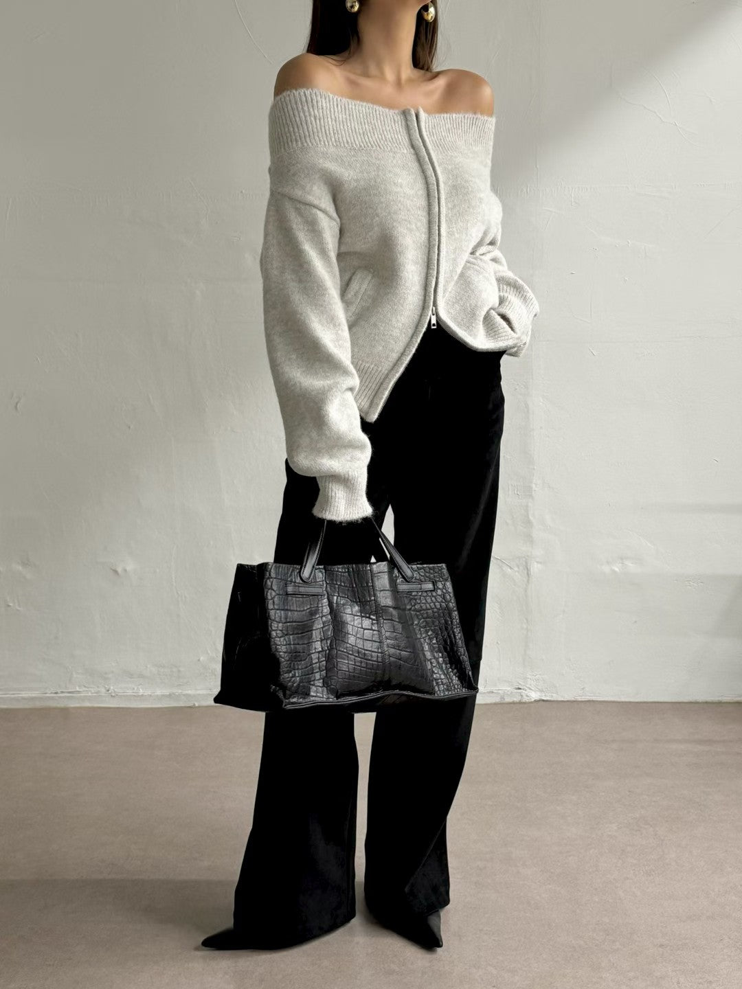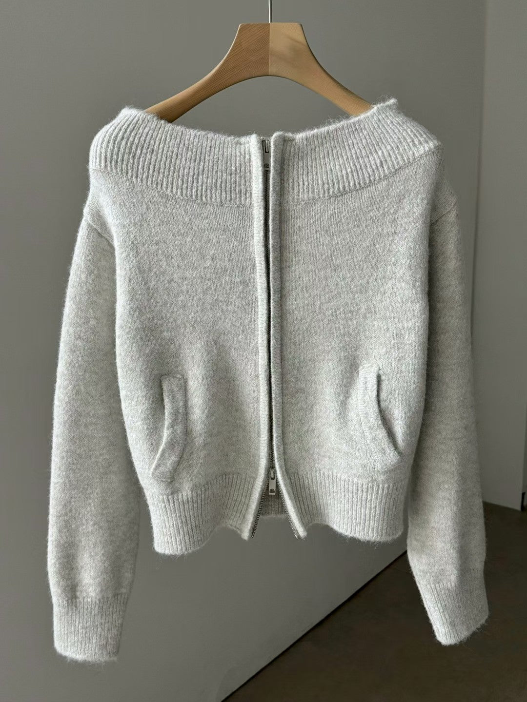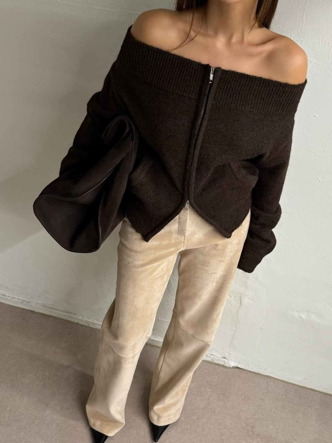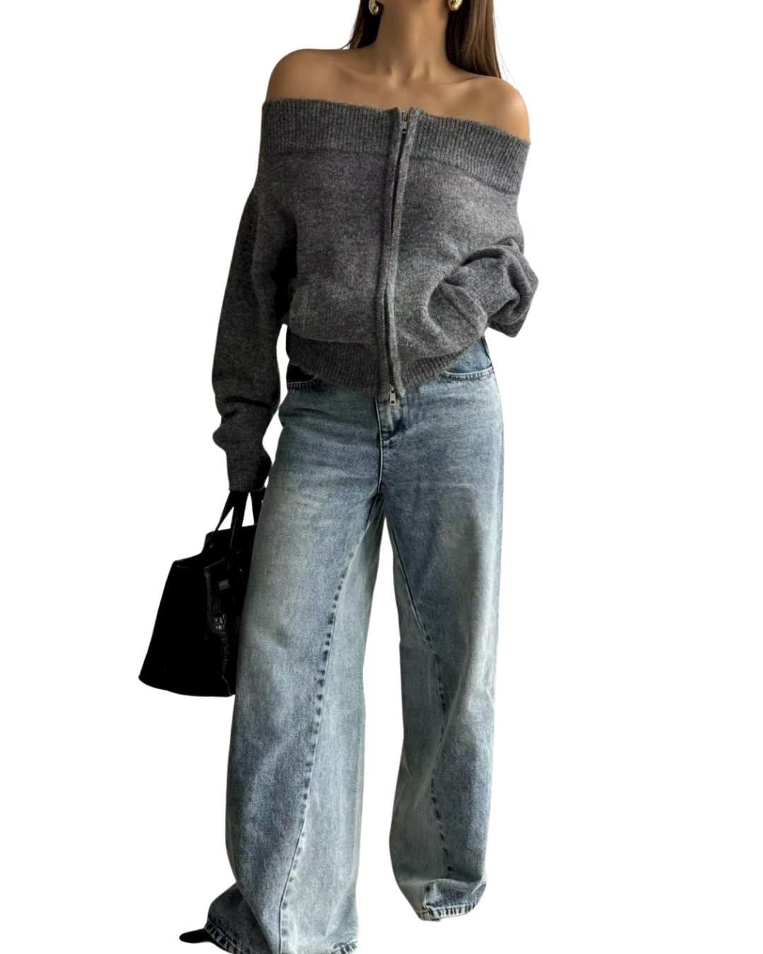 法式浪漫:羊毛混紡一字領寬鬆針織衫