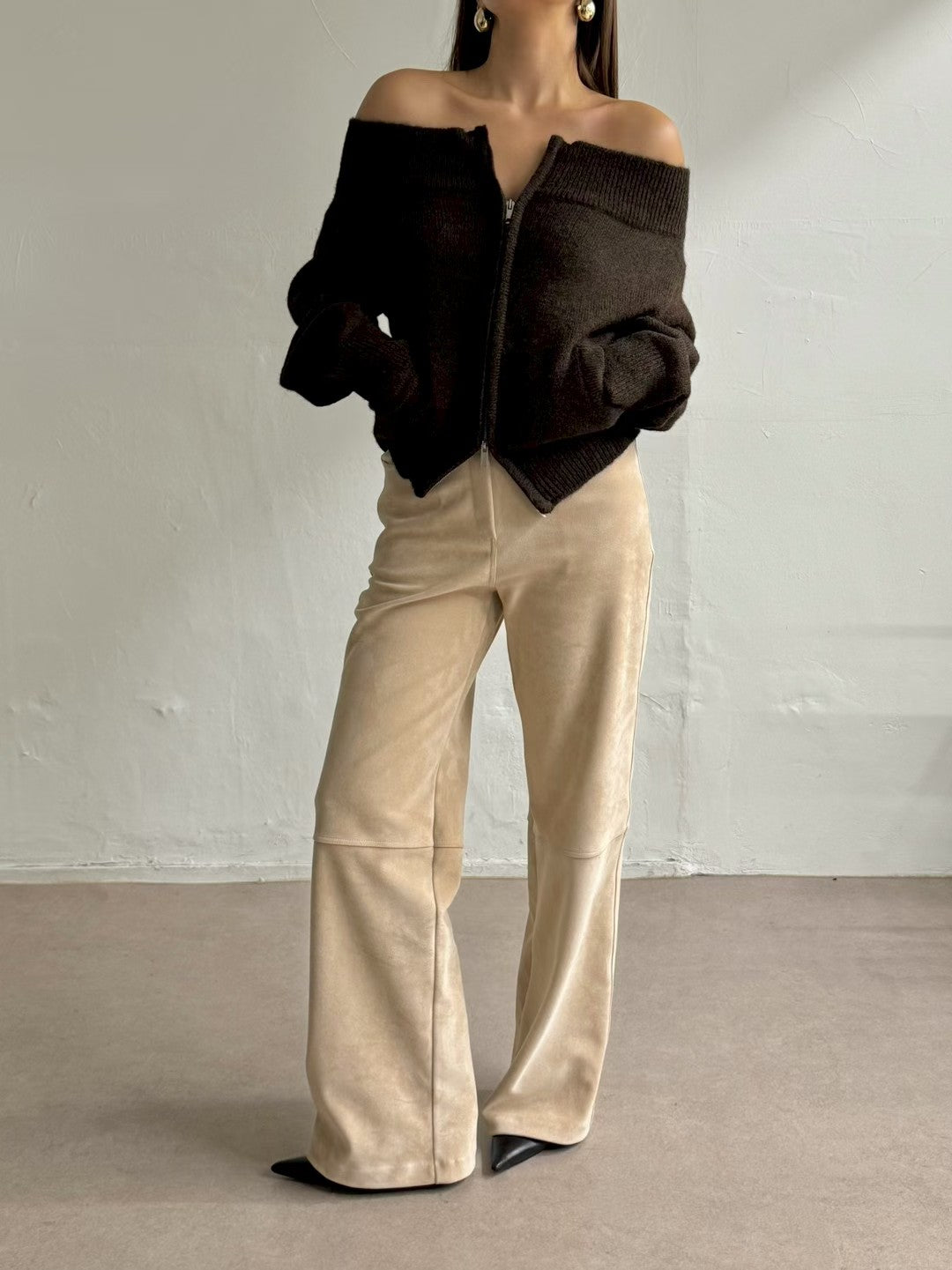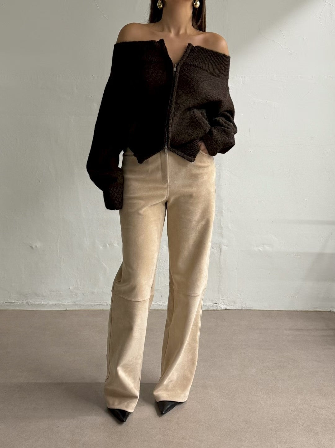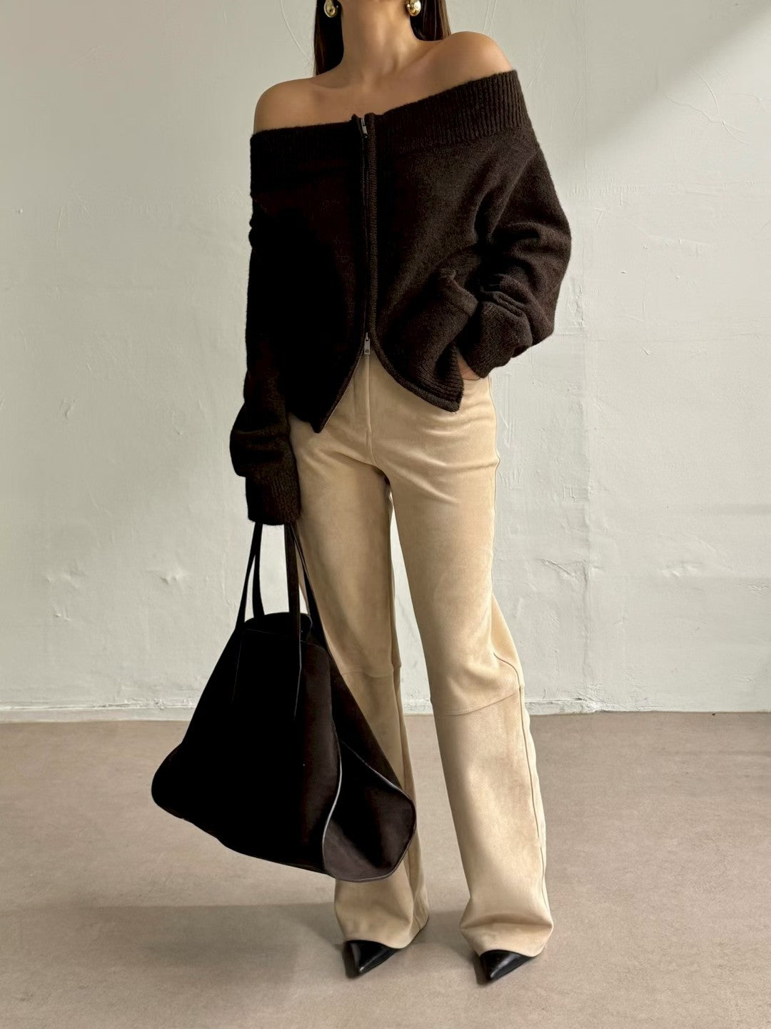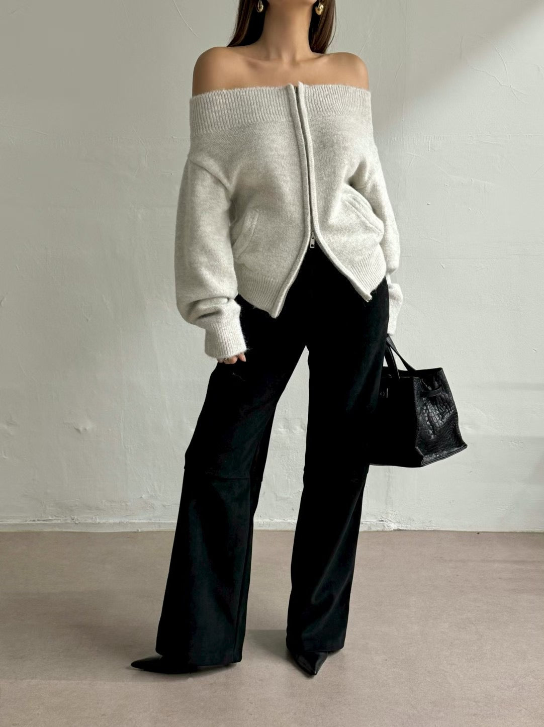 法式浪漫:羊毛混紡一字領寬鬆針織衫