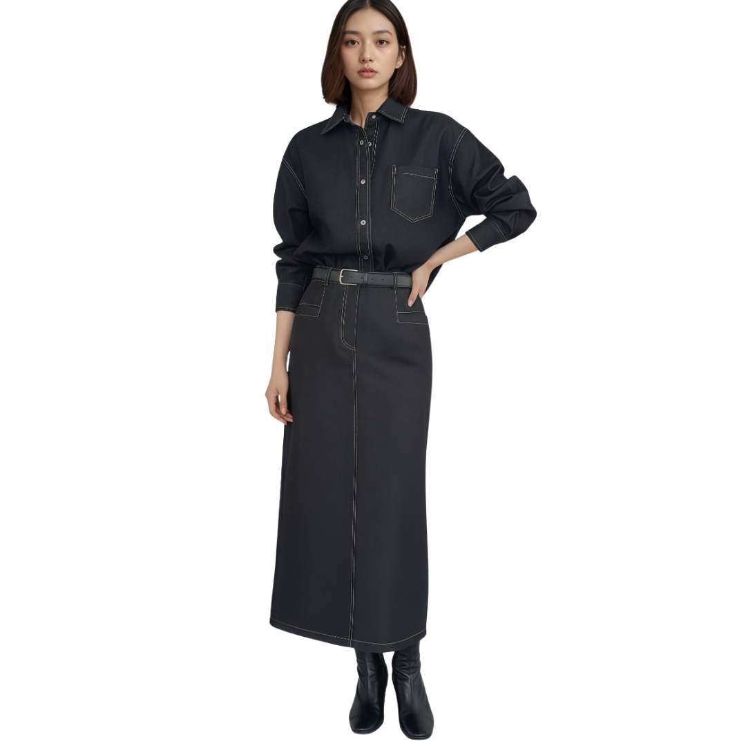 • 及膝A字長裙: 俐落的直筒剪裁,顯高顯瘦,腰線設計自然,既能拉長腿部比例,又確保了穿著的舒適度。裙身的縫線細節與襯衫相互呼應,形成和諧統一的整體。
