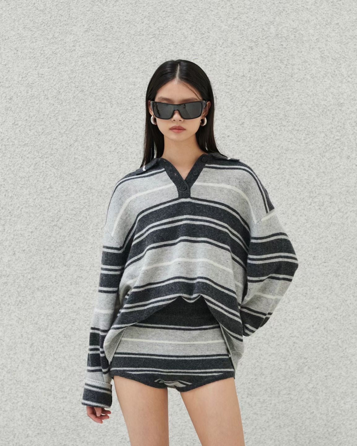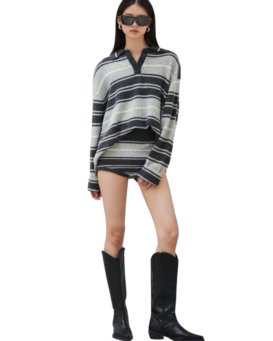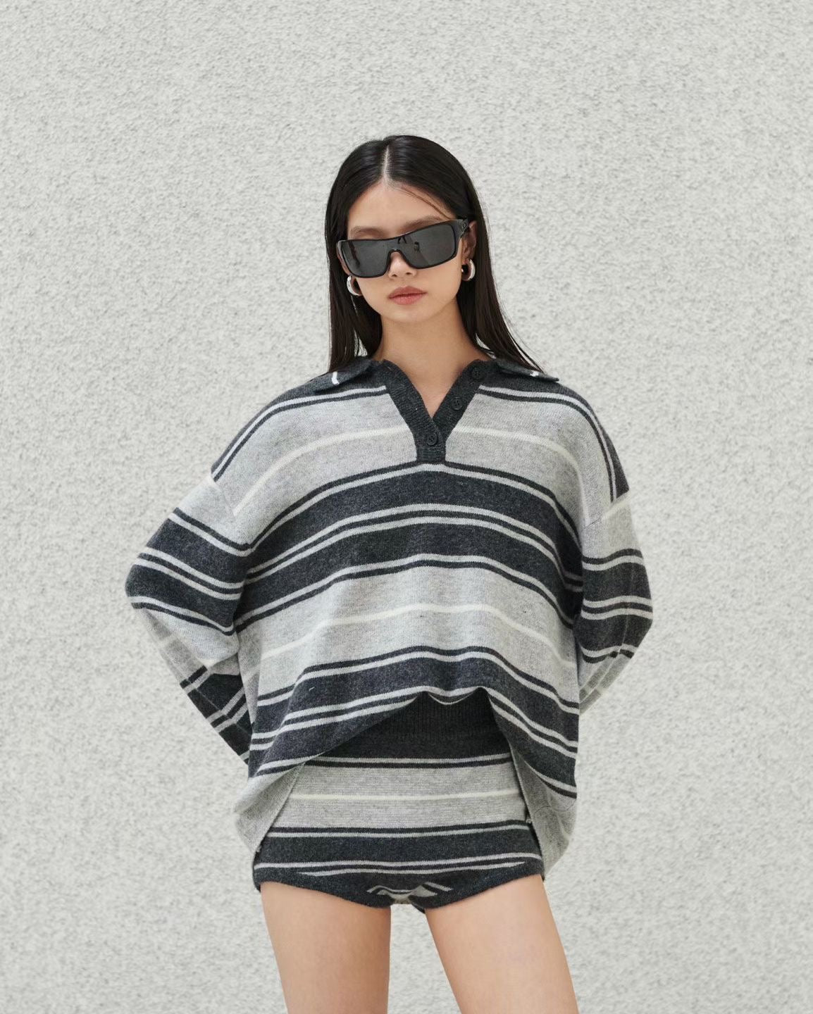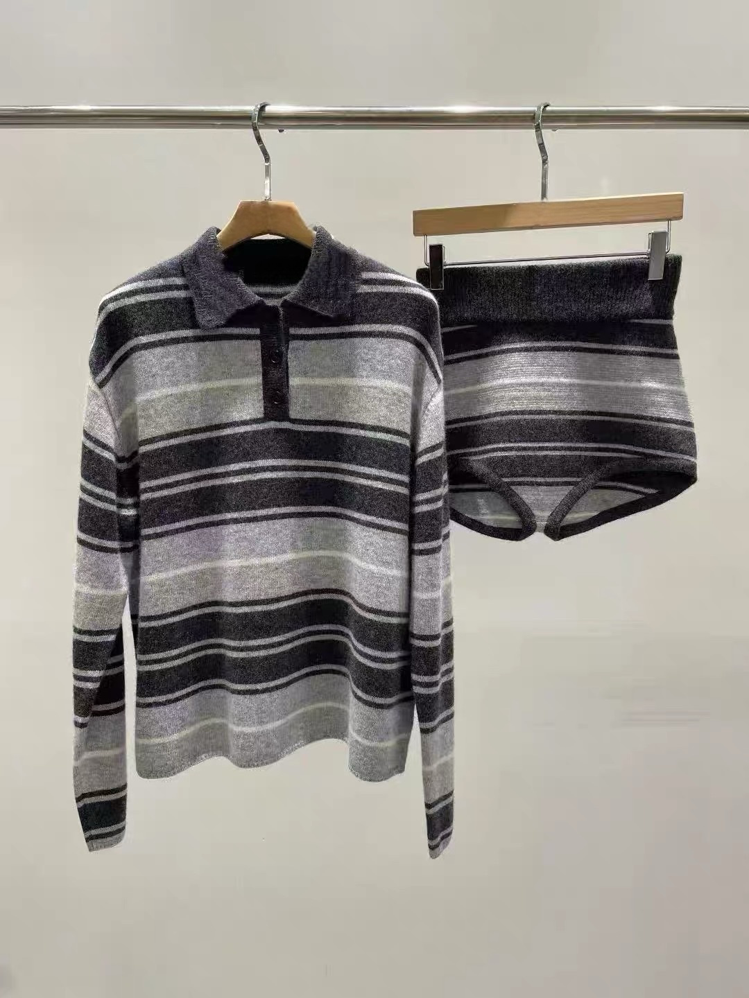 這套條紋針織POLO短褲套裝,完美結合了復古學院風與 Y2K 潮流的性感活力,是為追求前衛與舒適的你量身打造的潮流單品。