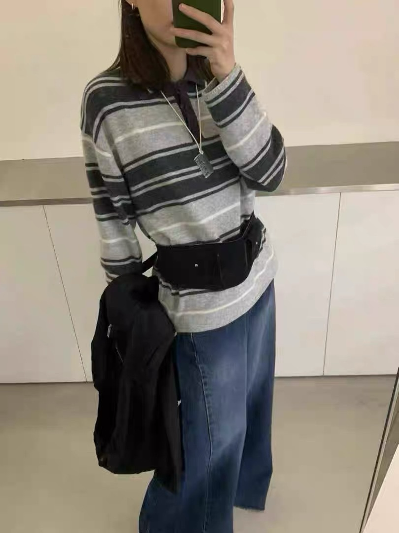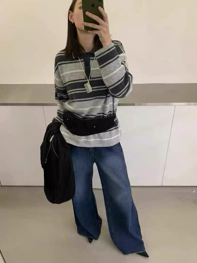 上衣採用寬鬆短版針織POLO衫設計,柔軟親膚的面料與經典的多色條紋圖案,營造出隨性又充滿層次感的復古氛圍。POLO領口與鈕釦細節,增添了學院的精緻感。