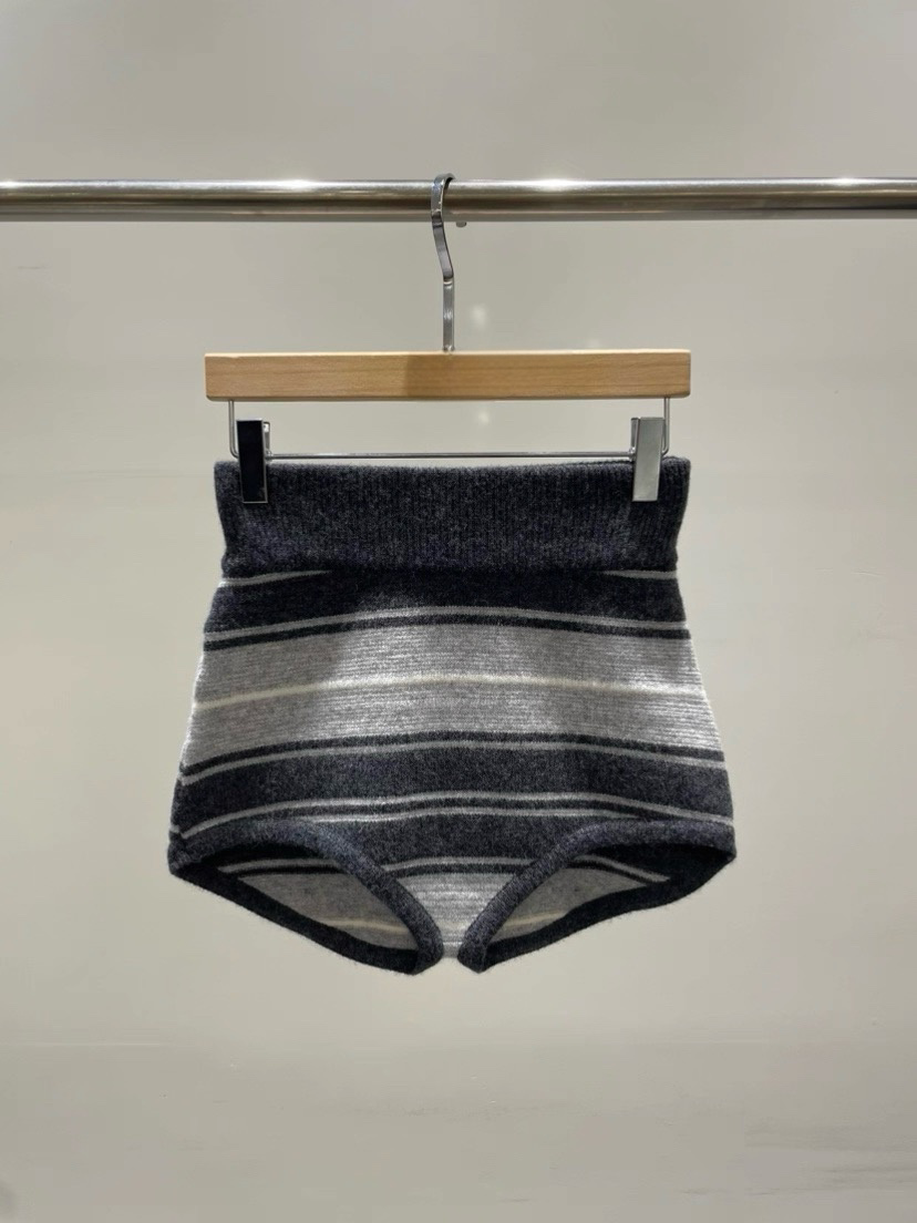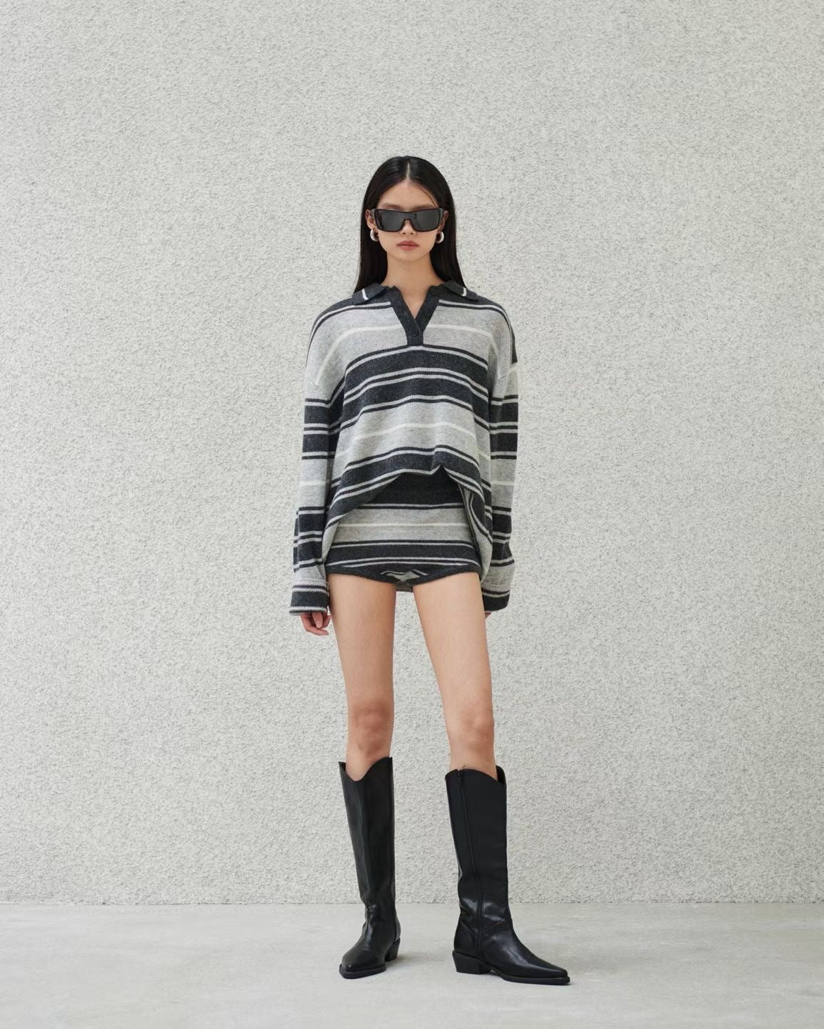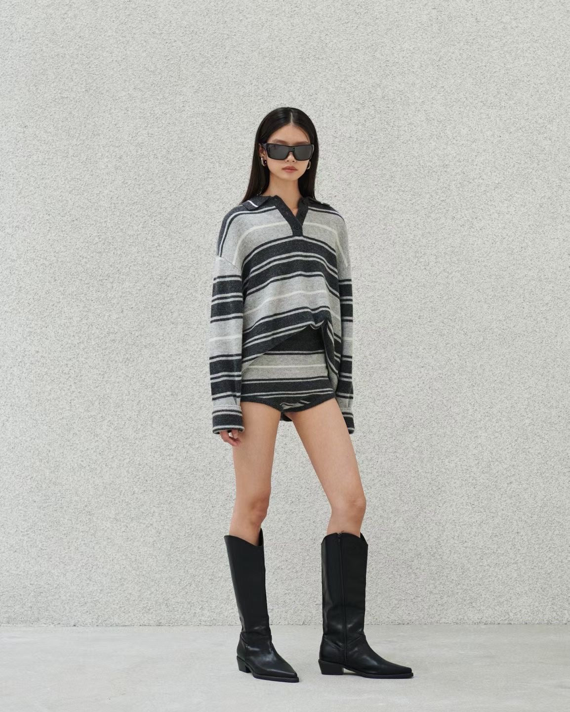 下半身針織短褲採用與上衣完全一致的條紋和面料,形成和諧統一的套裝造型。短褲版型極短,在視覺上極大化拉長腿部比例,搭配長靴,輕鬆打造出下身失蹤的潮流風格,性感又前衛。