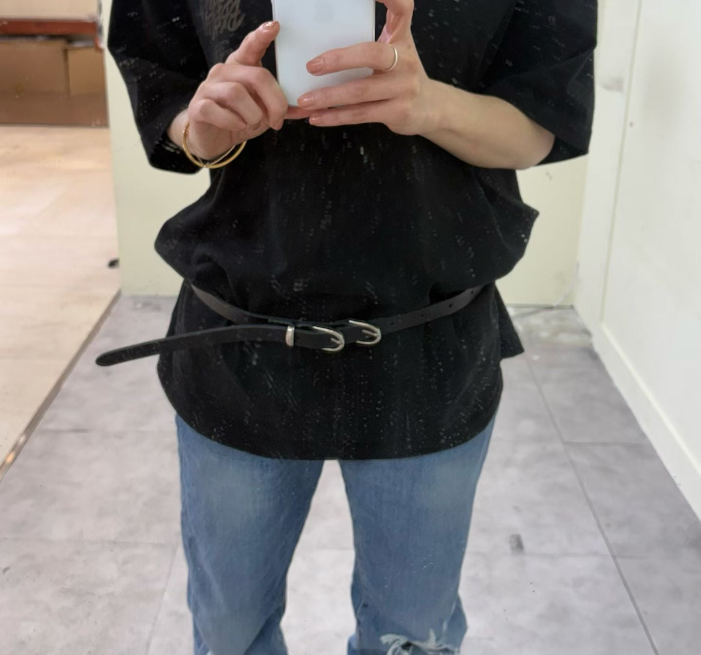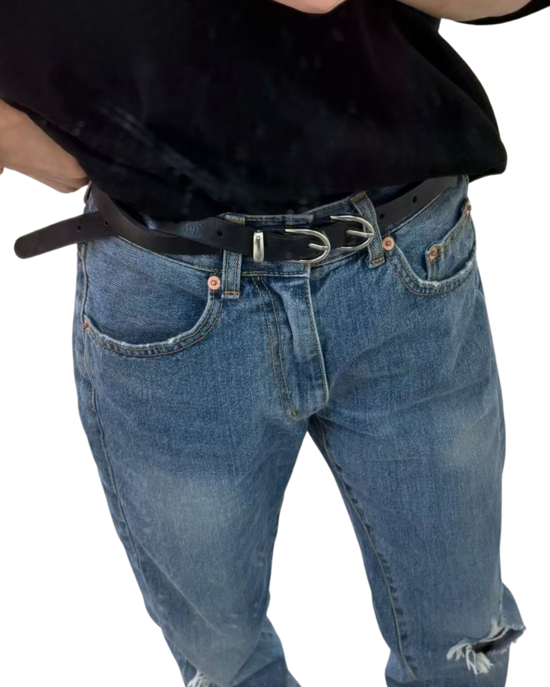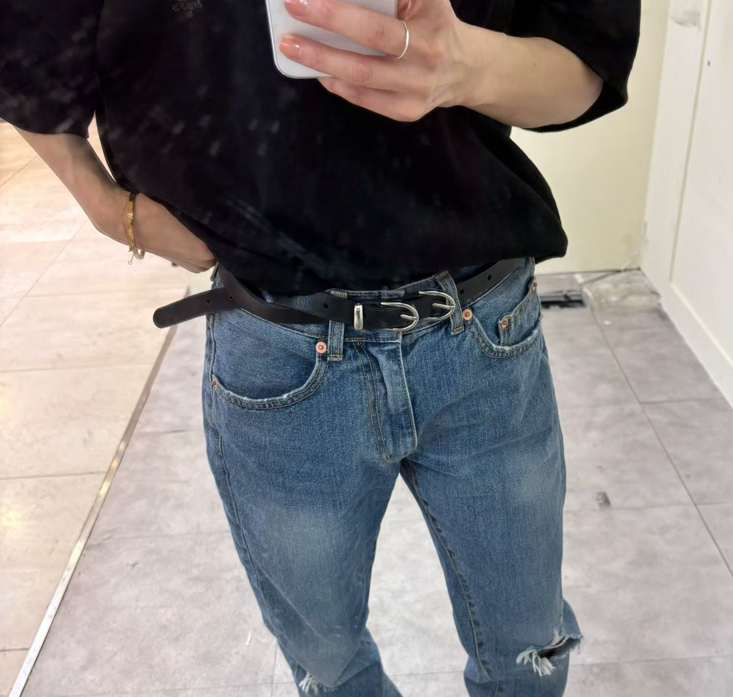 頂級材質與設計: 皮帶採用優質牛皮(소 가죽 통가죽)製作,皮質紮實且經久耐用,展現出紮實的質感。最大的亮點是兩個緊密相連的銀色金屬圓弧釦環,這種雙環設計充滿了復古與西部潮流的風格,極具辨識度。皮帶寬度適中,屬於細版設計,能優雅地收束腰線。