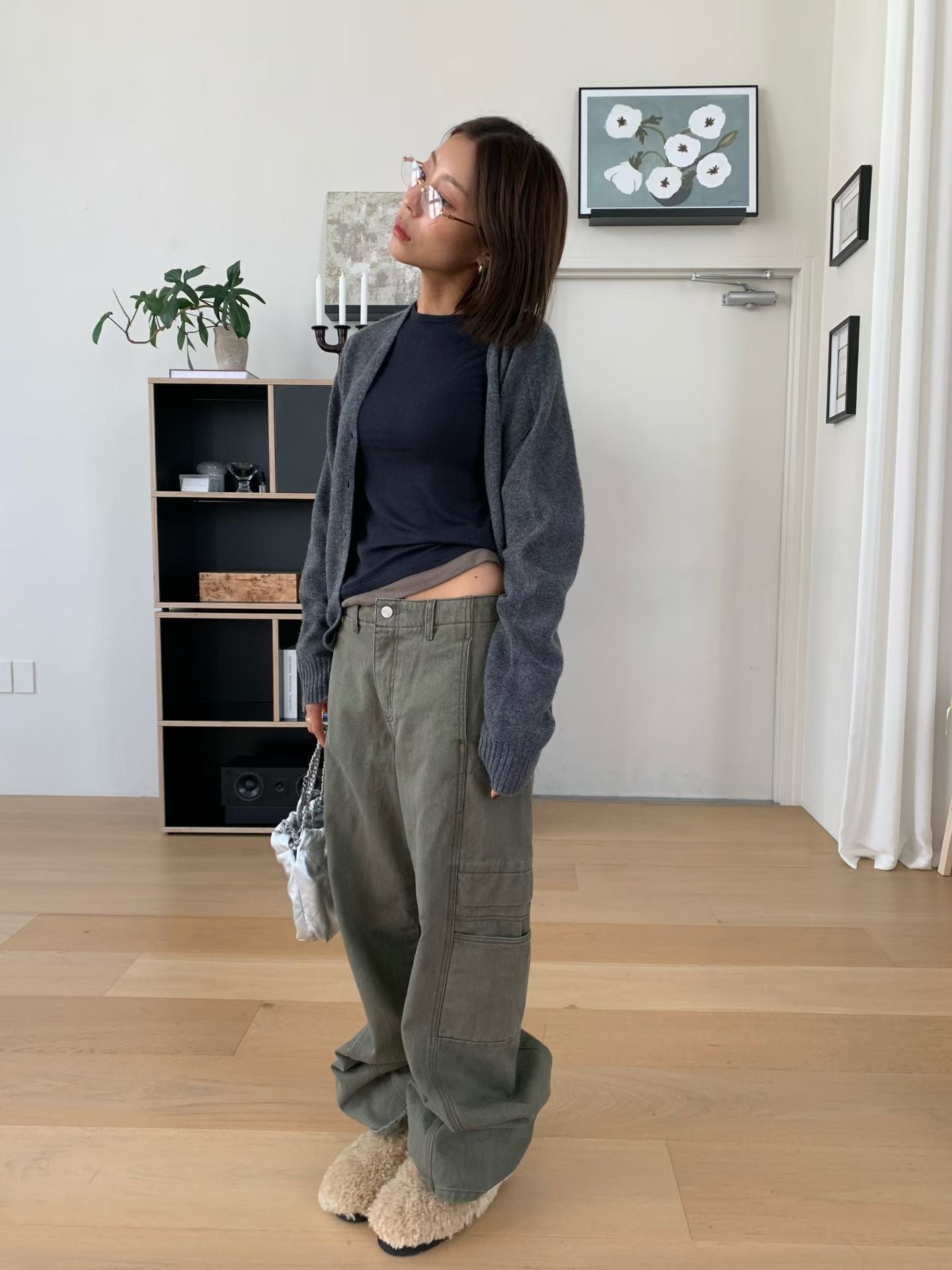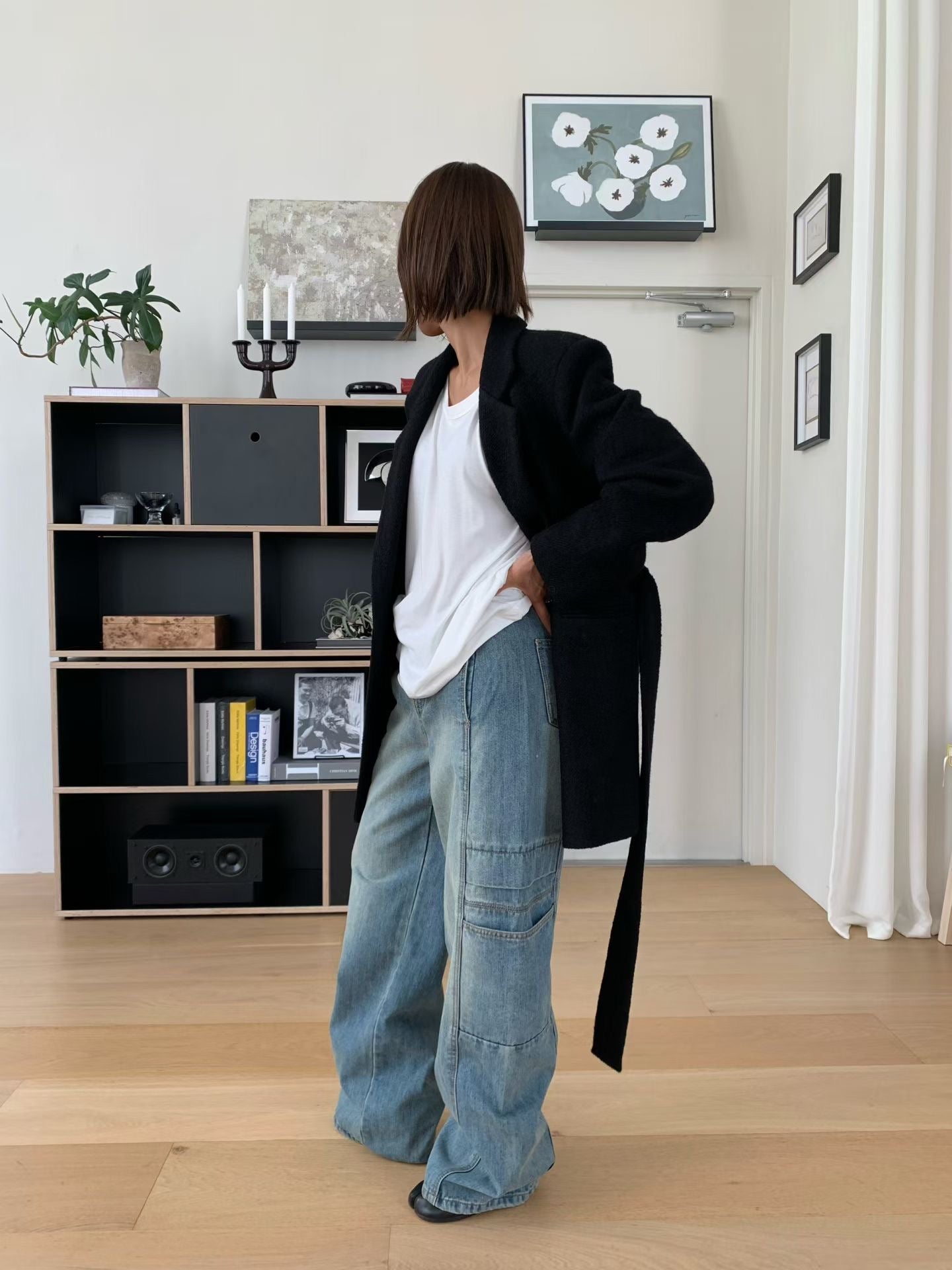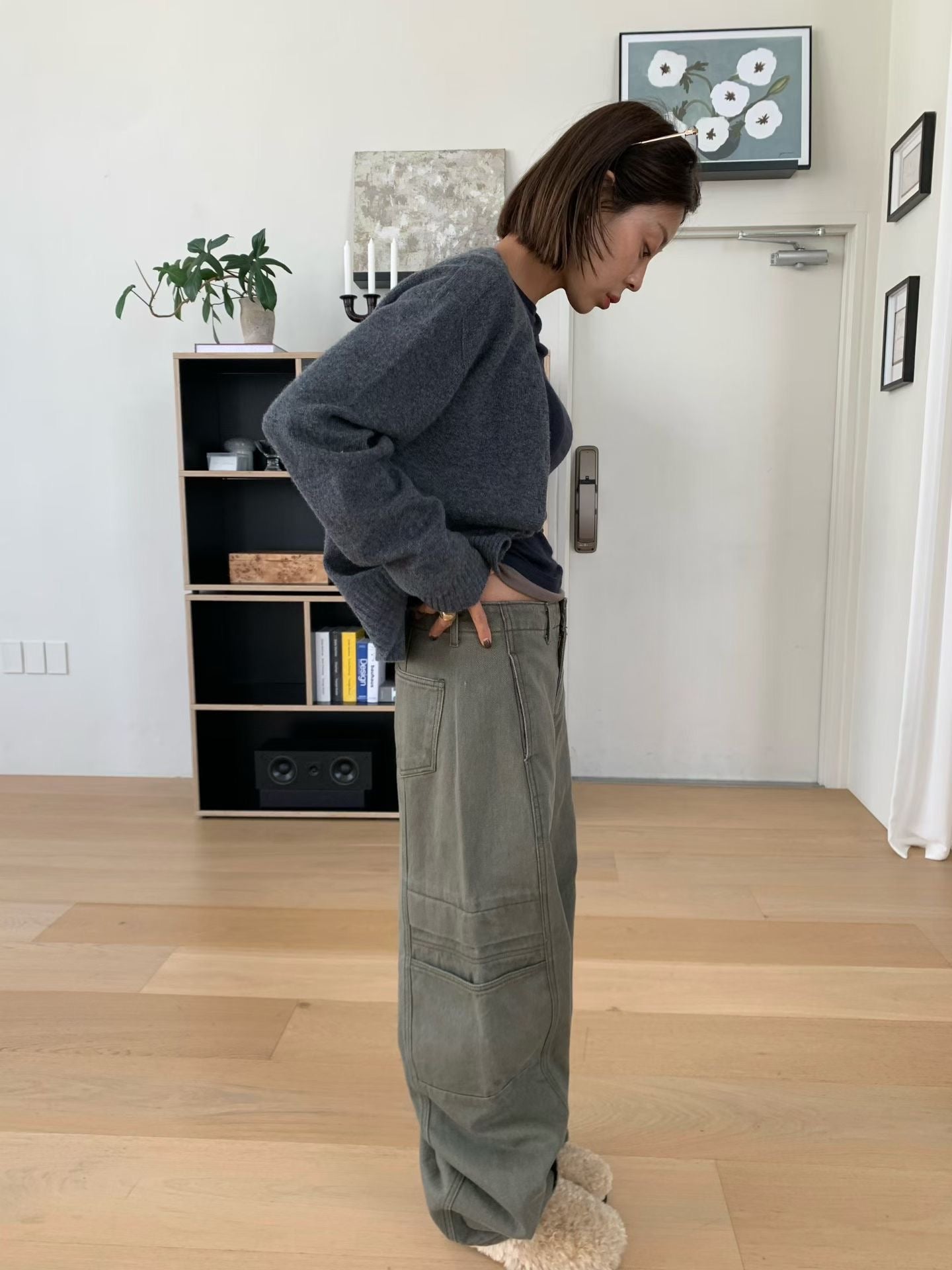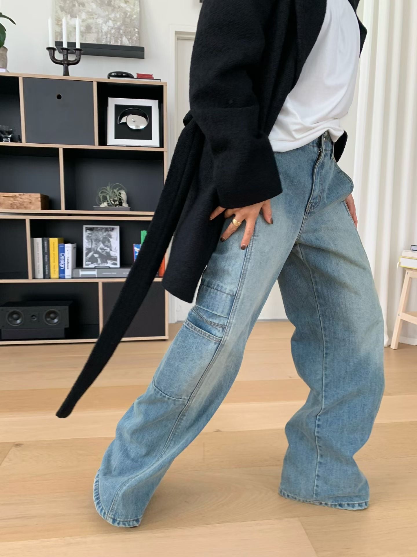 設計亮點與版型: 褲身採用極度寬鬆的闊腿剪裁,從腰部自然垂墜,充滿隨性不羈的氛圍。獨特的側邊大口袋設計,為整體注入了實用機能感和時髦的工裝氣息。褲子的水洗處理呈現出復古的年代感,線條拼接設計更強化了褲型的立體度。