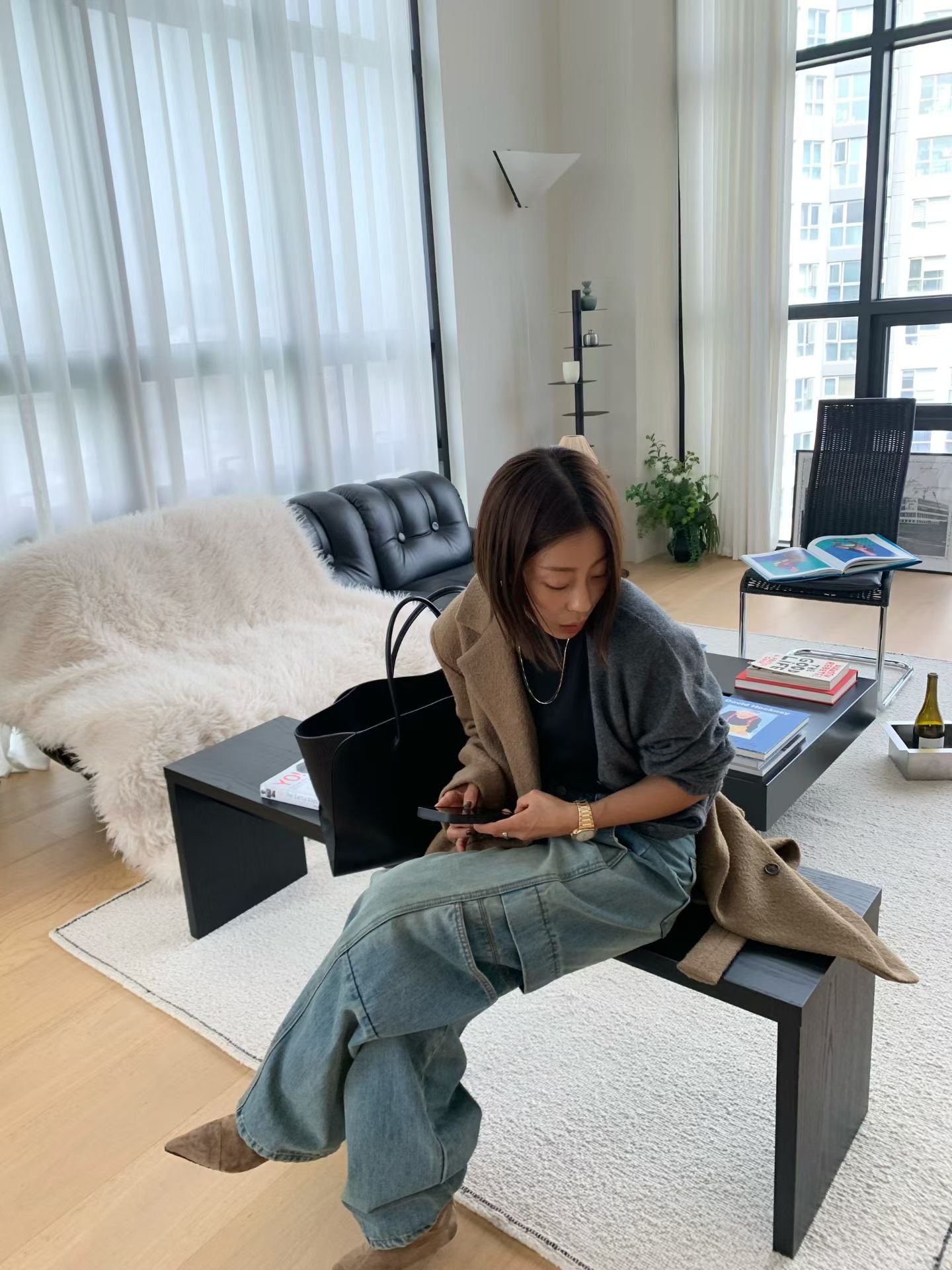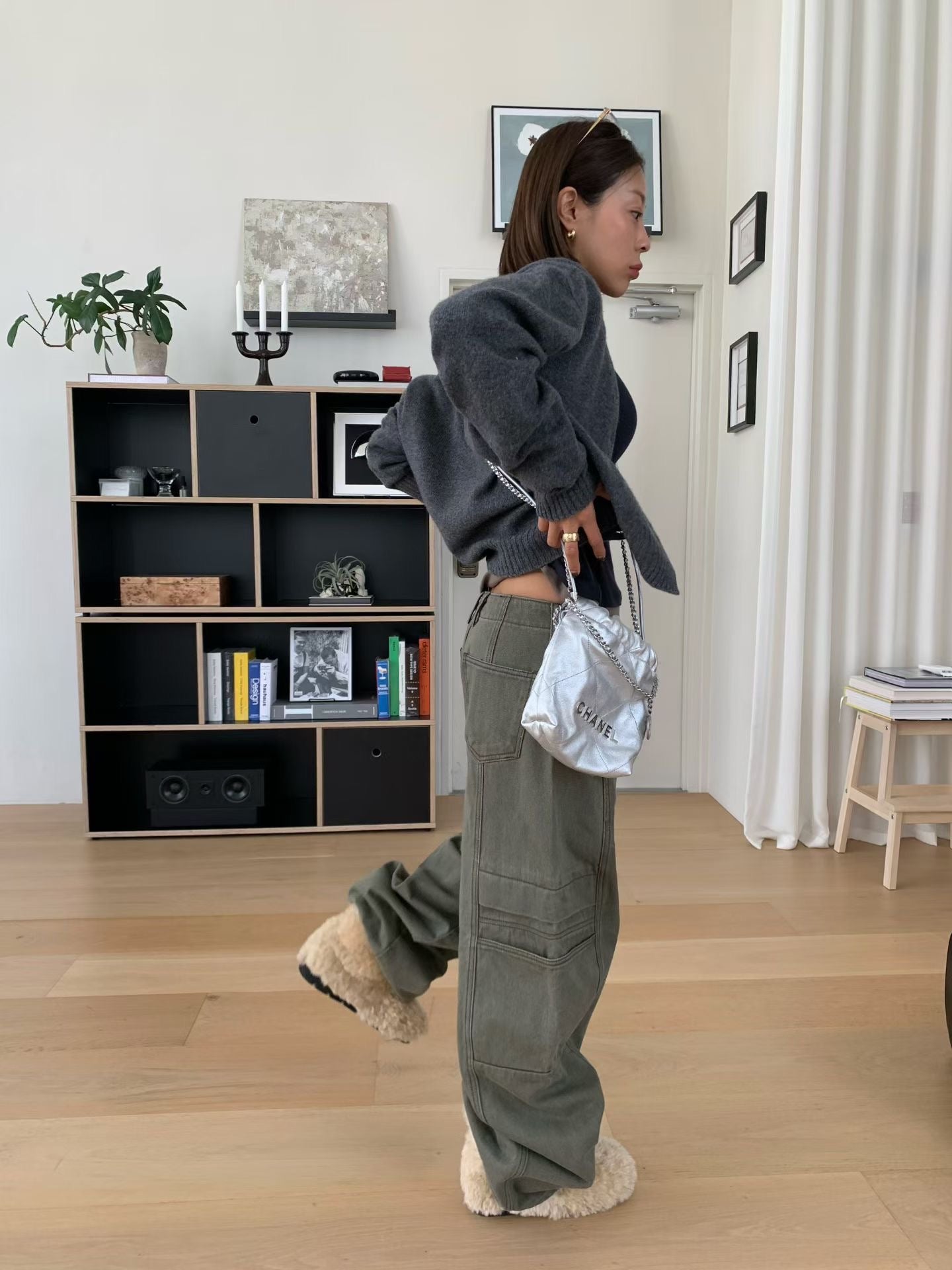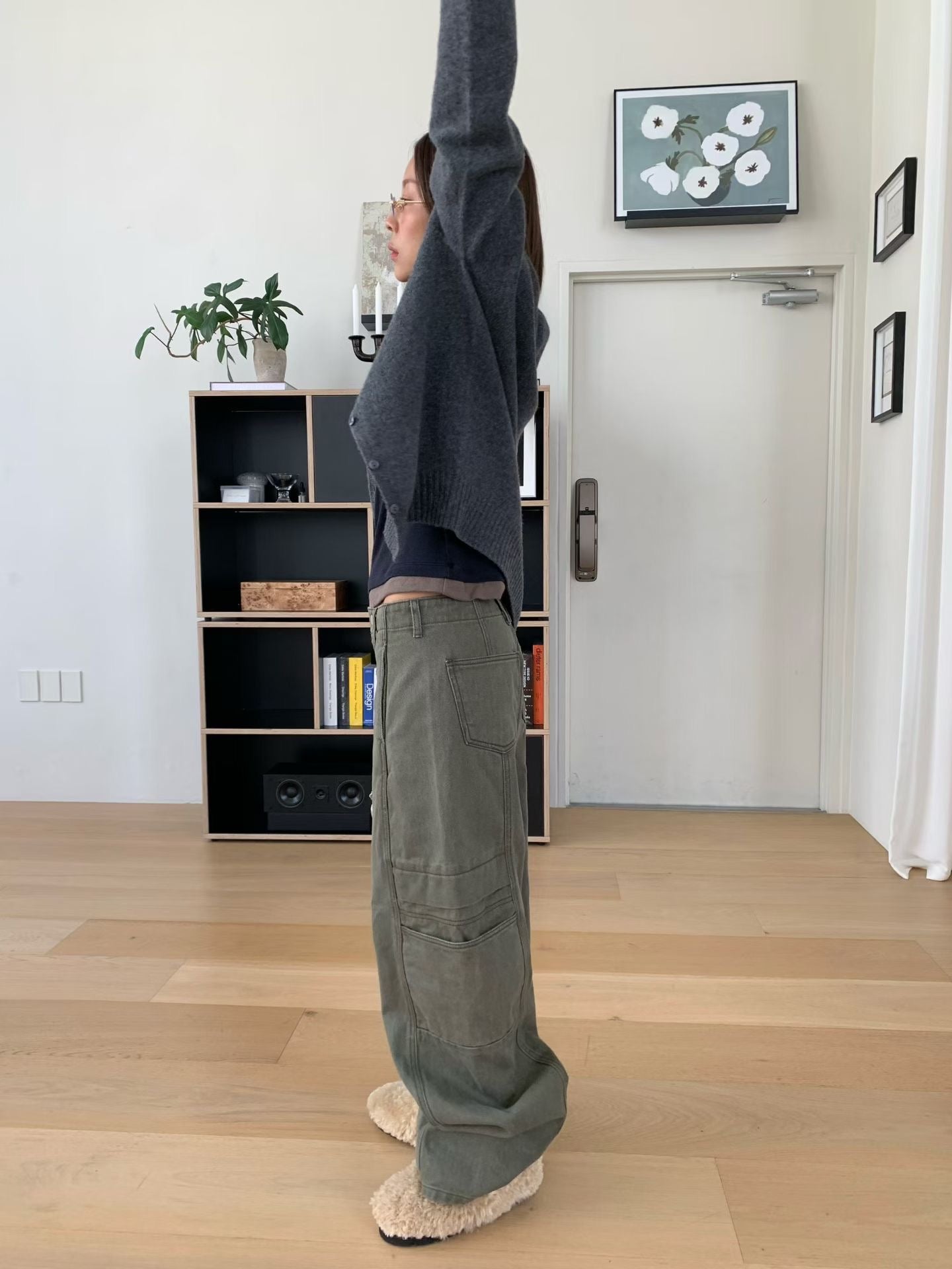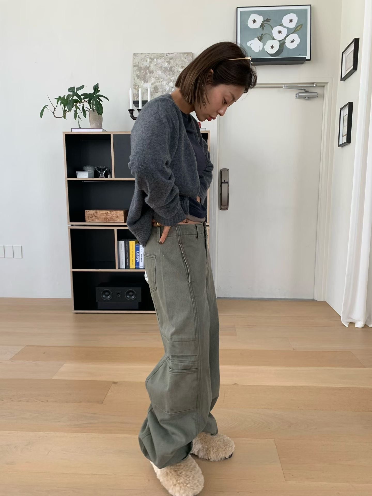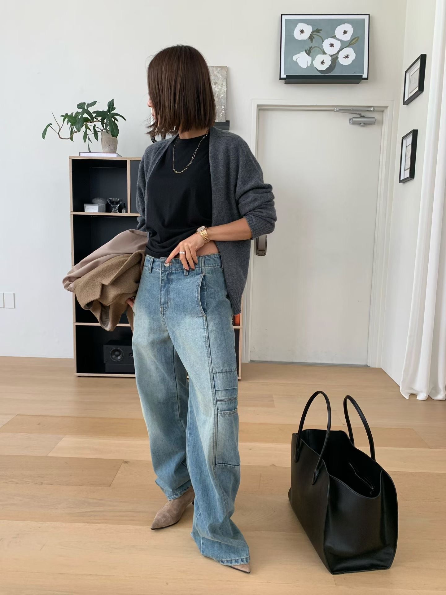 設計亮點與版型: 褲身採用極度寬鬆的闊腿剪裁,從腰部自然垂墜,充滿隨性不羈的氛圍。獨特的側邊大口袋設計,為整體注入了實用機能感和時髦的工裝氣息。褲子的水洗處理呈現出復古的年代感,線條拼接設計更強化了褲型的立體度。