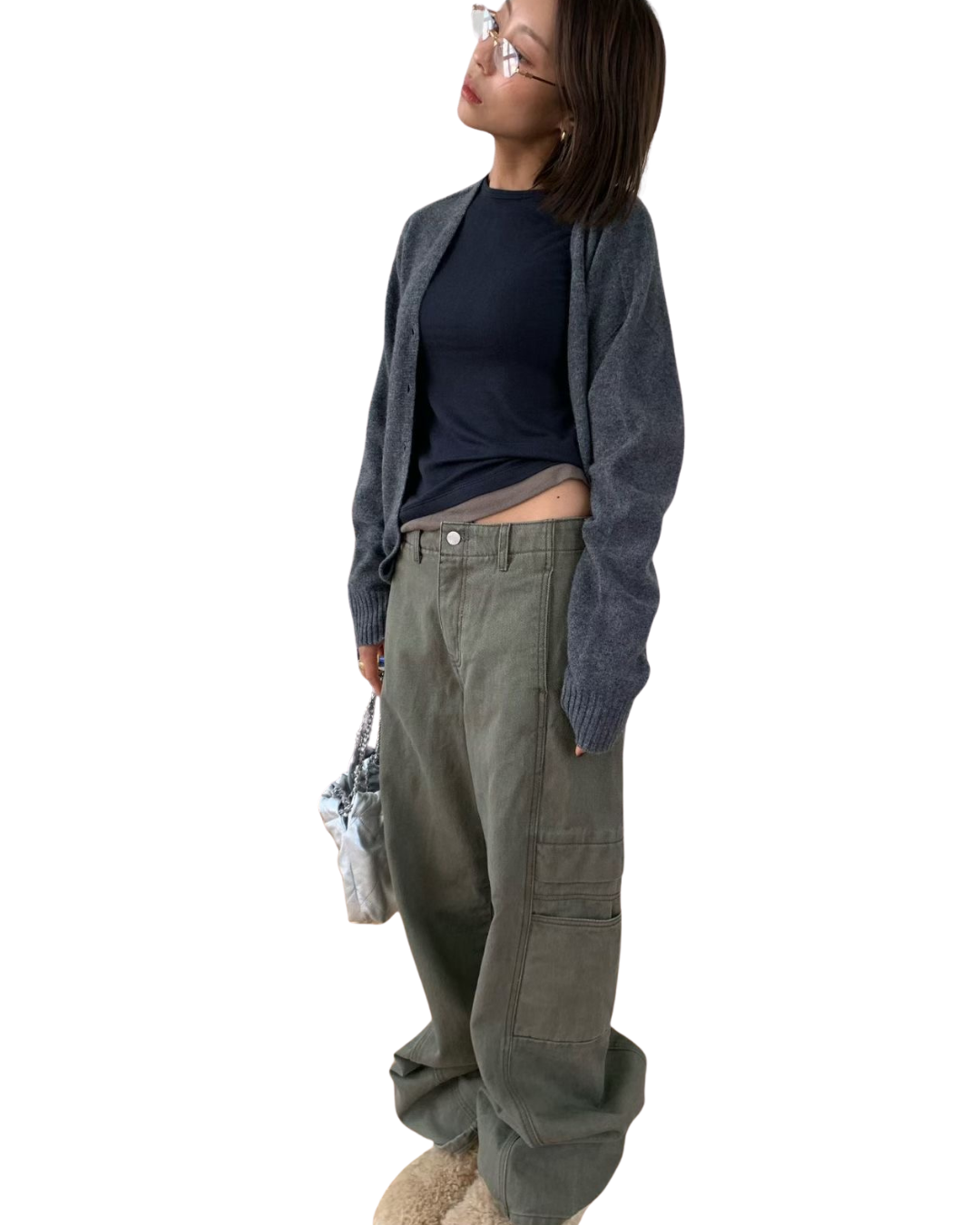 設計亮點與版型: 褲身採用極度寬鬆的闊腿剪裁,從腰部自然垂墜,充滿隨性不羈的氛圍。獨特的側邊大口袋設計,為整體注入了實用機能感和時髦的工裝氣息。褲子的水洗處理呈現出復古的年代感,線條拼接設計更強化了褲型的立體度。