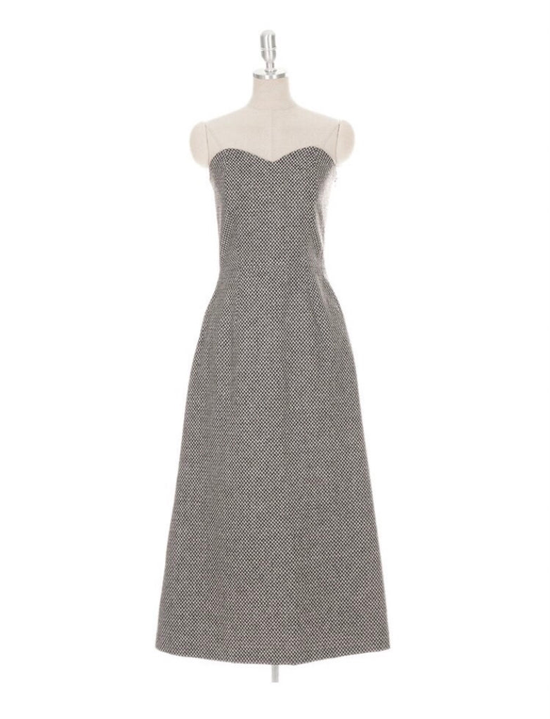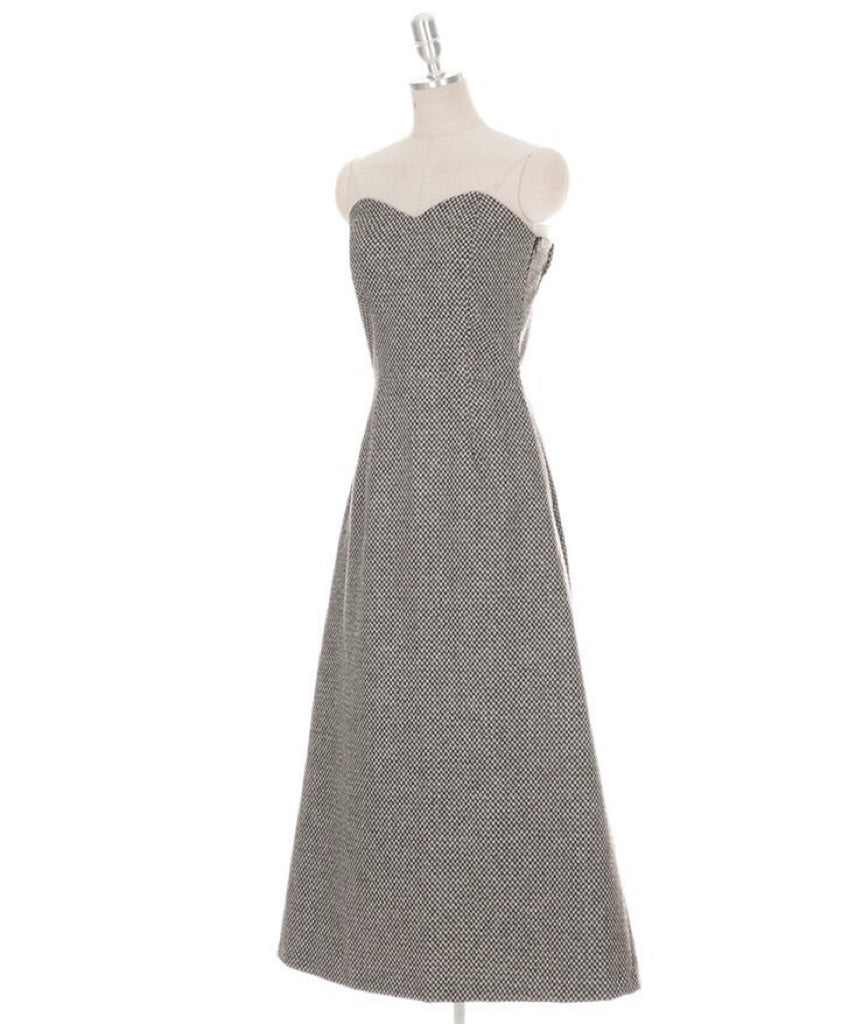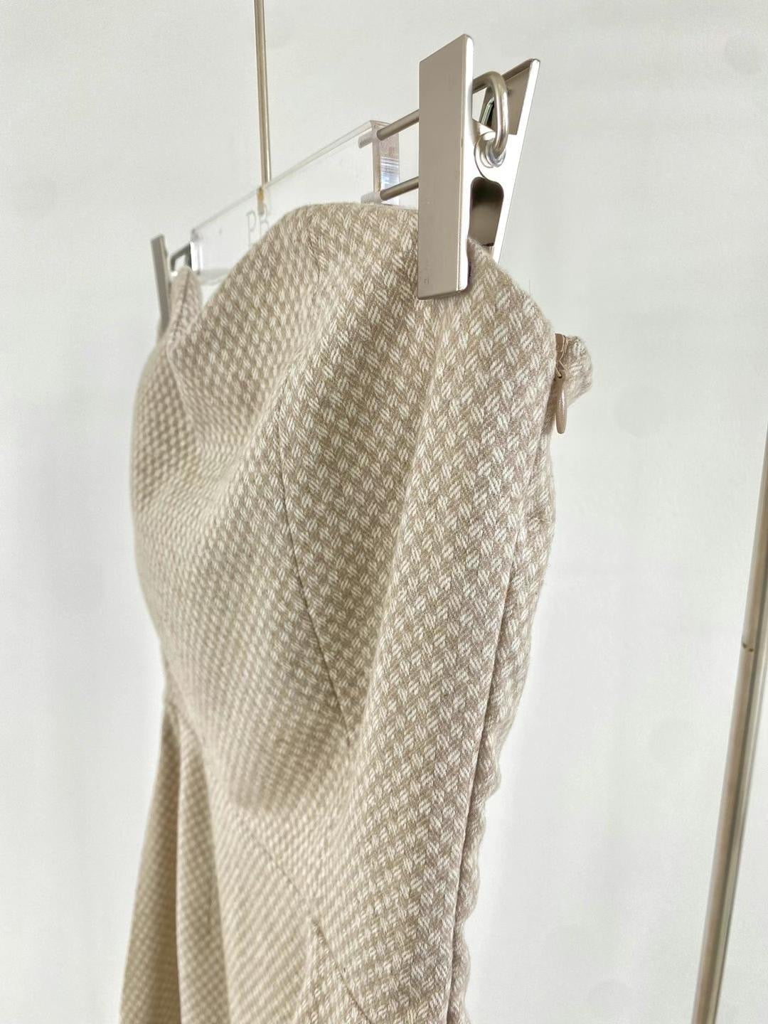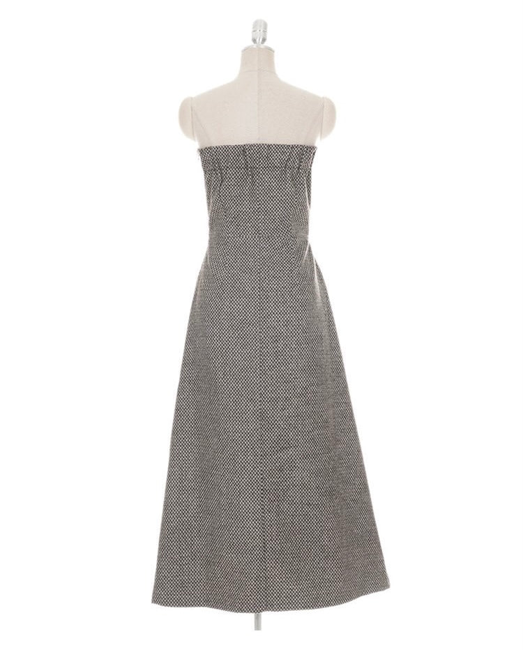 設計與質感: 洋裝採用溫暖舒適的羊毛混紡面料,質感細膩挺括,輕鬆打造優雅廓形。最具特色的心形抹胸領口,巧妙地修飾頸部線條與臉型,展現迷人女性魅力。裙身設計為修身腰線搭配寬喇叭形下擺,不僅能突顯纖細腰身,A字形裙襬更能完美遮蓋腿部線條,達到顯瘦效果。