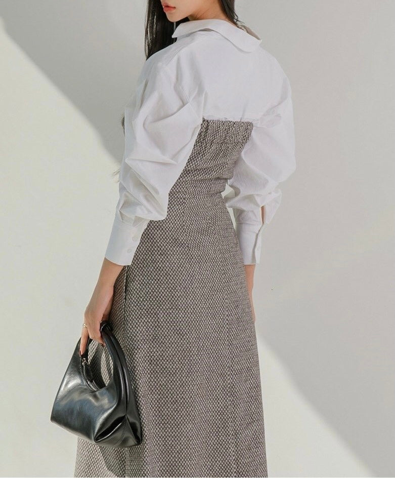 穿搭與舒適: 中長裙款搭配內置襯裡,確保了穿著的舒適度與安心感。側邊拉鍊設計方便穿脫。這款連衣裙是秋冬疊穿的理想單品,無論是內搭貼身的高領衫、長袖襯衫,或外搭西裝外套,都能輕鬆轉換風格。