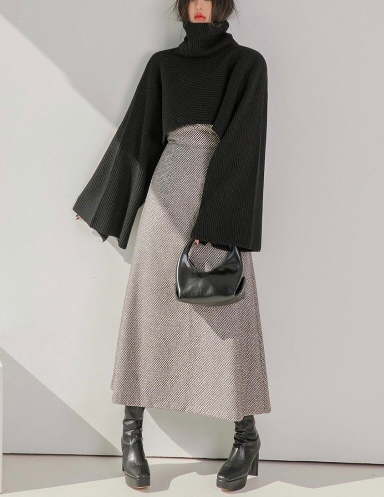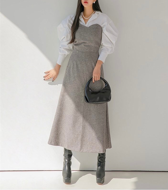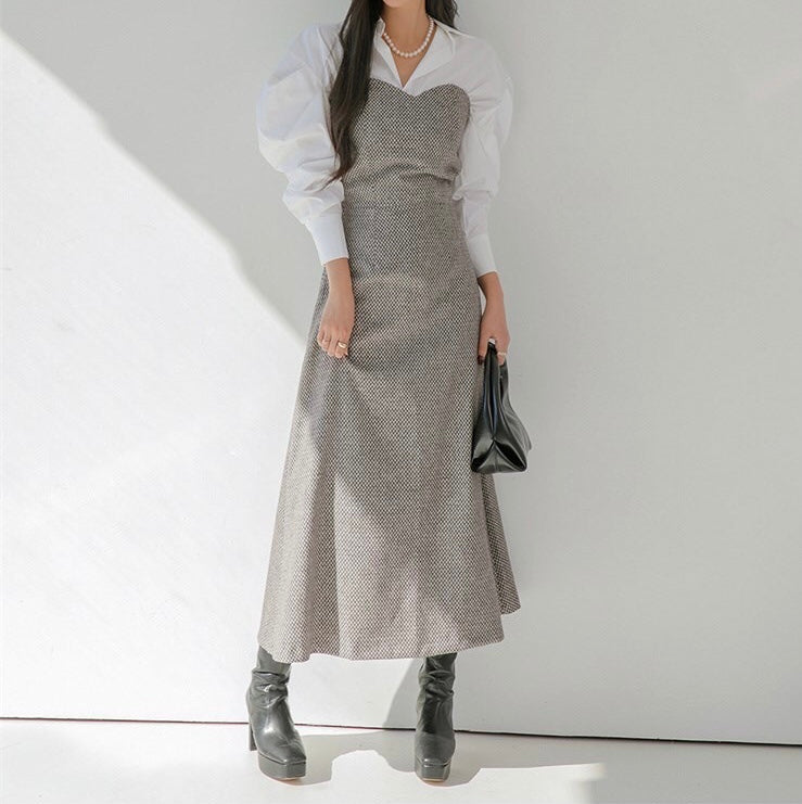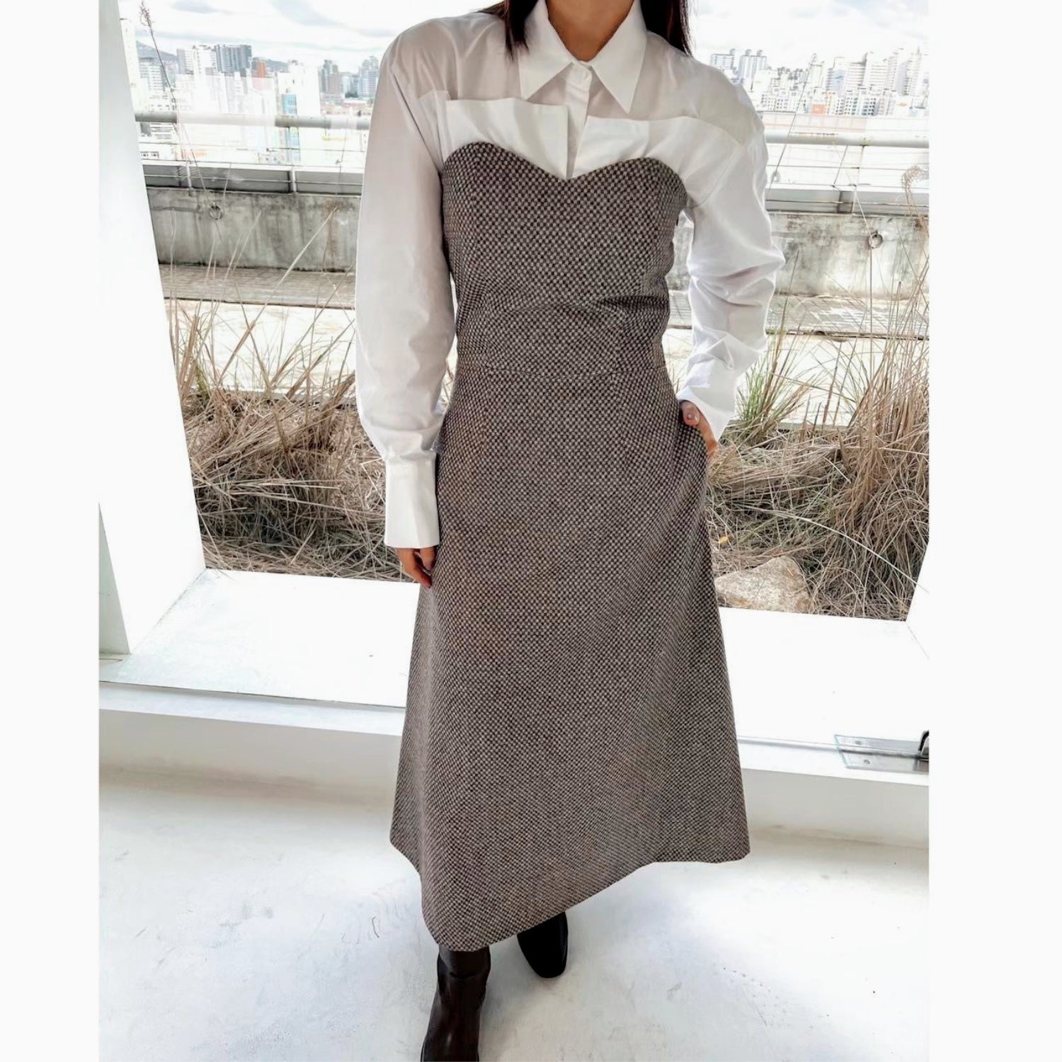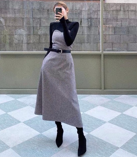DS11178-韓圍復古優雅心形領羊毛混紡抹胸長裙 (Re-stock)
