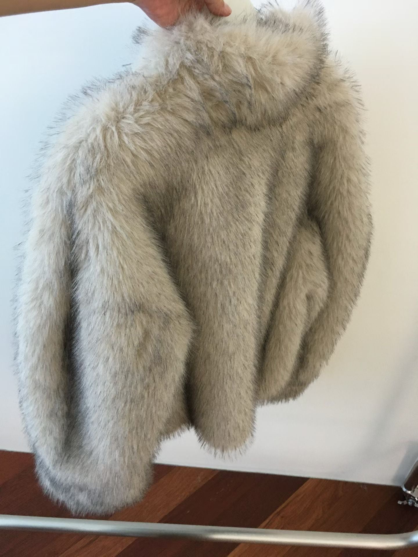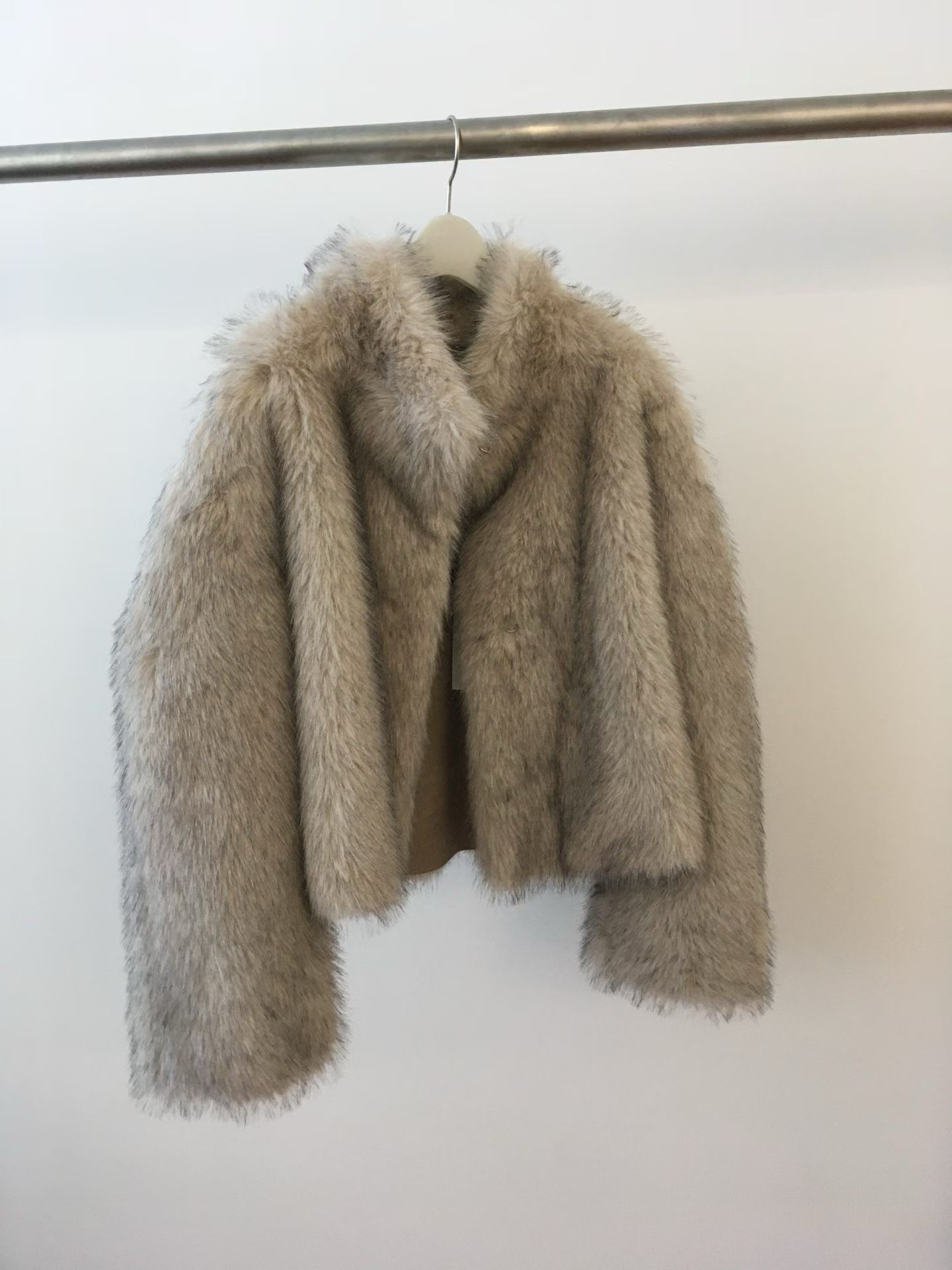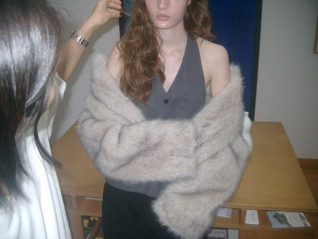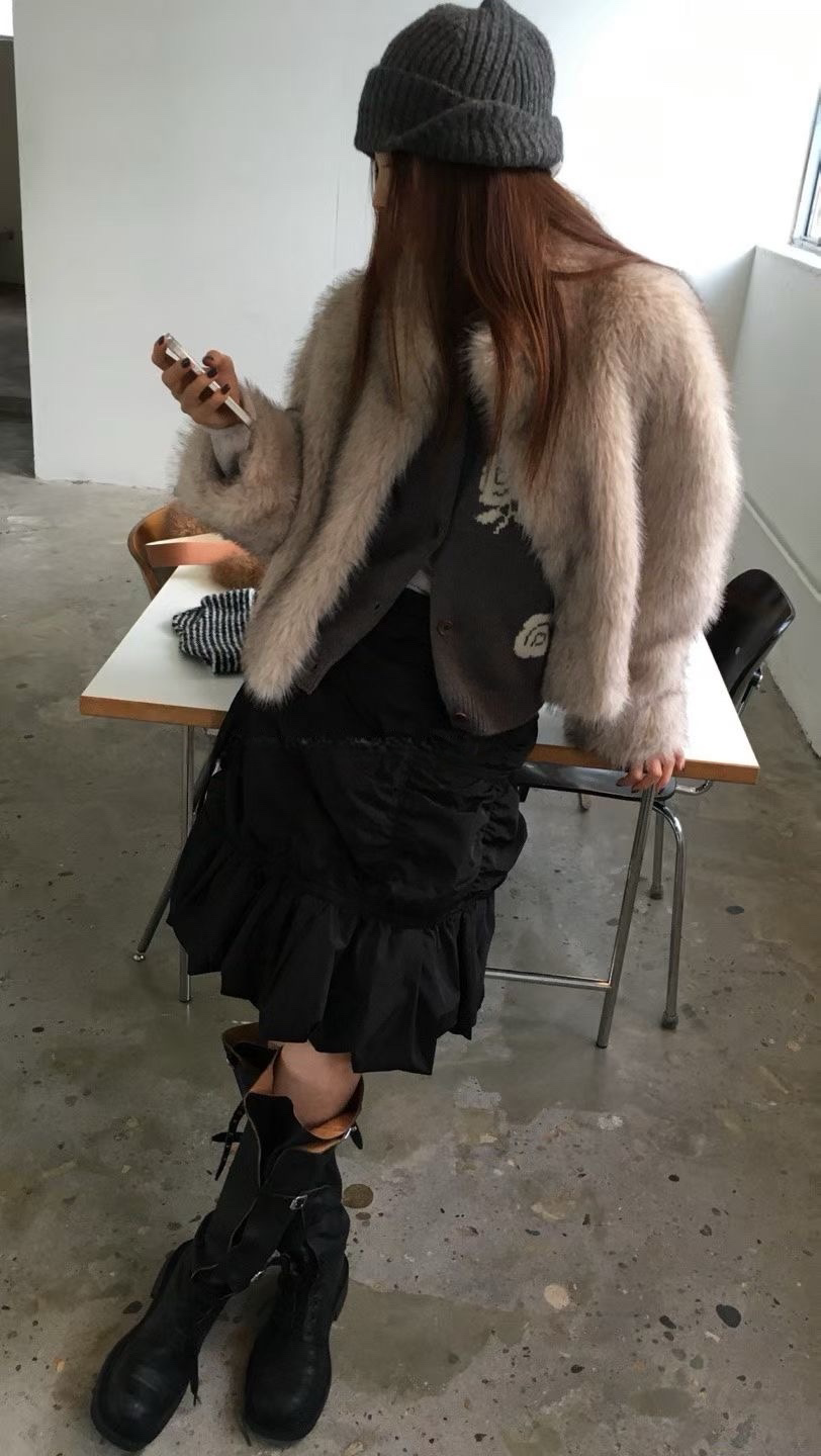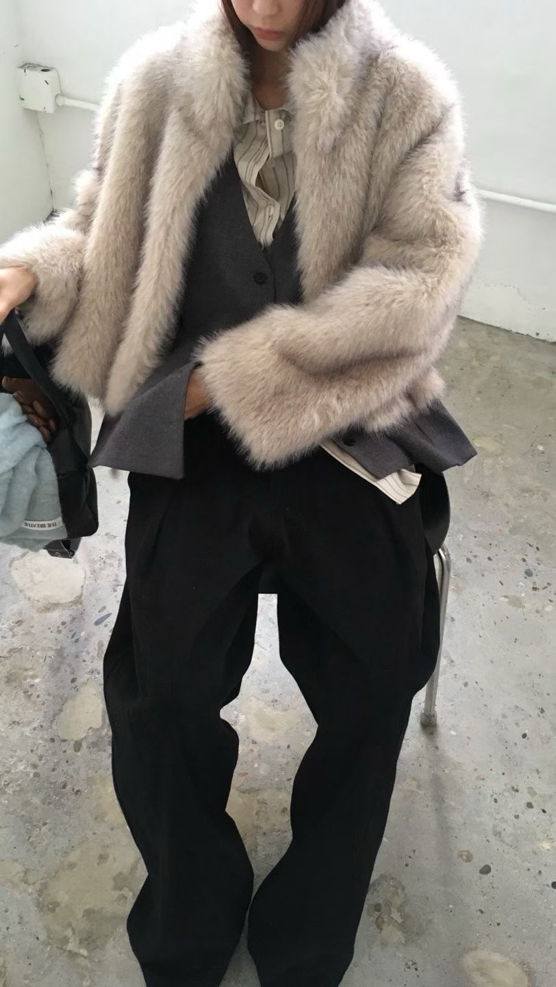 設計與質感: 選用高品質的環保仿皮草面料,毛絨豐厚蓬鬆,觸感柔軟細膩,擁有媲美真皮草的奢華光澤與保暖效果。外套採用寬鬆的短版剪裁,巧妙地拉高腰線,視覺上極為顯高顯瘦,同時避免了長款皮草的臃腫感。