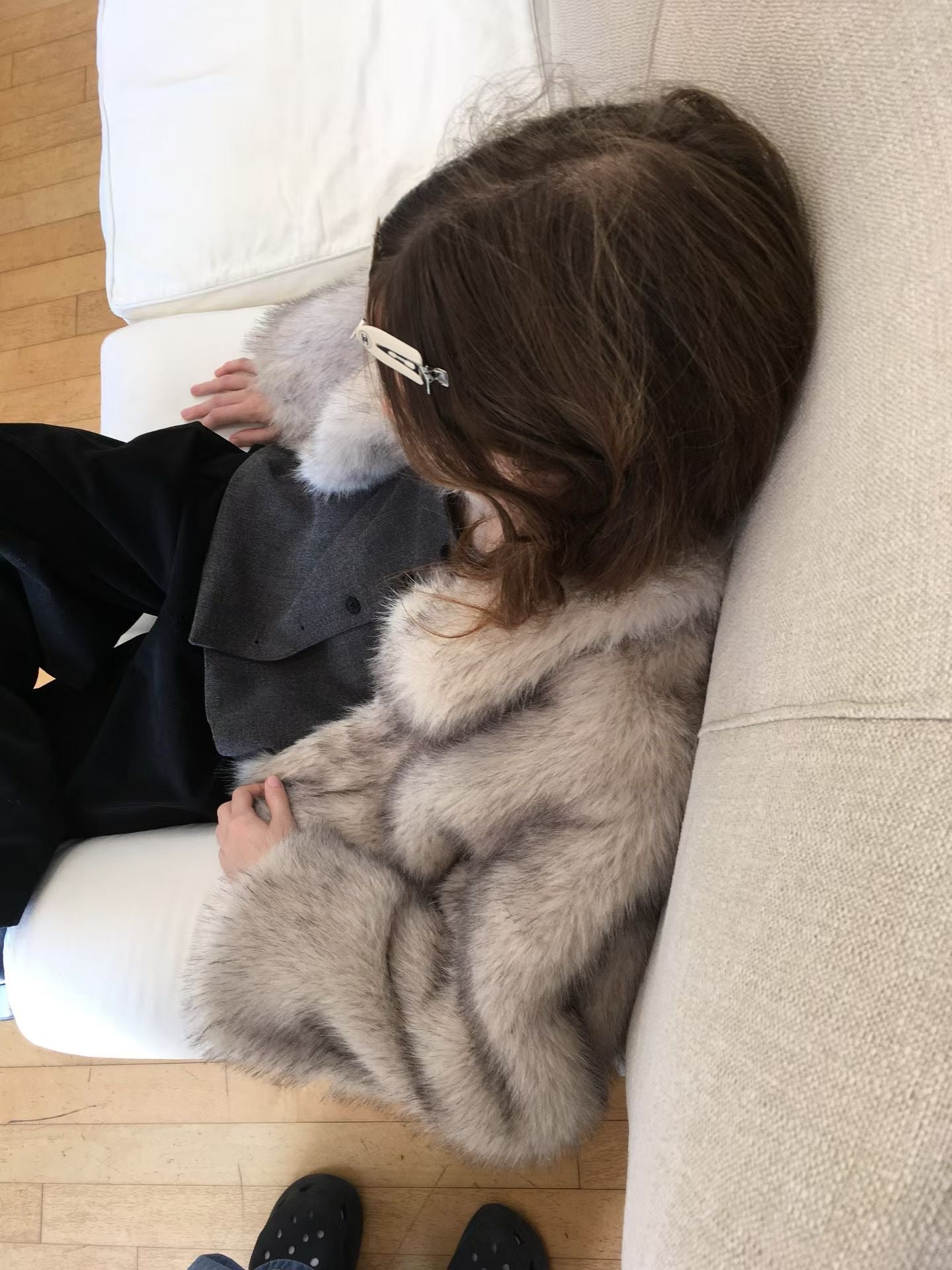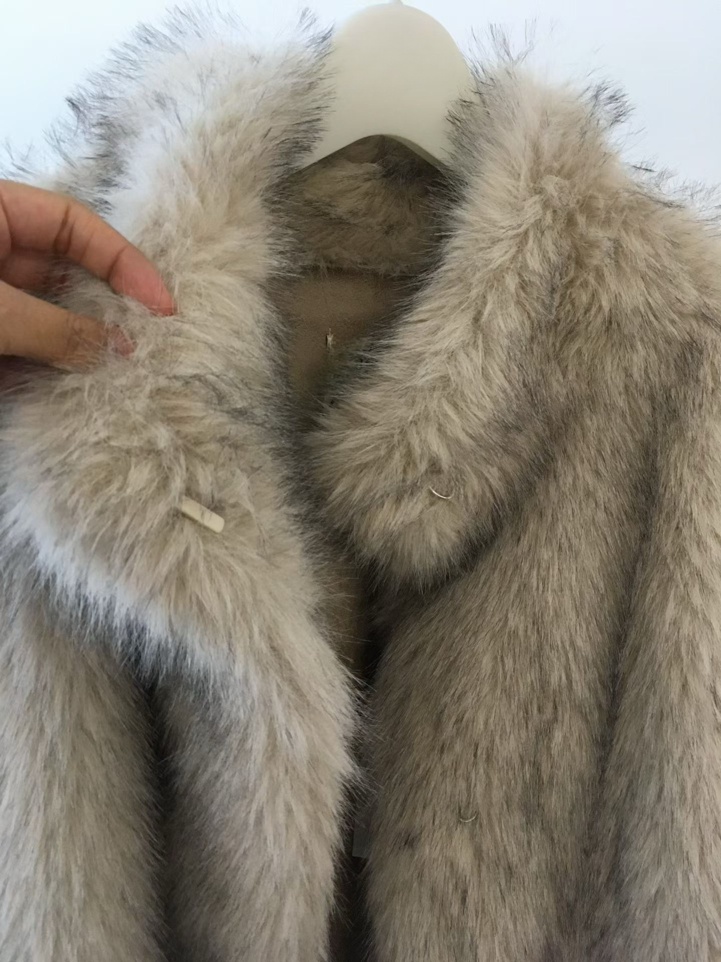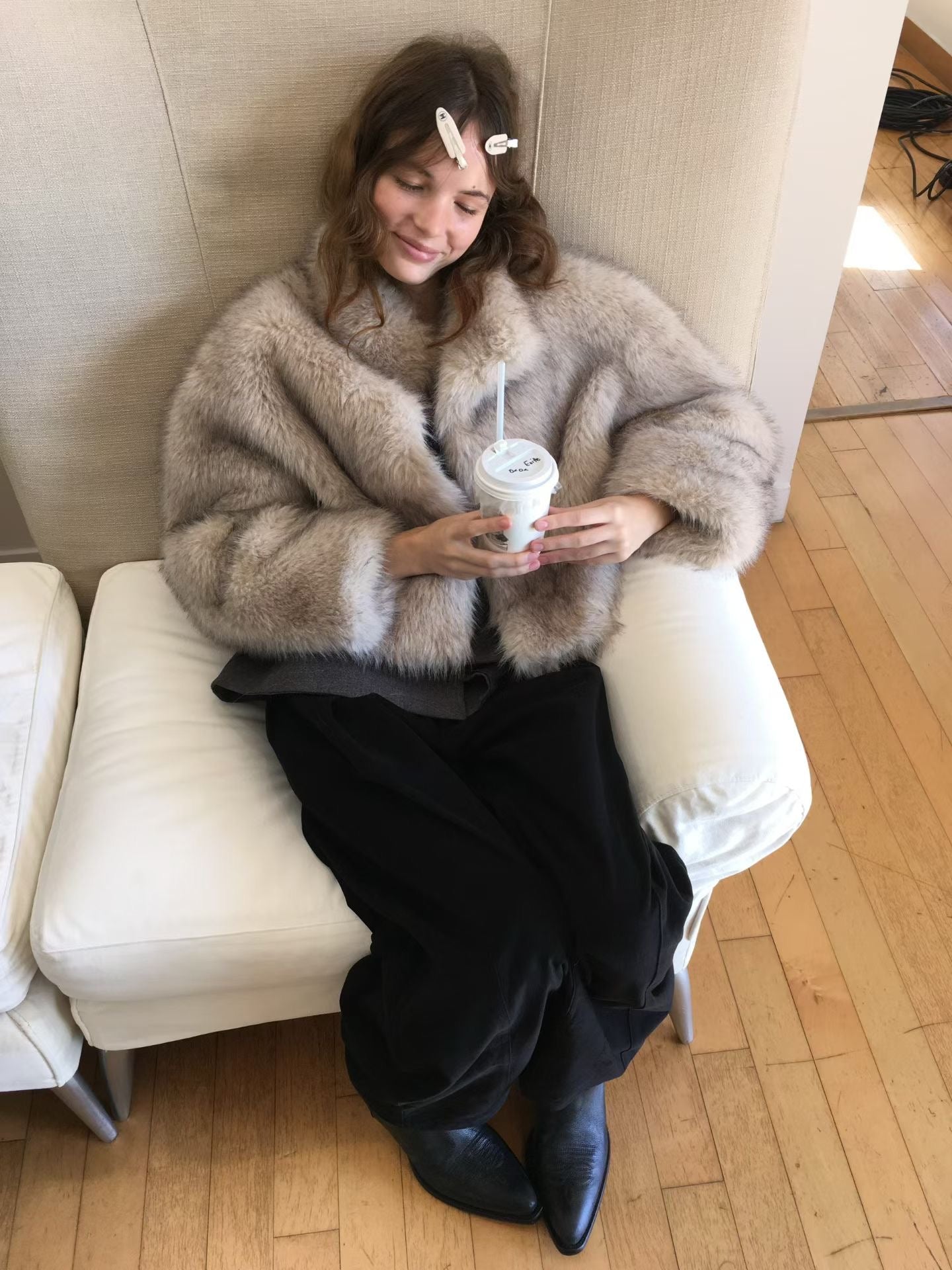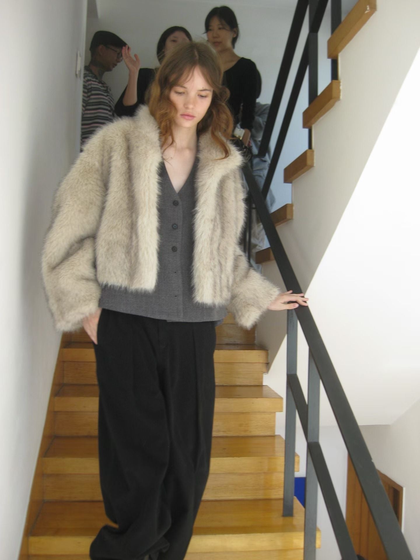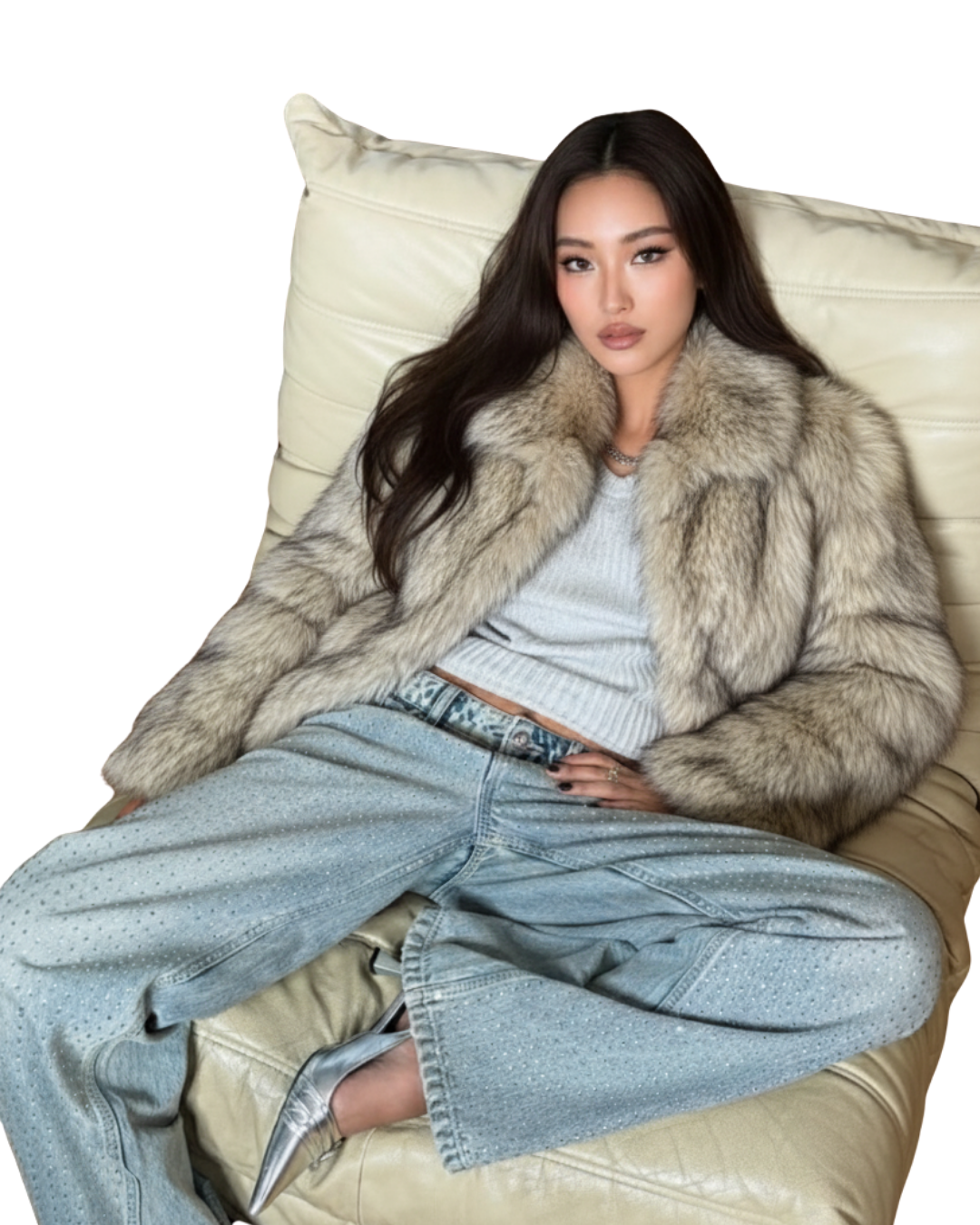 設計與質感: 選用高品質的環保仿皮草面料,毛絨豐厚蓬鬆,觸感柔軟細膩,擁有媲美真皮草的奢華光澤與保暖效果。外套採用寬鬆的短版剪裁,巧妙地拉高腰線,視覺上極為顯高顯瘦,同時避免了長款皮草的臃腫感。