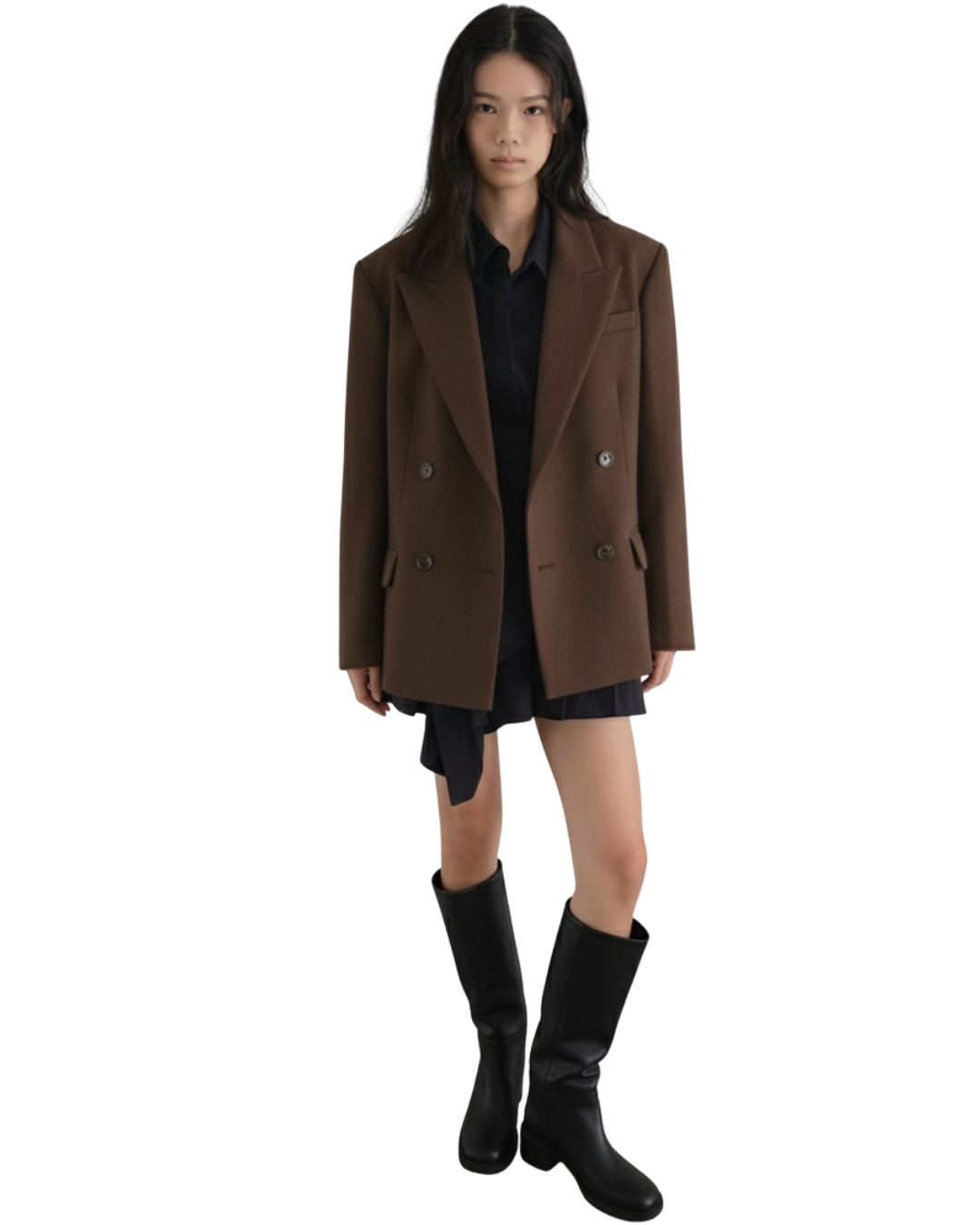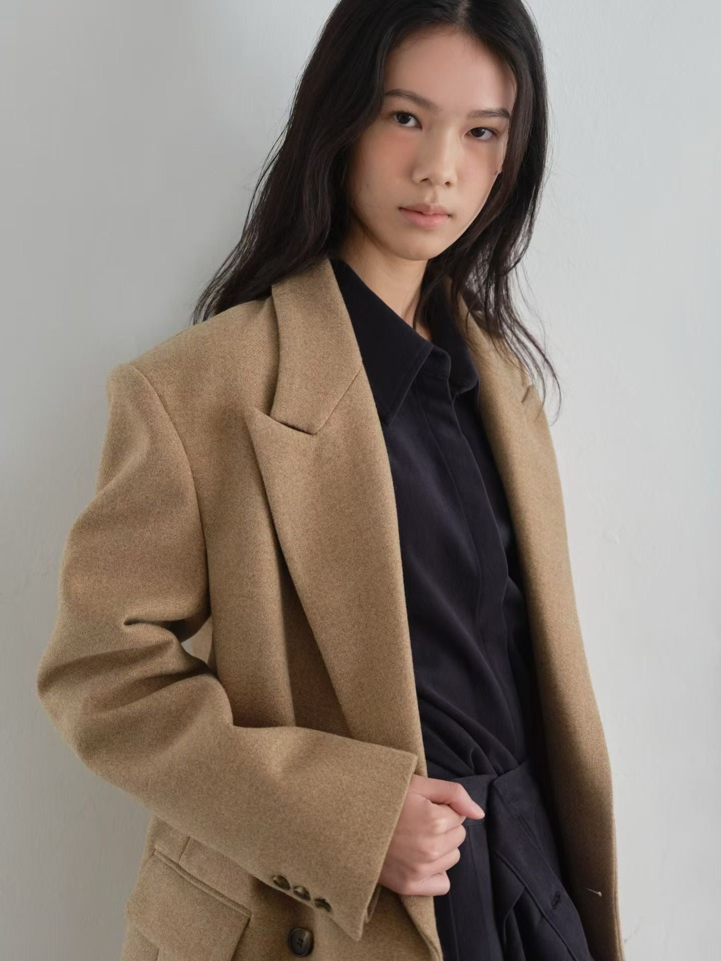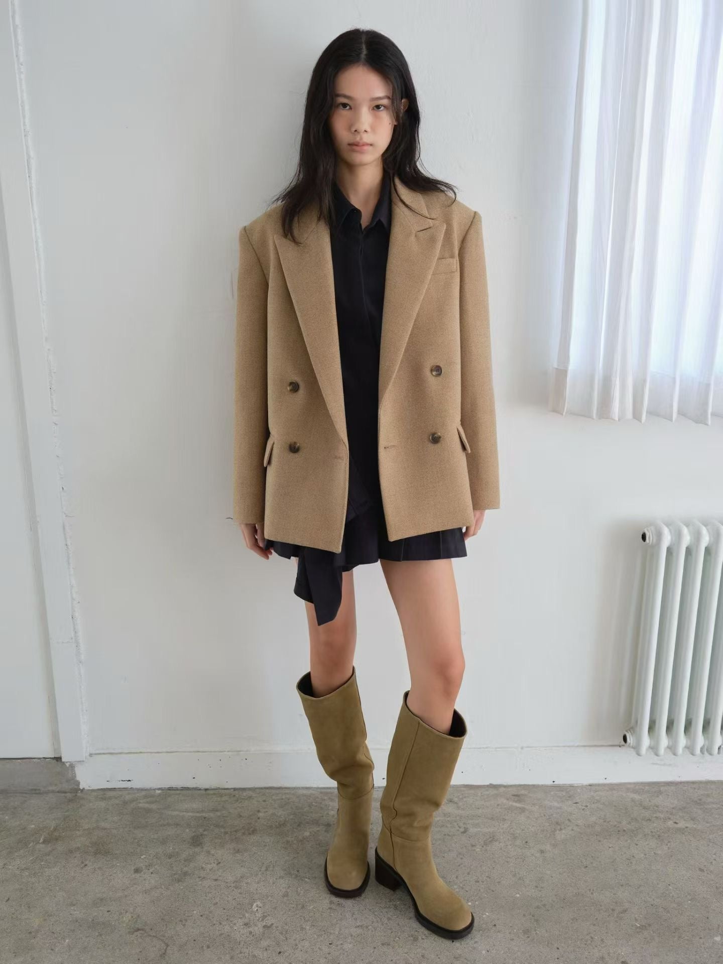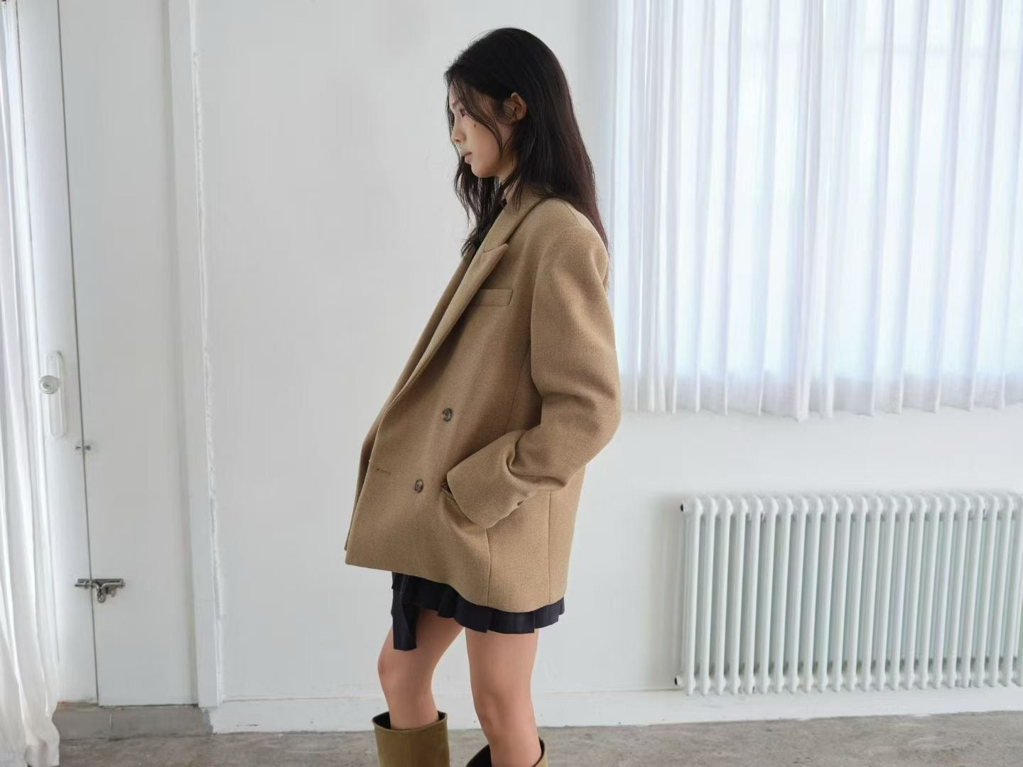 這款寬肩雙排釦毛呢西裝外套,是為追求強大氣場與秋冬溫暖感的你而設計。它將經典的西裝廓形與厚實的毛呢材質完美融合,輕鬆穿出毫不費力的韓系高級感。